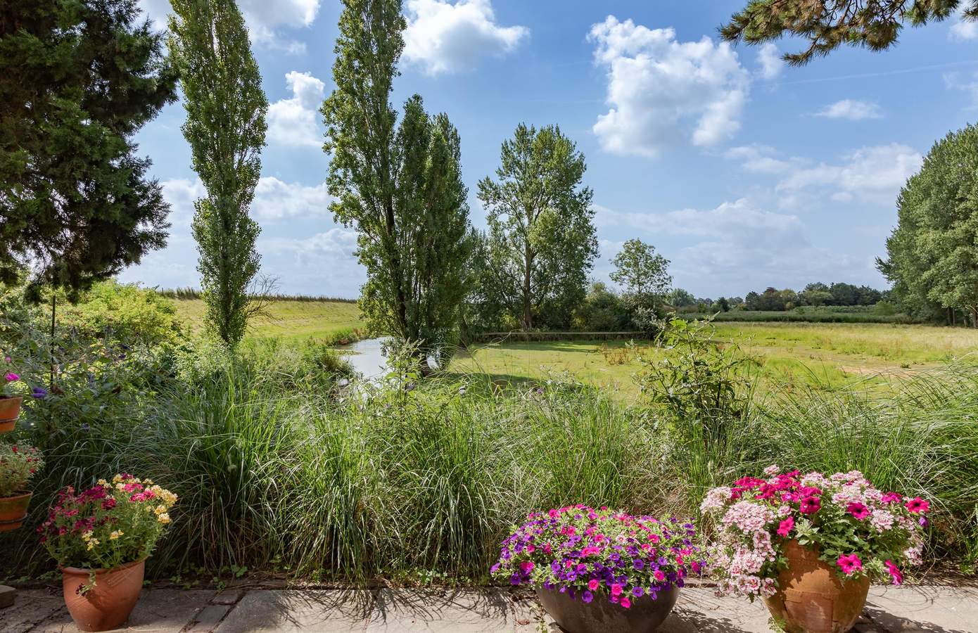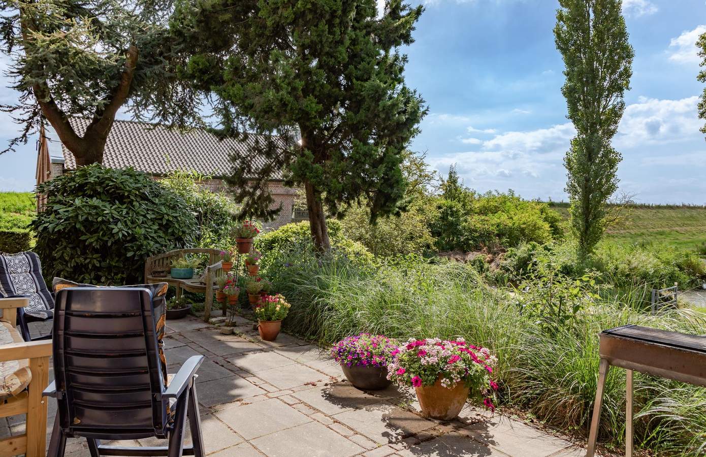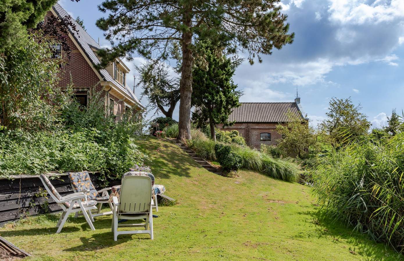 Binnen is het al prachtig, maar het exterieur maakt deze woning echt compleet. Aan de voorzijde is er ruimte voor twee auto’s en een laadpaal. Recentelijk is er een nieuwe septictank geïnstalleerd in de voortuin, wat de gelegenheid bood om de tuin opnieuw aan te planten met onder andere sierlijke hortensia’s. Rondom de woning zijn heerlijke terrassen gecreëerd aan zowel de zuid- als westkant, zodat u de hele dag van de zon kunt genieten. Omdat de woning hoog op een terp staat, ligt de tuin iets lager. Deze tuin mag gerust een park genoemd worden. Het groen is weelderig, met een natuurlijke vijver en een strak gazon, wat deze tuin tot een waar paradijs maakt. Hier zijn al menig feestjes gevierd, zonder dat buren daar last van hadden, dankzij de afgelegen ligging. Uw tuin wordt omgeven door weilanden met een aparte ontsluiting via de Meilag. Mocht u ook interesse in het weiland hebben, dan is dat bespreekbaar.