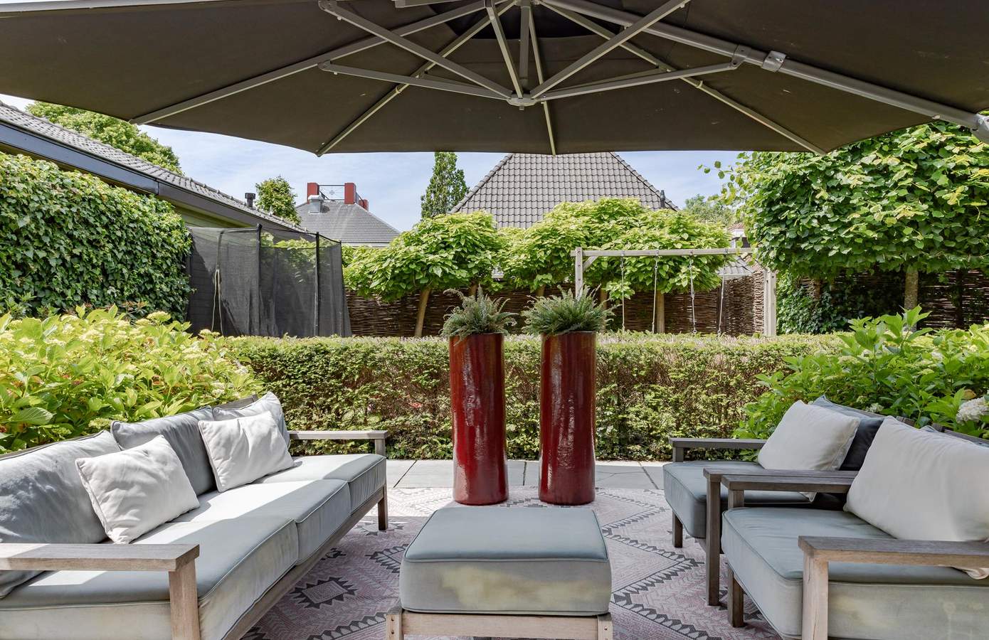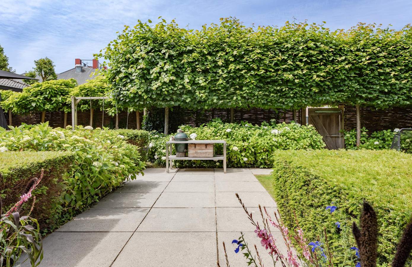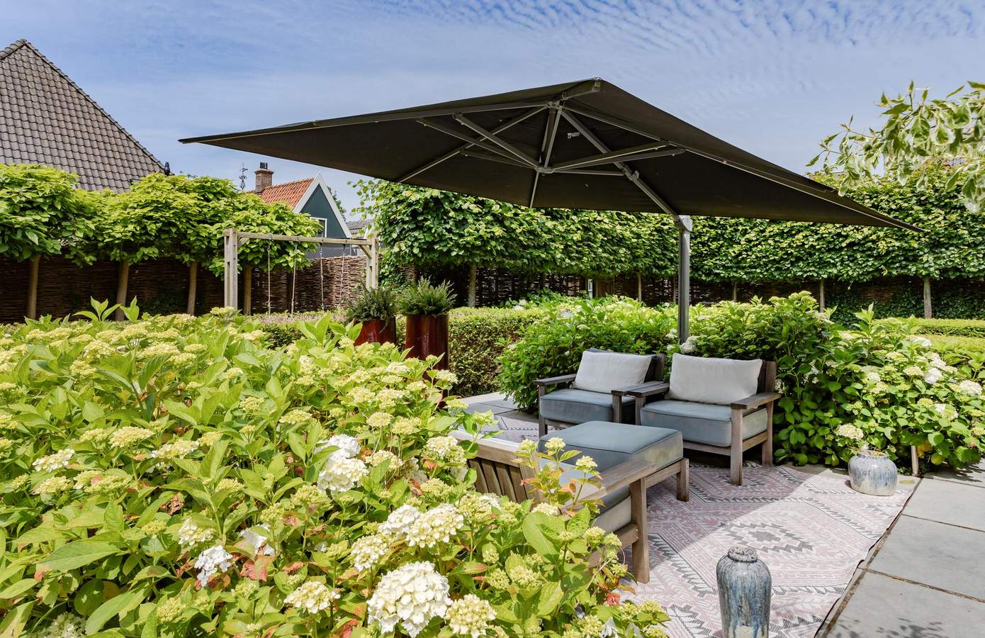 Deze verrassende stadstuin biedt veel privacy, en dat midden in het dorp! Vanuit de hal en de keuken zijn er openslaande deuren naar de tuin. De fijne veranda aan de woning is heerlijk vertoeven. Veel groenstruiken en bestrating maken de tuin onderhoudsvriendelijk en overzichtelijk. Achterin op het perceel bevinden zich twee privé parkeerplaatsen en een laadpaal.