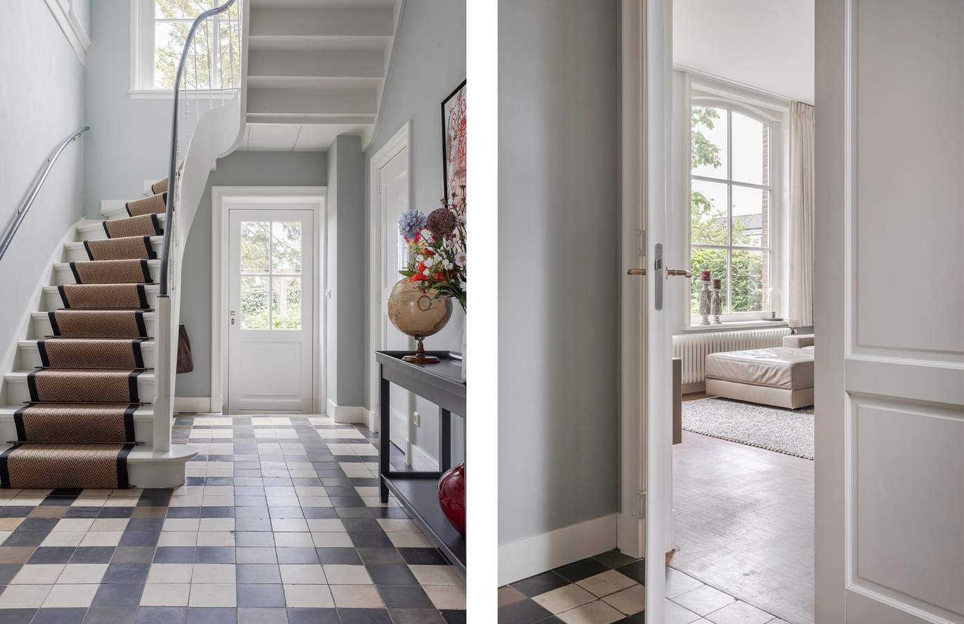 Via de stijlvolle entree betreedt u een imposante vestibule en hal, afgewerkt met een klassieke zwart-witte tegelvloer die direct de toon zet. Al bij binnenkomst proeft u de unieke sfeer van dit huis: karaktervol, verfijnd en met oog voor detail. Uw blik wordt als vanzelf getrokken naar het trappenhuis – statig en sierlijk, met witgeschilderde treden, elegante lijnen en een smaakvolle traploper. Deze trap is veel meer dan een doorgang naar boven; het is een architectonisch statement dat de grandeur van deze voormalige pastorie onderstreept.