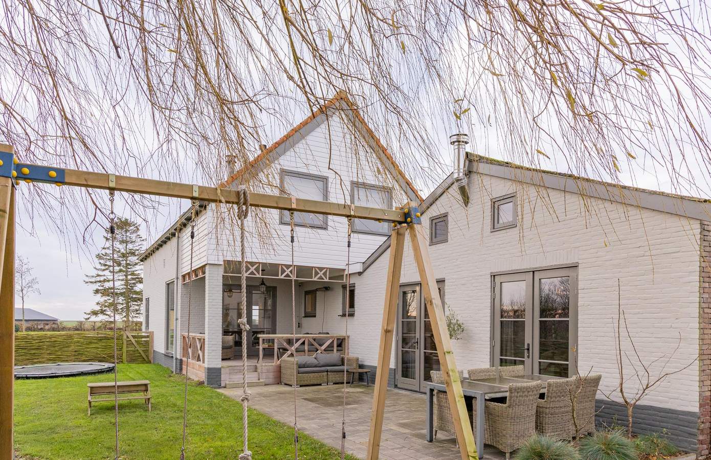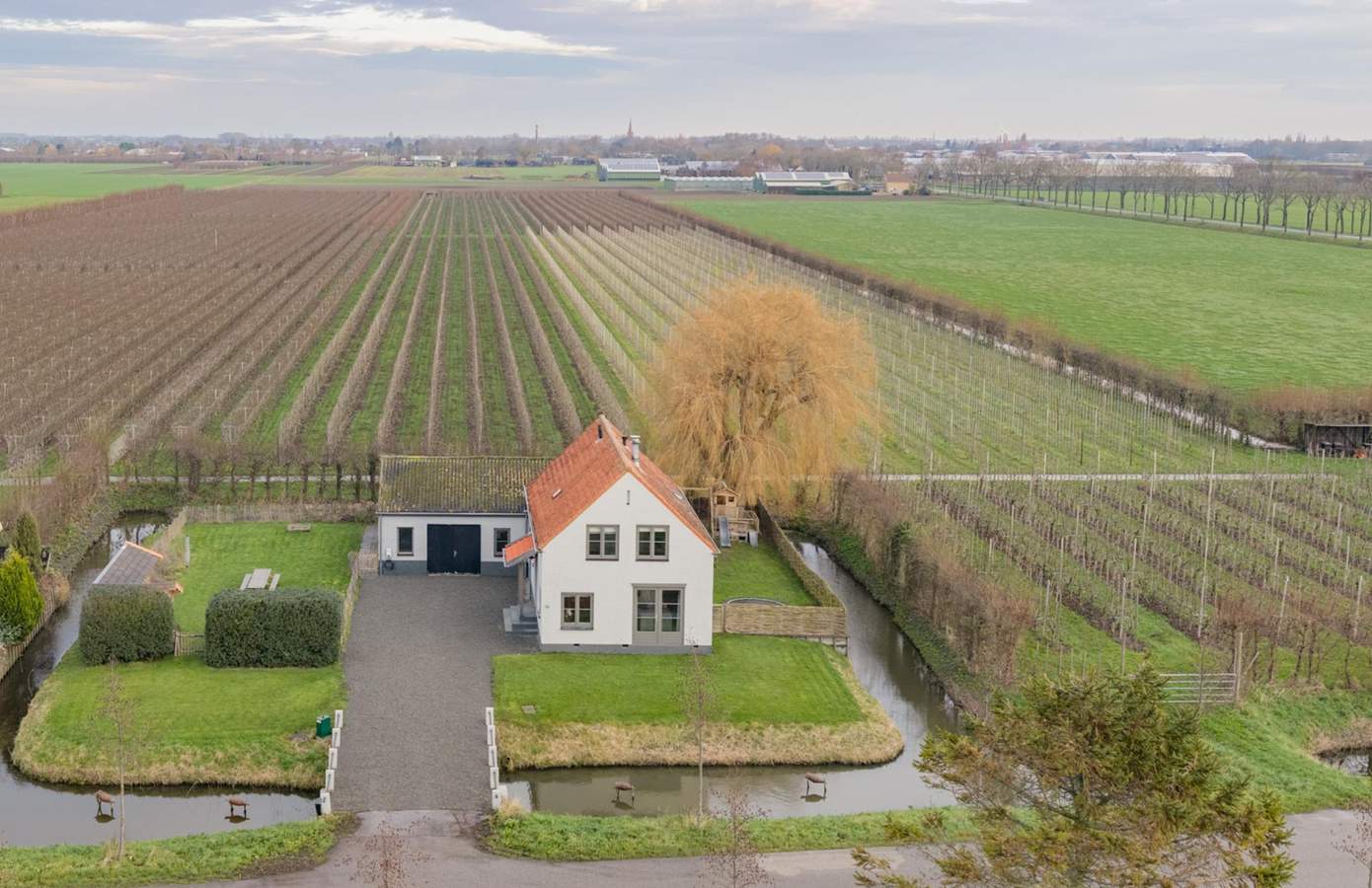De woning ligt op een eigen eiland, volledig omringd door water, wat niet alleen een bijzonder gevoel van vrijheid geeft, maar ook zorgt voor een natuurlijke begrenzing en privacy. Via de brug bereikt u de oprit, wat zeer recent is voorzien van nieuw grind. Rondom de woning ligt de tuin met een open, groen karakter en een prachtig uitzicht over de omliggende fruitboomgaarden en landerijen. De erfafscheidingen zijn uitgevoerd in natuurlijke materialen, zoals gevlochten wilgentenen, die perfect passen bij het landelijke karakter en zorgen voor beschutting zonder het uitzicht weg te nemen. Aan de achterzijde sluit de tuin fijnloos aan op de woning. Vanuit zowel de woonkamer als de eetkamer stapt u hier zo naar buiten. De veranda vormt een beschutte plek waar u al vroeg in het voorjaar en tot laat in het najaar kunt genieten van lange avonden, met zicht op het groen. Aansluitend ligt een ruim terras met voldoende plaats voor een grote eettafel. De tuin is royaal opgezet en biedt volop ruimte voor ontspanning en spel. Voor kinderen is het een waar paradijs, met speeltoestellen, een boomhut en volop gras om vrij te bewegen. Tegelijkertijd zijn er meerdere rustige hoekjes gecreëerd waar u zich kunt terugtrekken en kunt genieten van de serene rust. Aan de andere zijkant lig een stuk grasland waar kippen rond scharrelen en waar u ander kleinvee kunt houden. Een perceel waar u vrij woont, omringd door natuur, met alle ruimte om te leven, te genieten en tot rust te komen.
