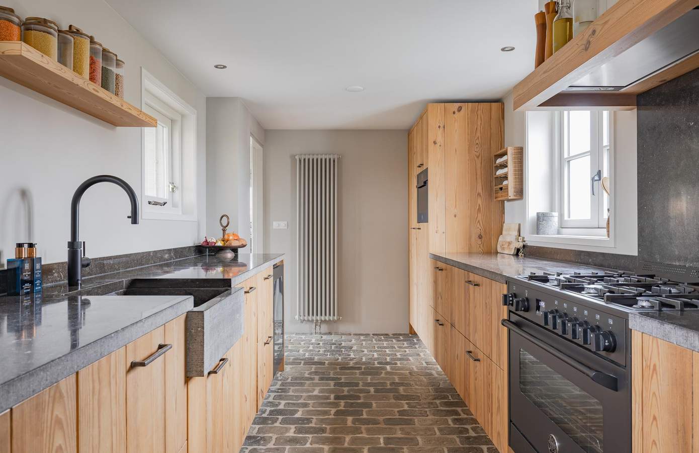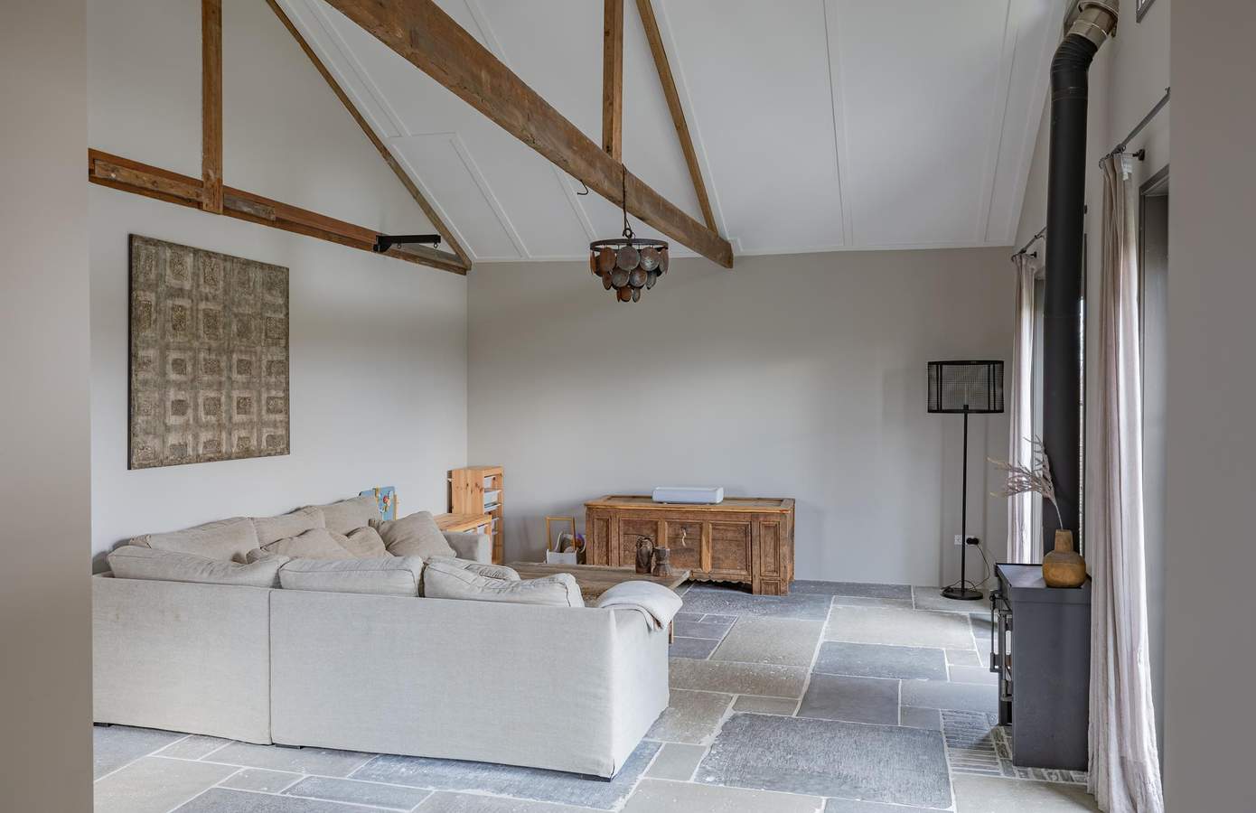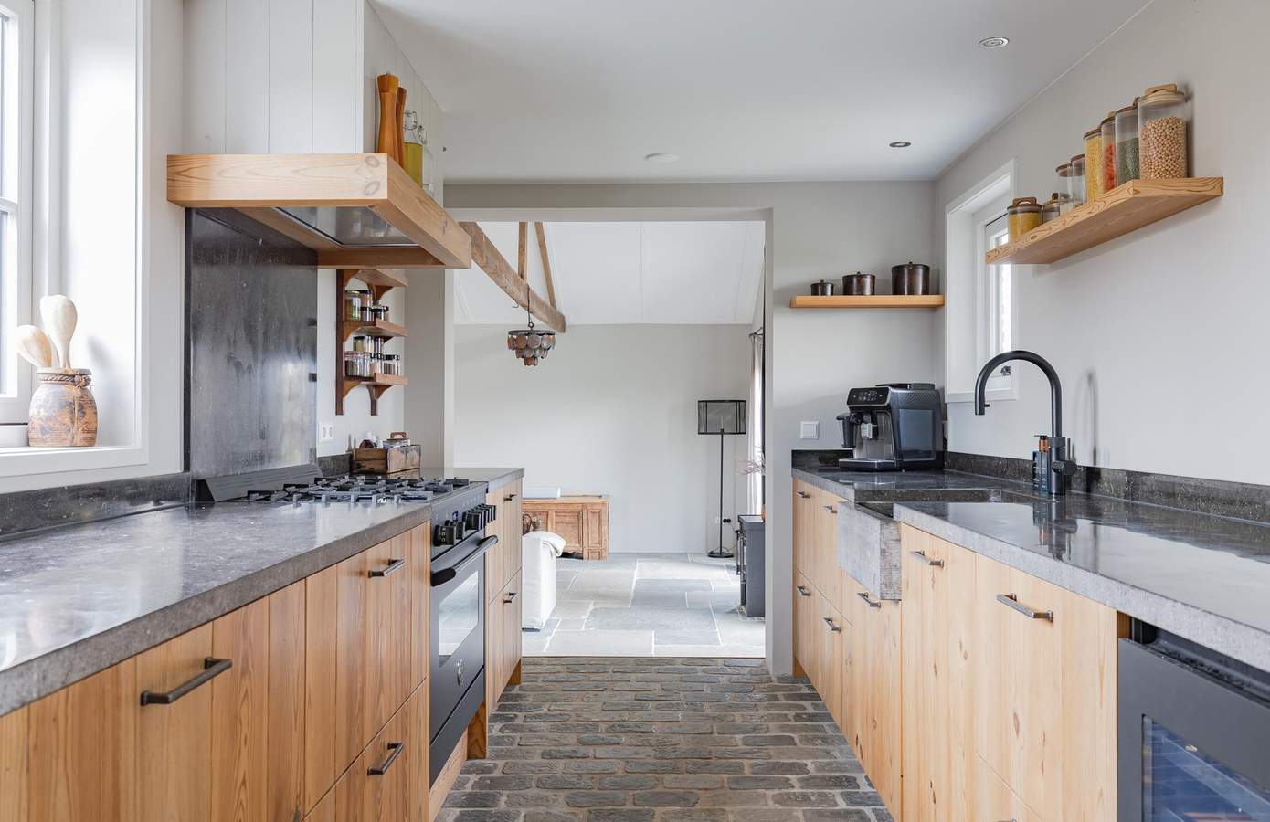 Via de entree betreedt u de woning in een rustige, verfijnde hal waar direct de toon wordt gezet. De vloer is afgewerkt met karaktervolle rawstone, een materiaal dat niet alleen stijlvol oogt maar ook een natuurlijke verbinding vormt met de rest van de woning. Aan de voorzijde bevindt zich de eetkamer met de openhaard, een elegante ruimte met een warme grenenhouten vloer die direct bijdraagt aan de huiselijke sfeer. Openslaande deuren verbinden deze ruimte met de veranda en de aangrenzende achtertuin, waardoor binnen en buiten op natuurlijke wijze in elkaar overlopen. Centraal in de woning ligt de robuuste keuken. De keuken vormt het kloppend hart van de woning en is een echt maatwerkmeubel, met hergebruikte grenenvloerdelen, de verbindende schakel tussen de eetkamer en woonkamer. De opstelling is praktisch én esthetisch, met een fraai Belgisch hardstenen werkblad, robuuste kastfronten en doordachte details zoals open schappen en een geïntegreerde wijnklimaatkast. De woonkamer is gesitueerd in de voormalige bollenschuur. Hier zorgen de royale hoogte, zichtbare houten constructiebalken en de rawstone vloer met vloerverwarming voor een uitgebalanceerde mix van comfort en karakter. Twee openslaande deuren geven toegang tot de achtertuin en laten het daglicht mooi binnenstromen. De houtkachel voegt niet alleen sfeer en een behagelijke warmte toe, maar versterkt ook het gevoel van geborgenheid en luxe.