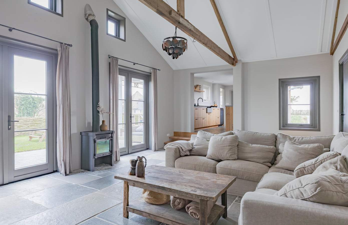 • Speelse en doordachte indeling met eetkamer, centrale keuken en woonkamer in de voormalige bollenschuur.