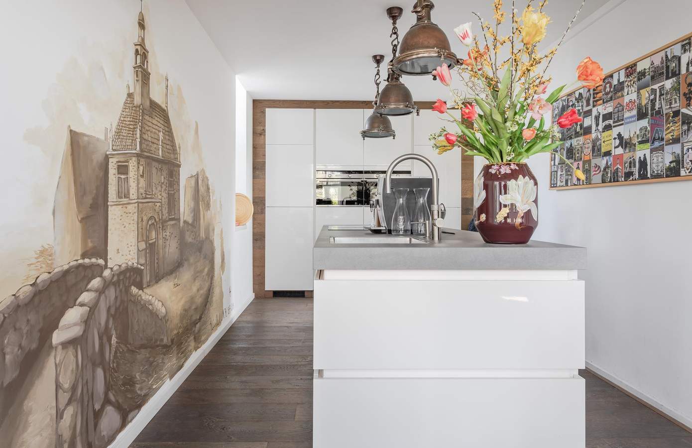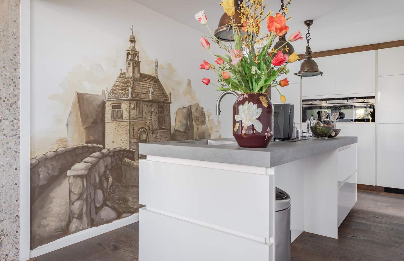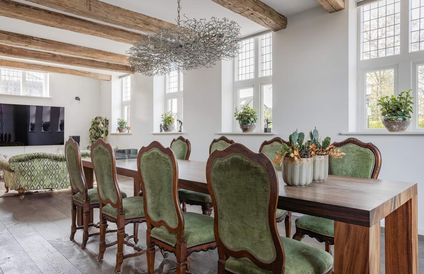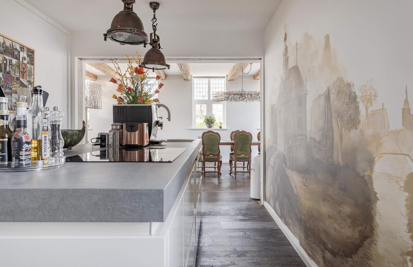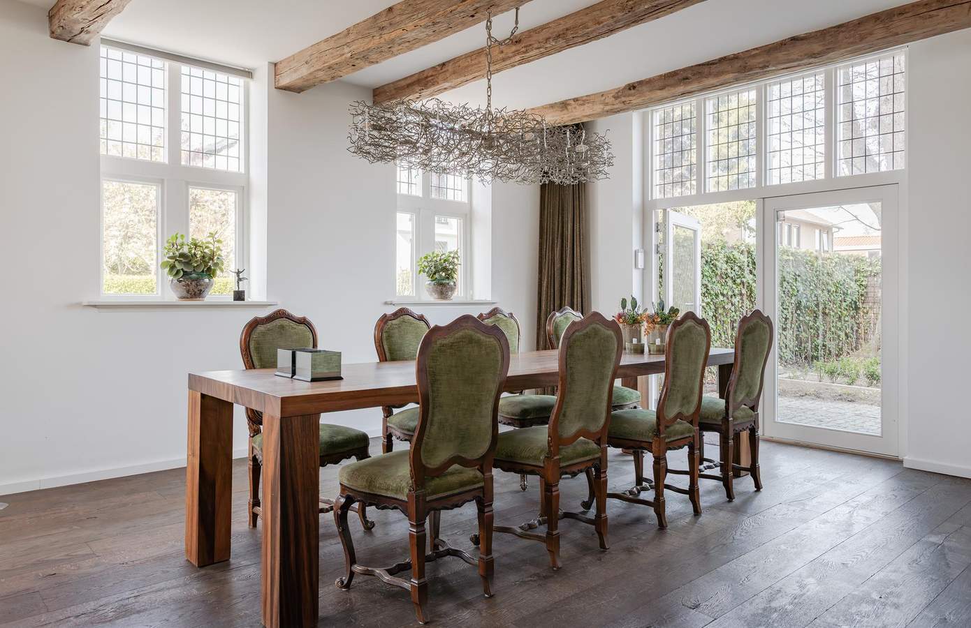 De statige entree leidt naar een even indrukwekkende, royale hal. Het vertelt vele verhalen. Een deel van de oorspronkelijke, eeuwenoude muur is zichtbaar. Er hangt een vergulde windhaan, een oude zonnewijzer en een WOII-gedenksteen. En u vindt hier het toilet en de trap. Midden in de woning staat de luxe keuken. Een muurschildering, kookeiland en kastenwand domineren de ruimte. Kopse kanten van gewapend beton herinneren aan de bankkluis. De gehele linkerhelft van de woning is woonkamer. Hoog, licht, strak afgewerkt. Prachtige raampartijen, sprekende vloer en plafond met hergebruikt hout: alles ademt sfeer en geborgenheid. Het kantoor aan de achterzijde is in 2024 gerealiseerd en zijn de ramen voorzien van deels voorzetramen en deels dubbelglas.