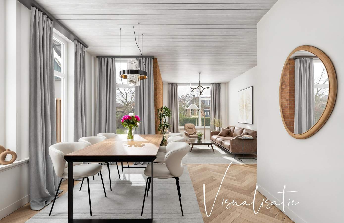 Aan de voorzijde van de woning vindt u de woonkamer, met grote ramen die zorgen voor prettig daglicht en uitzicht op de Dorpsstraat. De ruimte is praktisch ingedeeld met een zit- en eethoek. De keuken ligt centraal in de woning en is functioneel ingericht, met voldoende kastruimte. Via de tussenhal, waar ook het toilet is, bereikt u de bijkeuken. Vanuit hier is de badkamer bereikbaar, voorzien van een douche en wastafelmeubel. Op de eerste verdieping zijn drie slaapkamers aanwezig, elk met ruimte voor een bed en kastruimte. Daarnaast is er een inloopkast voor extra berging.