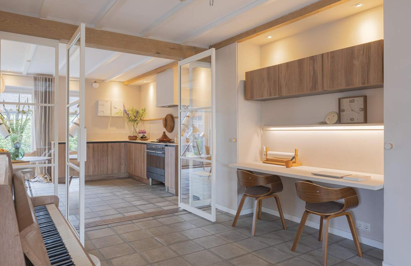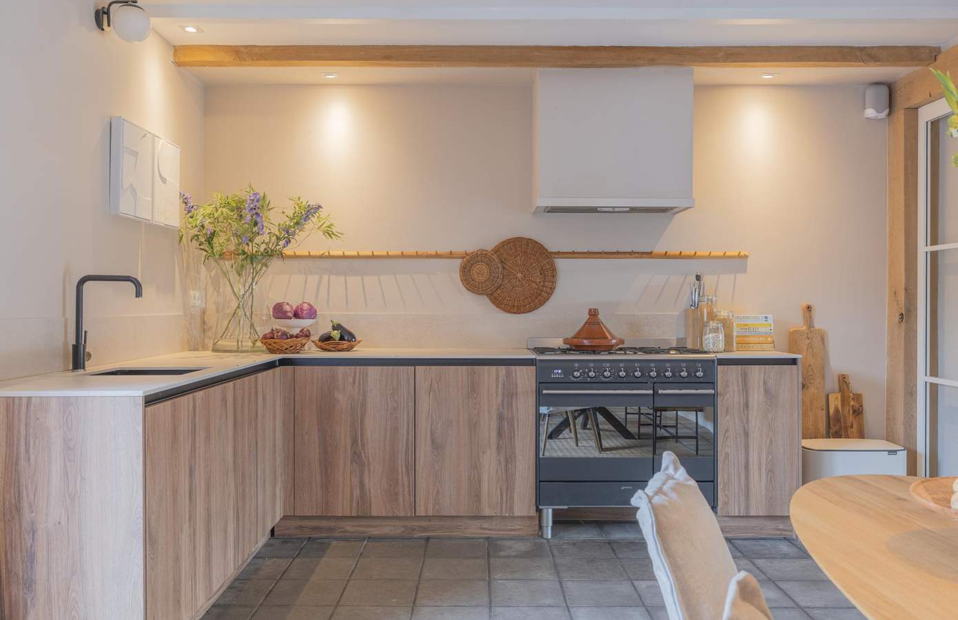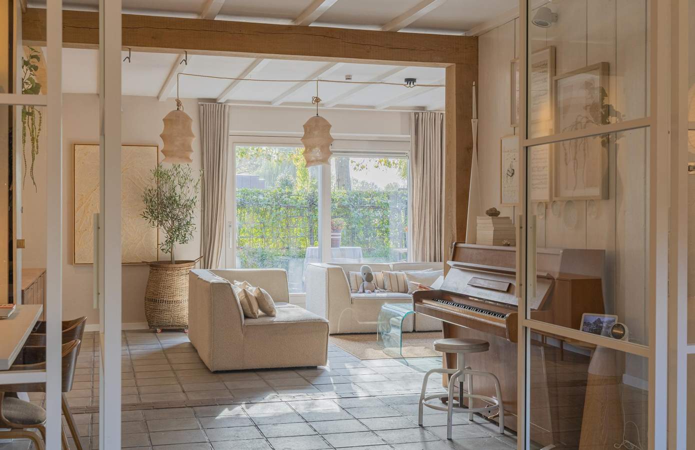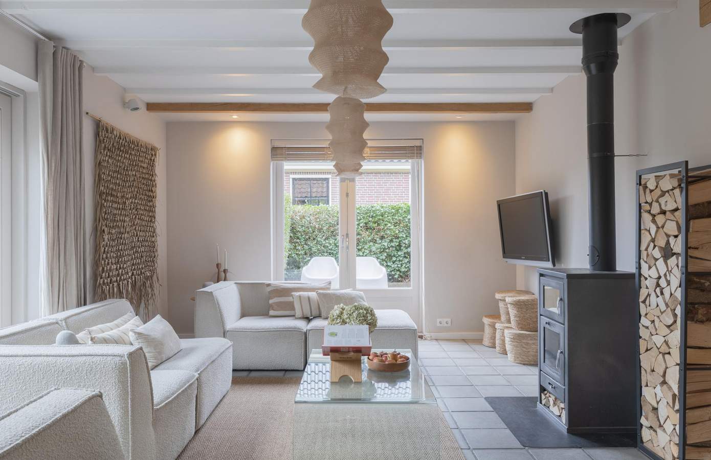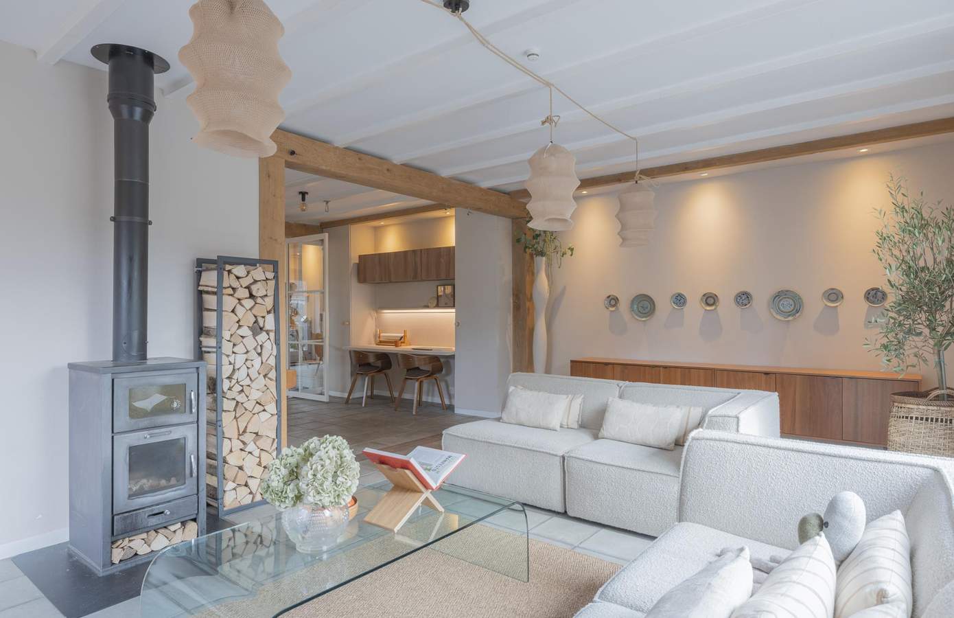 Zodra u binnenstapt, ervaart u de rust en verfijning waarmee deze woning is vormgegeven. De tegelvloer loopt naadloos door vanuit buiten en zorgt voor een stijlvol en onderhoudsvriendelijk geheel. De woonkamer ademt sfeer, met een charmante houtkachel die ook dienstdoet als pizzaoven, een echte blikvanger. Er is aan de voorkant een schuifpui en aan de zijkant zijn openslaande deuren aanwezig waardoor binnen en buiten prachtig in elkaar overvloeien. Stalen taatsdeuren scheiden de woonkamer van de woonkeuken, terwijl ze de ruimtes visueel met elkaar verbinden. De woonkeuken is zonder twijfel het hart van het huis, een bijzonder sfeervolle leefruimte. Het ontbreekt hier aan niets om dagelijks een heerlijke maaltijd op tafel te zetten. De keuken is oogstrelend met luxe inbouwapparatuur, zoals een wijnklimaatkast en een Smeg-fornuis met dubbele oven. Er is gekozen voor een dubbele hoekopstelling met centraal in het midden een schuifpui naar de achtertuin. Op de gehele begane grondvloer ligt een stoere tegelvloer met vloerverwarming. In de hal vindt u de wasapparatuur, weggewerkt in een op maat gemaakte ombouw, het toilet, de stookruimte en de badkamer. In de badkamer komt u helemaal tot rust, doordat deze is voorzien van alle gemakken. Er is een hoekbad, een ruime douche, een fraai wastafelmeubel en een tweede toilet. Wanneer u de trap naar boven neemt, komt u uit op de ruime overloop die toegang geeft tot alle vertrekken. De master bedroom is royaal te noemen, dit komt mede door de dakkapel. Aan de achterzijde zijn nog twee slaapkamers gesitueerd, beide slaapkamers hebben een handig podiumbed met veel extra opbergruimte. Op de overloop is voldoende ruimte om bijvoorbeeld een werk-/studeerplek te creëren. De slimme en goed doordachte indeling van de woning maakt het praktisch en comfortabel voor het hele gezin.