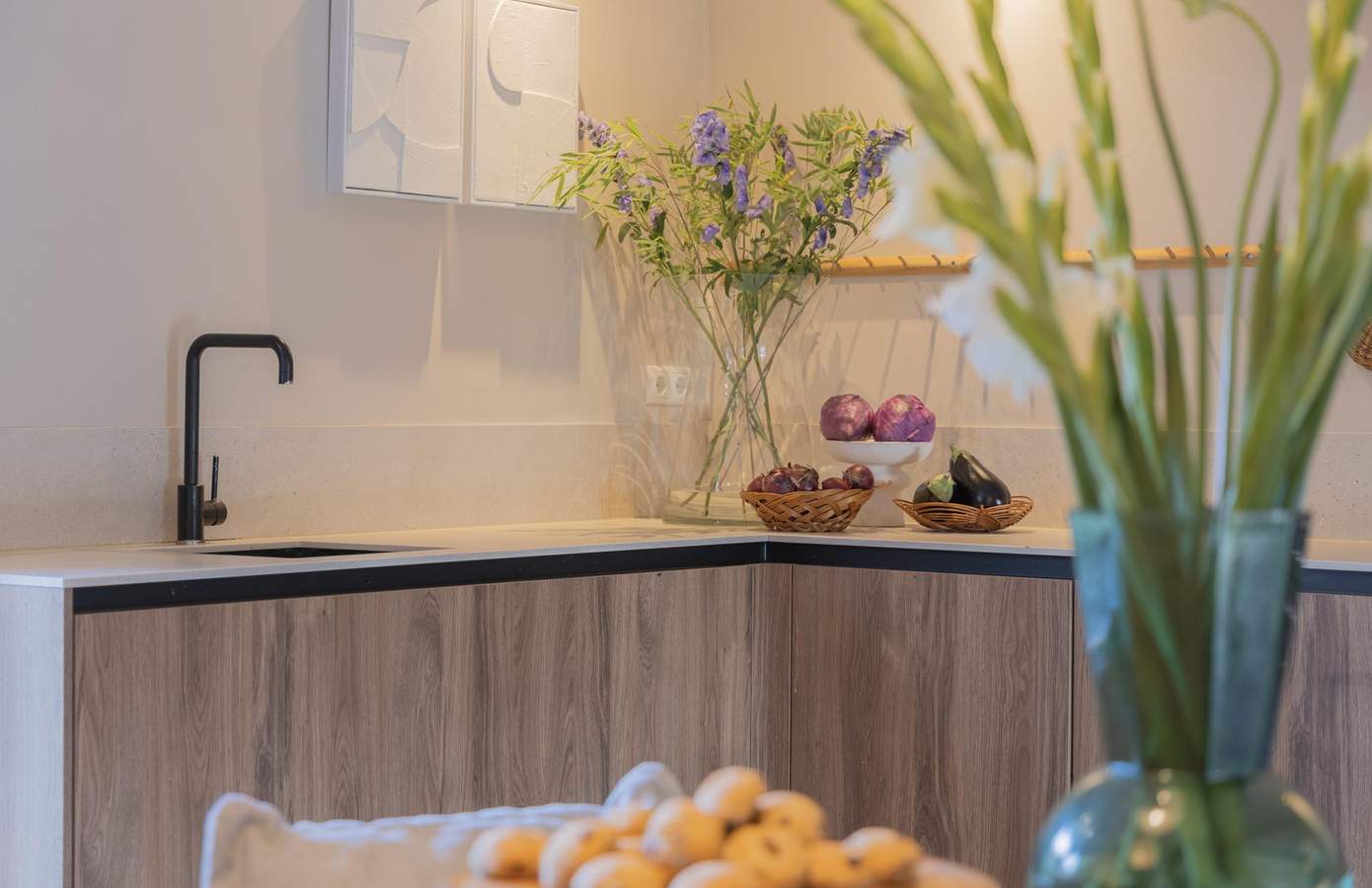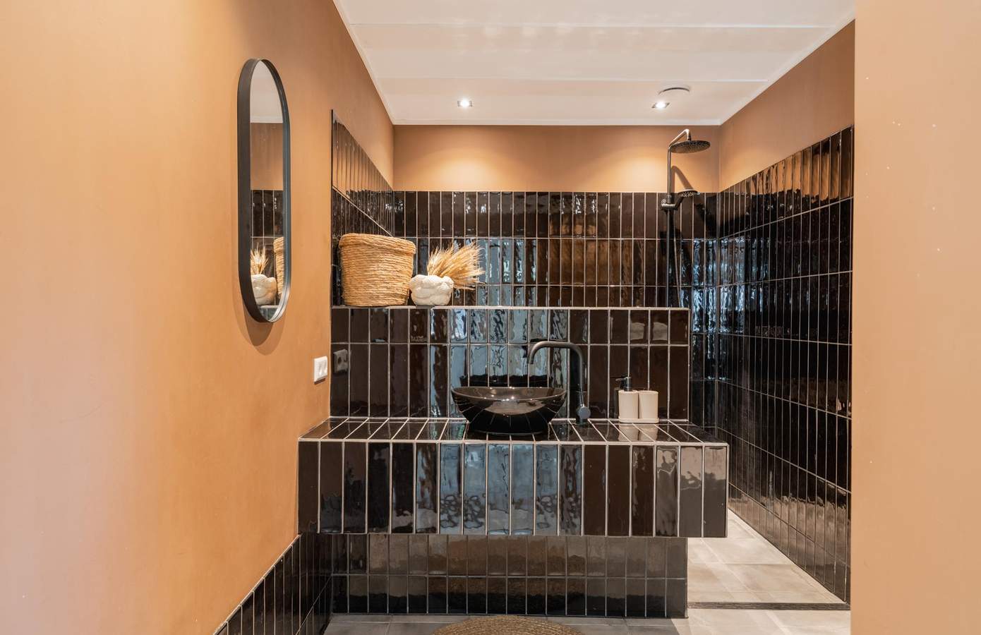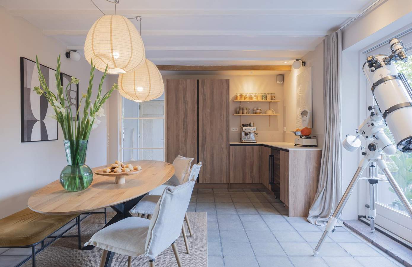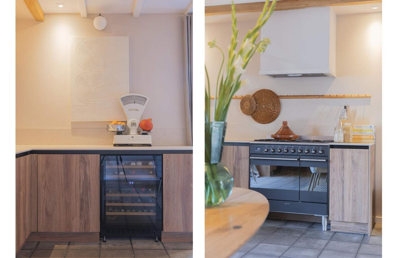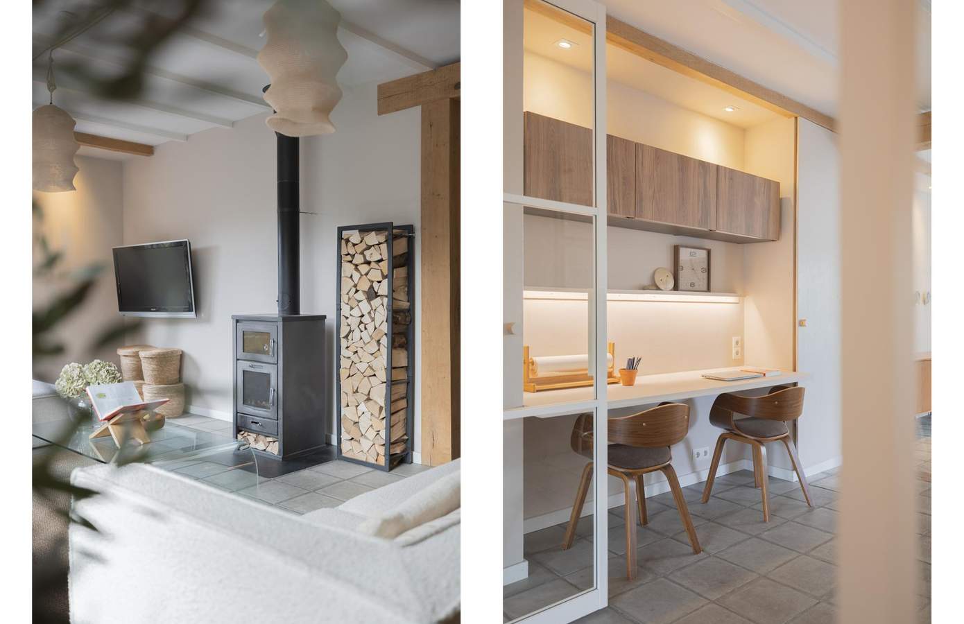 Zodra u binnenstapt, ervaart u de rust en verfijning waarmee deze woning is vormgegeven. De tegelvloer loopt naadloos door vanuit buiten en zorgt voor een stijlvol en onderhoudsvriendelijk geheel. De woonkamer ademt sfeer, met een charmante houtkachel die ook dienstdoet als pizzaoven, een echte blikvanger. Er is aan de voorkant een schuifpui en aan de zijkant zijn openslaande deuren aanwezig waardoor binnen en buiten prachtig in elkaar overvloeien. Stalen taatsdeuren scheiden de woonkamer van de woonkeuken, terwijl ze de ruimtes visueel met elkaar verbinden. De woonkeuken is zonder twijfel het hart van het huis, een bijzonder sfeervolle leefruimte. Het ontbreekt hier aan niets om dagelijks een heerlijke maaltijd op tafel te zetten. De keuken is oogstrelend met luxe inbouwapparatuur, zoals een wijnklimaatkast en een Smeg-fornuis met dubbele oven. Er is gekozen voor een dubbele hoekopstelling met centraal in het midden een schuifpui naar de achtertuin. Op de gehele begane grondvloer ligt een stoere tegelvloer met vloerverwarming. In de hal vindt u de wasapparatuur, weggewerkt in een op maat gemaakte ombouw, het toilet, de stookruimte en de badkamer. In de badkamer komt u helemaal tot rust, doordat deze is voorzien van alle gemakken. Er is een hoekbad, een ruime douche, een fraai wastafelmeubel en een tweede toilet. Wanneer u de trap naar boven neemt, komt u uit op de ruime overloop die toegang geeft tot alle vertrekken. De master bedroom is royaal te noemen, dit komt mede door de dakkapel. Aan de achterzijde zijn nog twee slaapkamers gesitueerd, beide slaapkamers hebben een handig podiumbed met veel extra opbergruimte. Op de overloop is voldoende ruimte om bijvoorbeeld een werk-/studeerplek te creëren. De slimme en goed doordachte indeling van de woning maakt het praktisch en comfortabel voor het hele gezin.