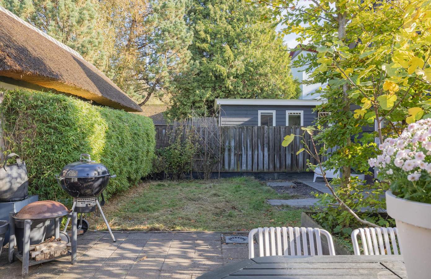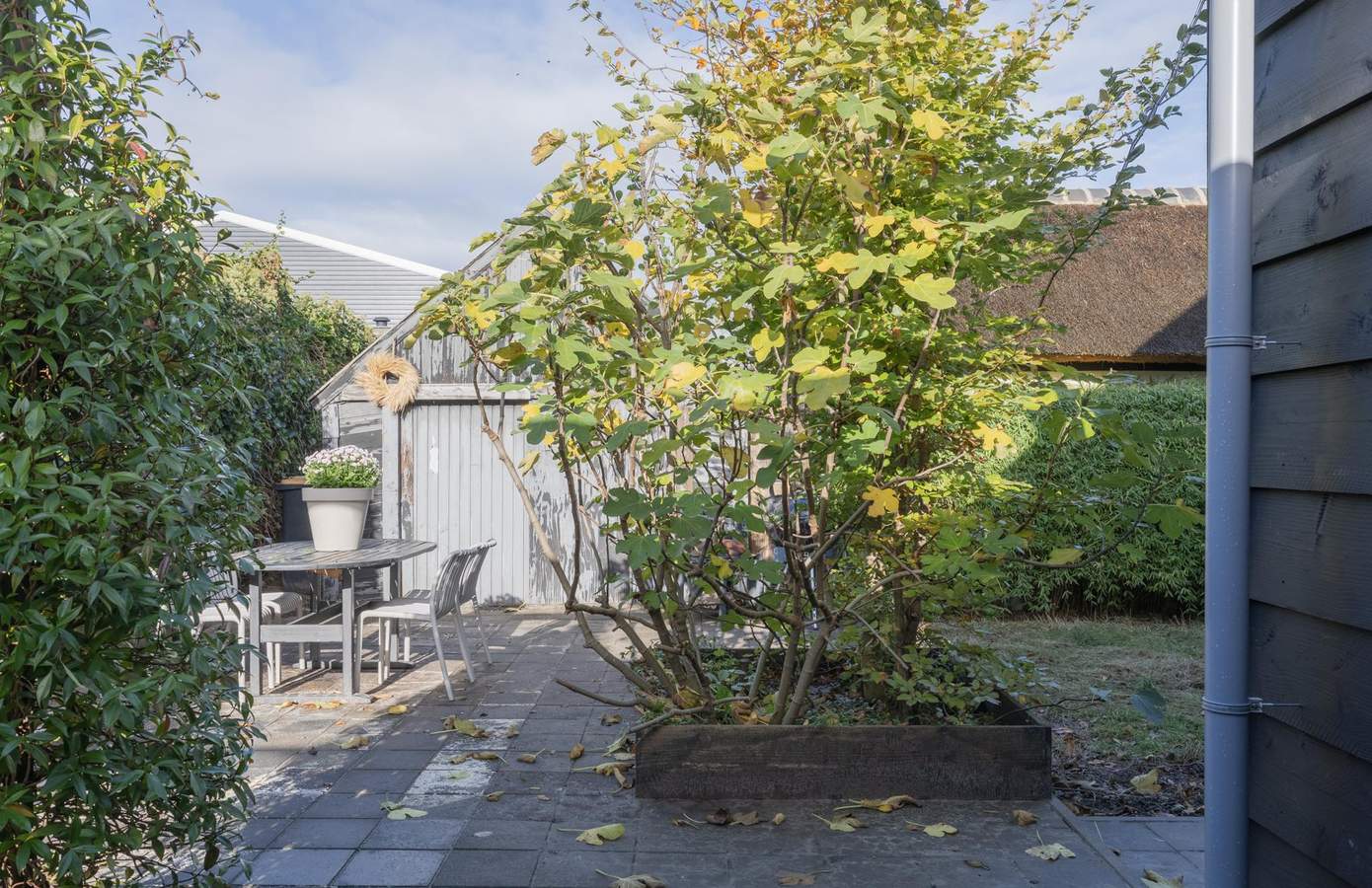 De tuin omsluit de woning aan drie zijden, met terrassen aan de voor-, zij- en achterkant is er altijd een heerlijke plek om te genieten van zon en schaduw. De beplanting is zorgvuldig gekozen en draagt bij aan het landelijke karakter: peren-, appel-, vijgen-, pruimen- en kersenbomen sieren de tuin, samen met bessen- en frambozenstruiken. Een aparte berging biedt praktische ruimte voor fietsen, gereedschap of tuinmeubilair.