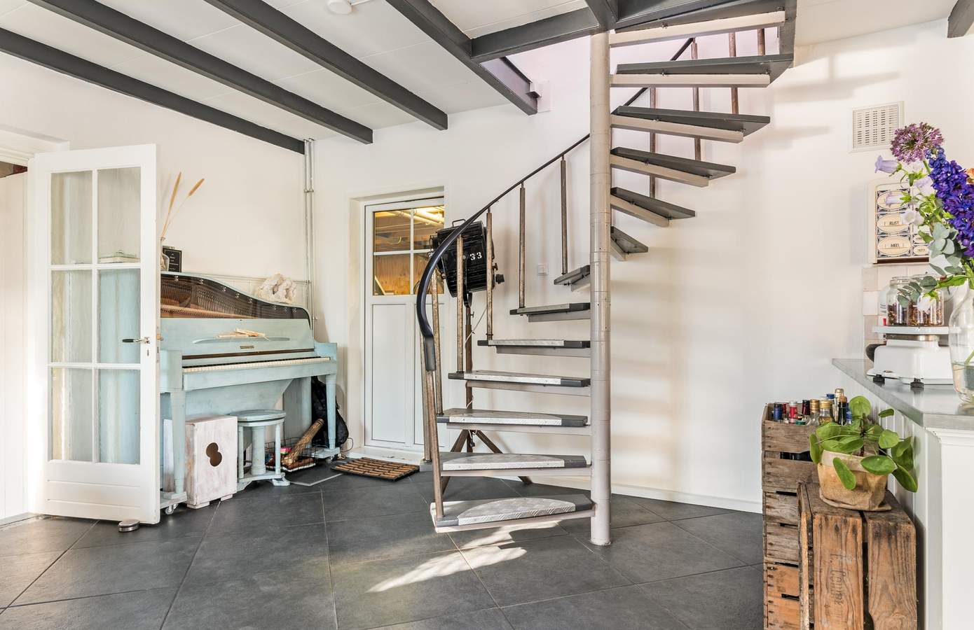 U betreedt de woning via de hal. Dan komt u binnen in een ruime open leefkeuken. De keuken heeft een vaatwasmachine, gasfornuis met oven en voldoende opbergruimte. In de hal is ook de badkamer/wasruimte gesitueerd, deze is voorzien van een wastafel en een jacuzzi/stoomdouche. De woonkamer is zeer sfeervol en opengewerkt naar boven, waar onder de houten balken op de vide een extra slaapvertrek is. De eerste verdieping telt drie slaapkamers waarvan één nog een kleine trap naar een romantisch zoldertje heeft. De veranda aan de woning is geïnspireerd op de Cubaanse stijl. Naast het woonhuis is er een ruime inpandige garage met een extra verdieping, welke zorgt voor extra woonruimte met gemakkelijke toegang vanuit het huis.