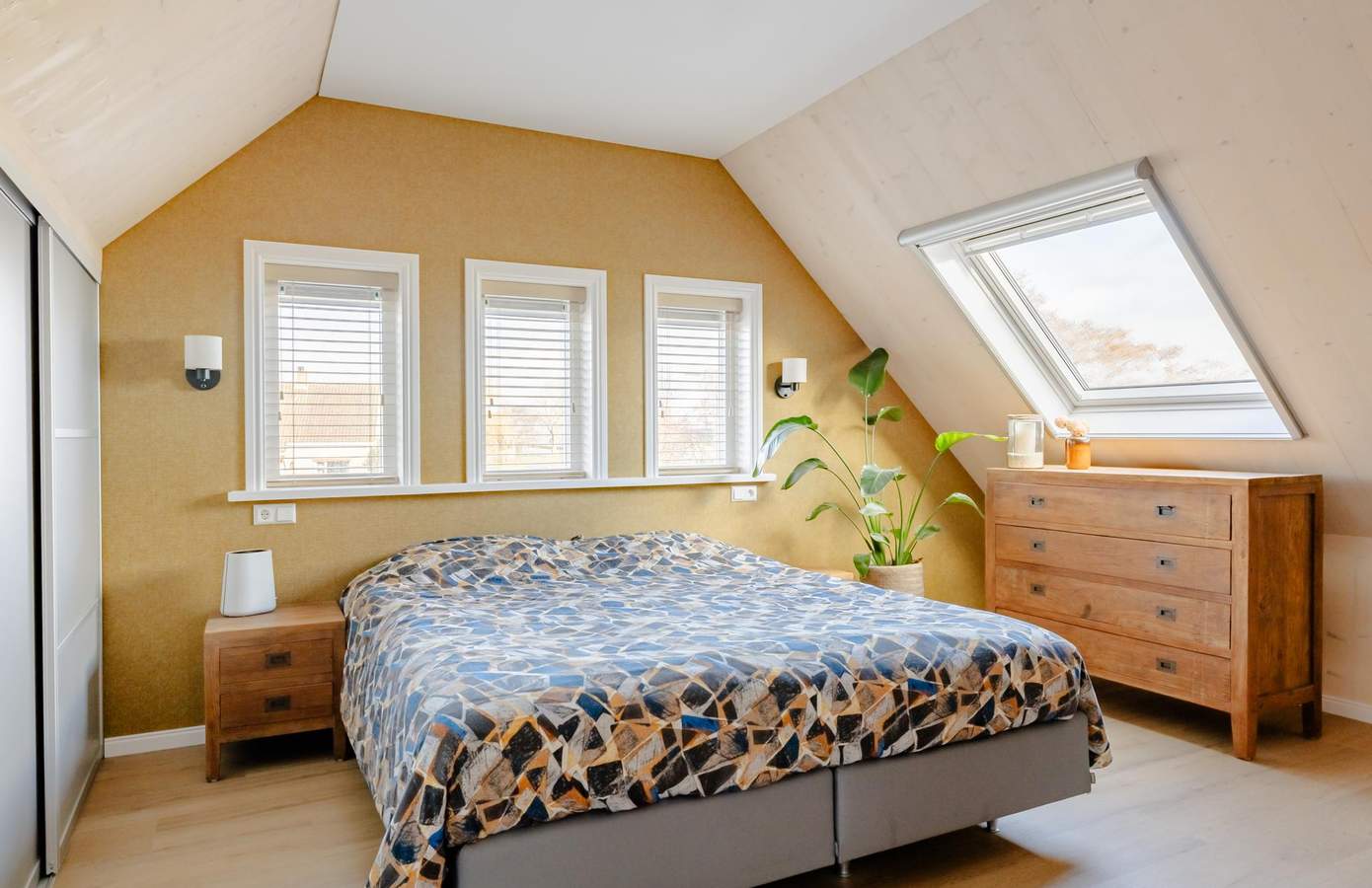 Op de verdieping bevinden zich drie slaapkamers, waaronder een royale masterbedroom met vaste kastenwand. De badkamer is compleet en comfortabel uitgevoerd met een inloopdouche met regendouche, een ligbad met jets en een wastafelmeubel. De indeling is praktisch en afgestemd op het dagelijks gebruik. De zolder is bereikbaar via een uitklapbare trap, afkomstig uit een familieboerderij en passend bij het karakter van de woning, en biedt volop bergruimte voor seizoensdecoraties.