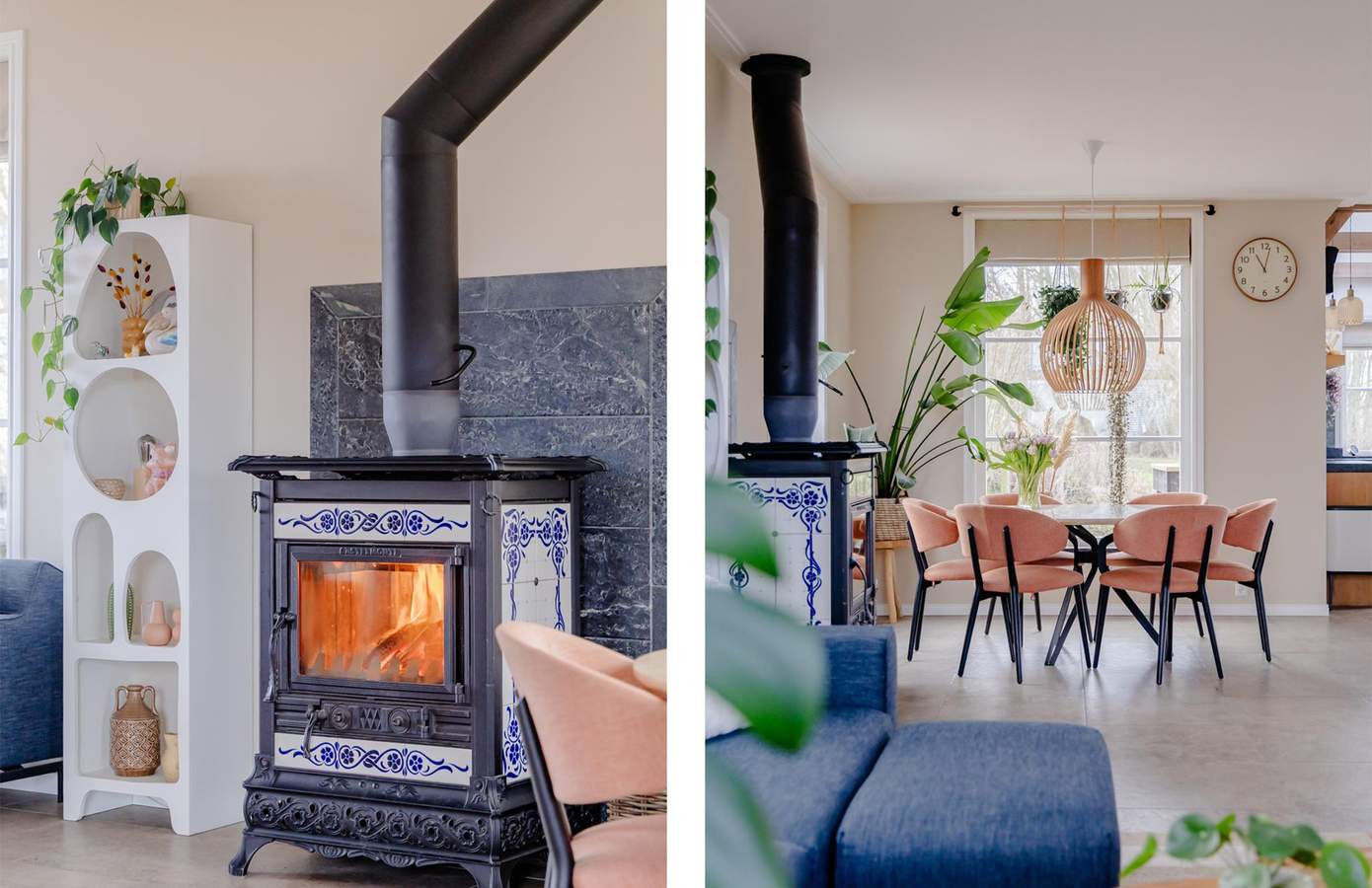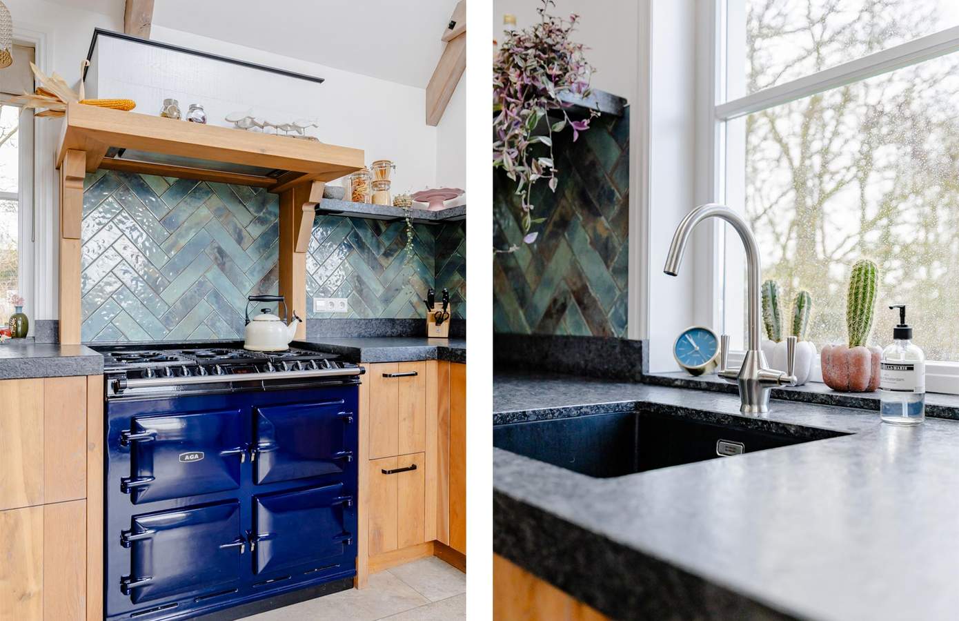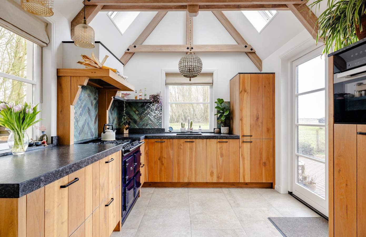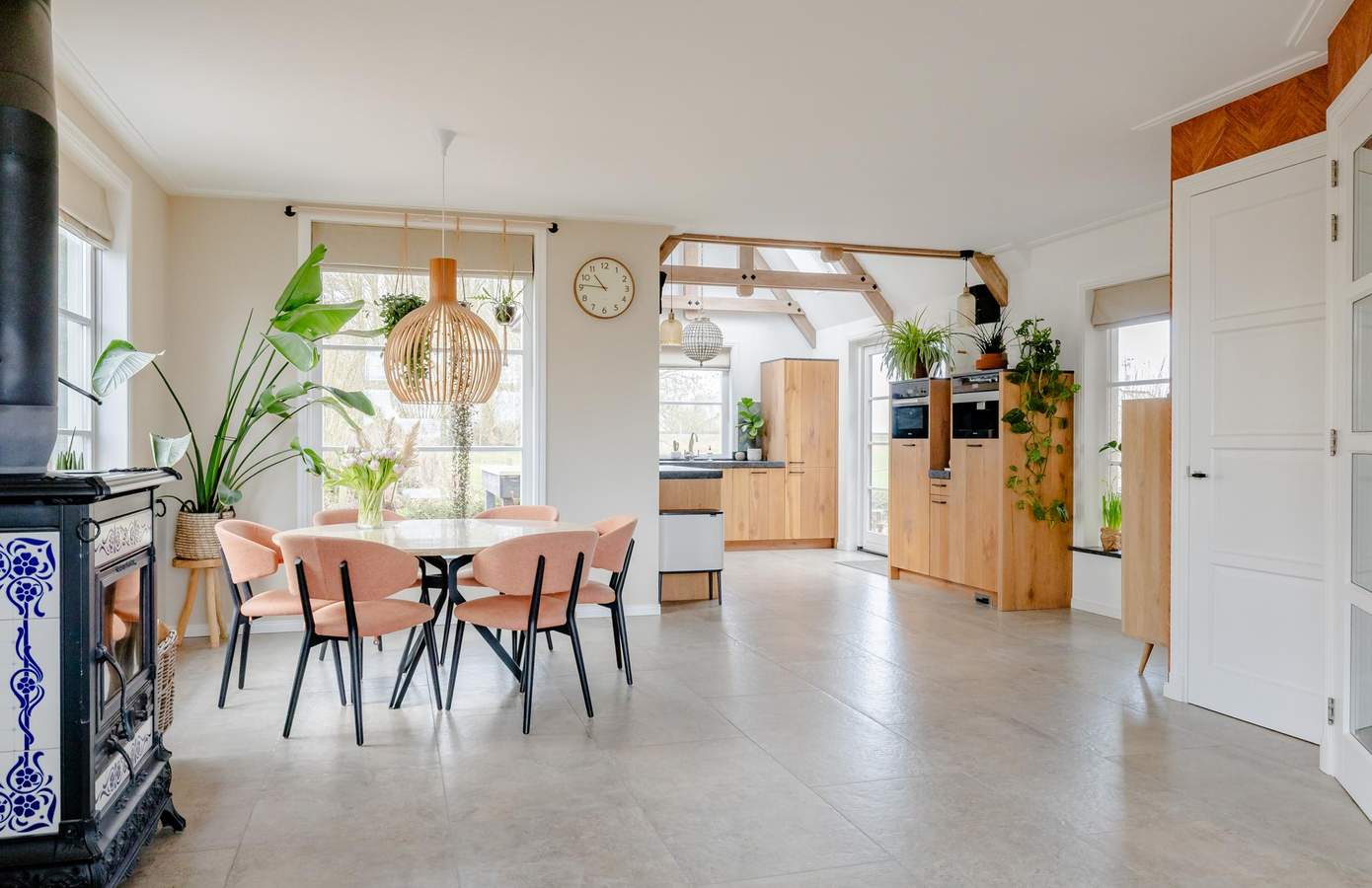 U voelt het direct bij binnenkomst: licht, rust en kwaliteit. De erker met glas-in-lood vangt veel daglicht op en geeft de woonkamer direct karakter. Grote raampartijen en openslaande tuindeuren zorgen voor een open sfeer en een natuurlijke verbinding met de tuin. De woonkamer is sfeervol en uitnodigend. De houtkachel vormt het middelpunt, een plek waar sfeer en warmte samenkomen, terwijl de vloerverwarming onder de keramische tegelvloer het hele jaar door comfort biedt. De woonkeuken is met recht een blikvanger. Hier komen ambacht en functionaliteit samen. Massief houten fronten, een robuust granieten werkblad en een praktische indeling maken dit een ruimte waar koken en samenzijn vanzelfsprekend in elkaar overlopen. De keuken, vernieuwd in 2022, is uitgerust met hoogwaardige inbouwapparatuur, waaronder een 6-pits gasfornuis met dubbele oven, een combi-oven, ingebouwde koffiemachine, vaatwasmachine en een koel-vriescombinatie. Boven het fornuis zorgen handgevormde tegels voor een ambachtelijk accent, terwijl twee royale dakramen de keuken voorzien van voldoende natuurlijk licht. Vanuit hier kijkt u uit over de tuin en via de openslaande deuren lopen binnen en buiten naadloos op elkaar over.