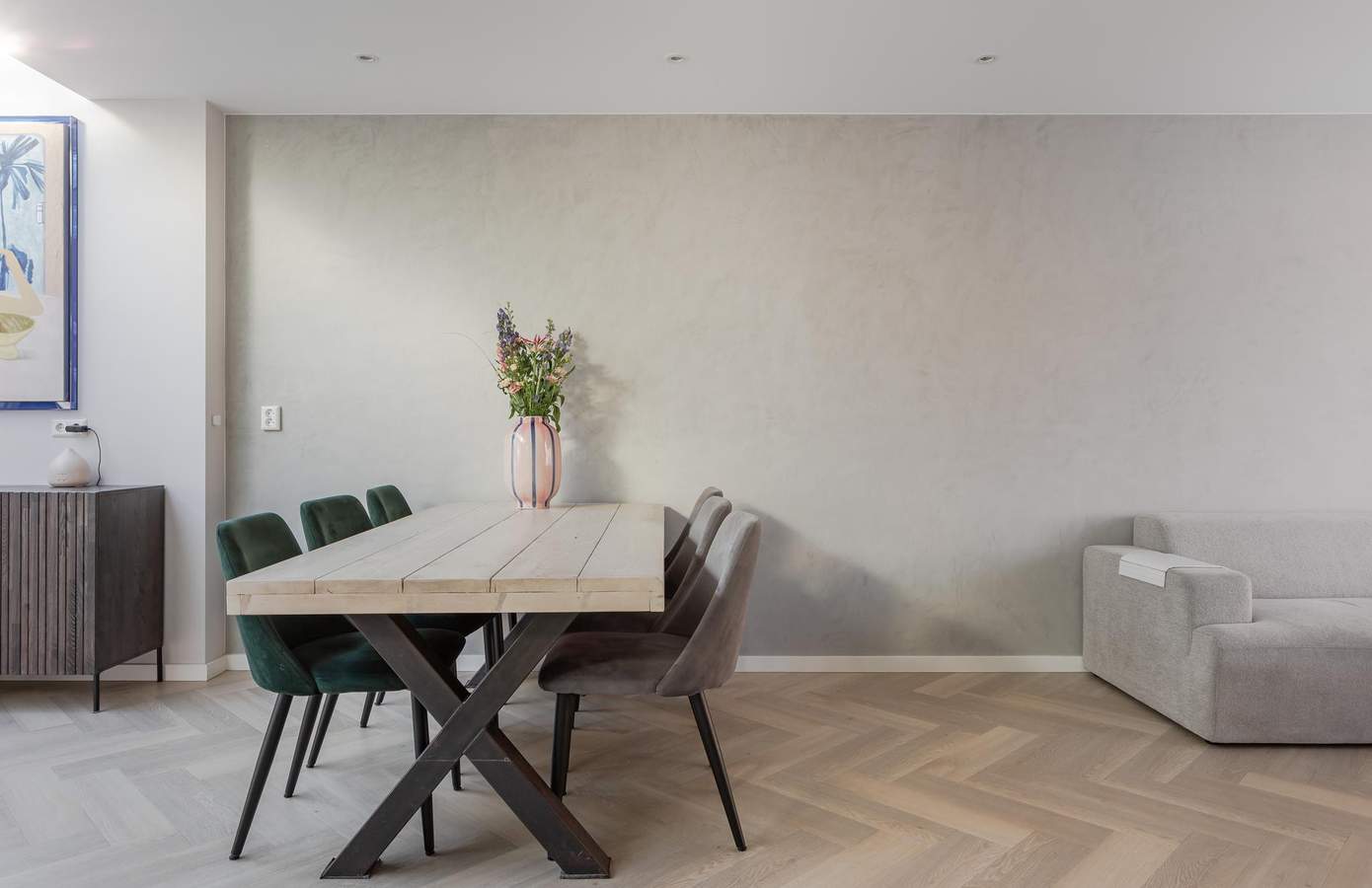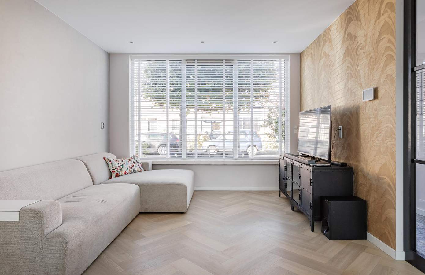 De woonkamer bevindt zich aan de voorzijde van de woning met zicht op de wijk. De ruimte is modern afgewerkt met strakke wanden, inbouwspots in het plafond en een stijlvolle PVC-vloer in een elegant visgraatpatroon voorzien van vloerverwarming.