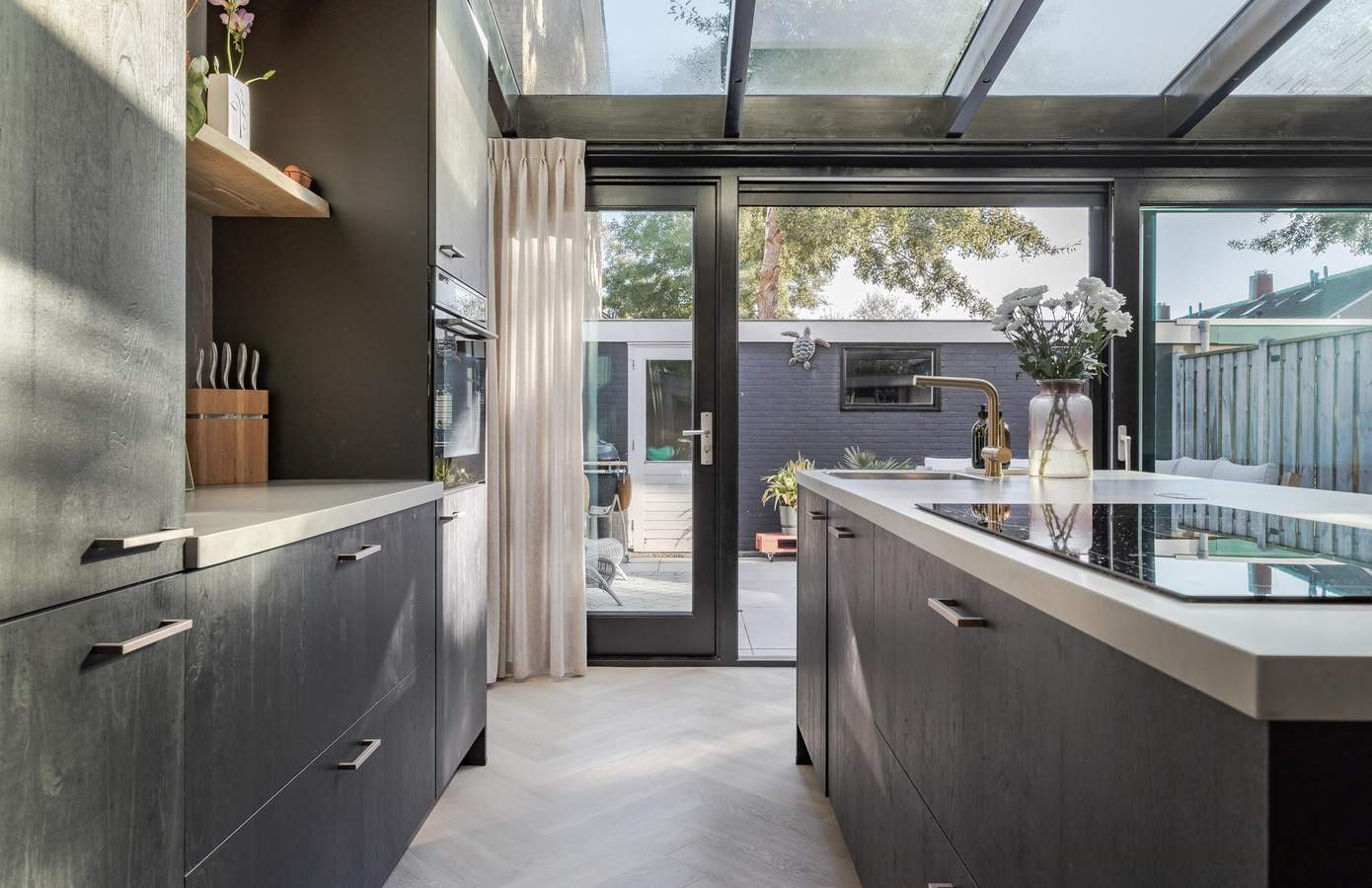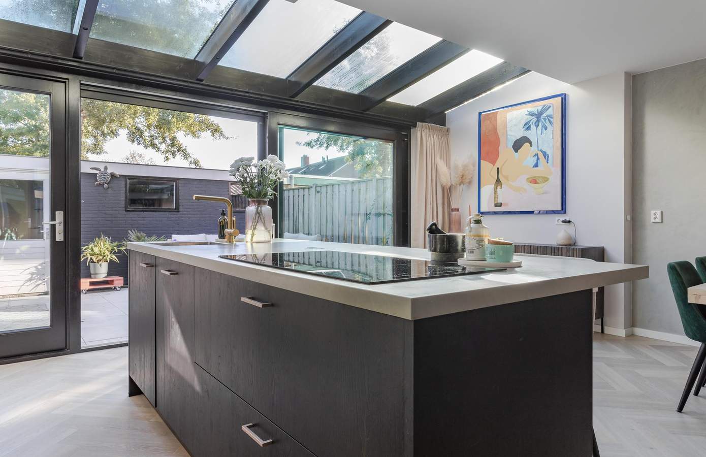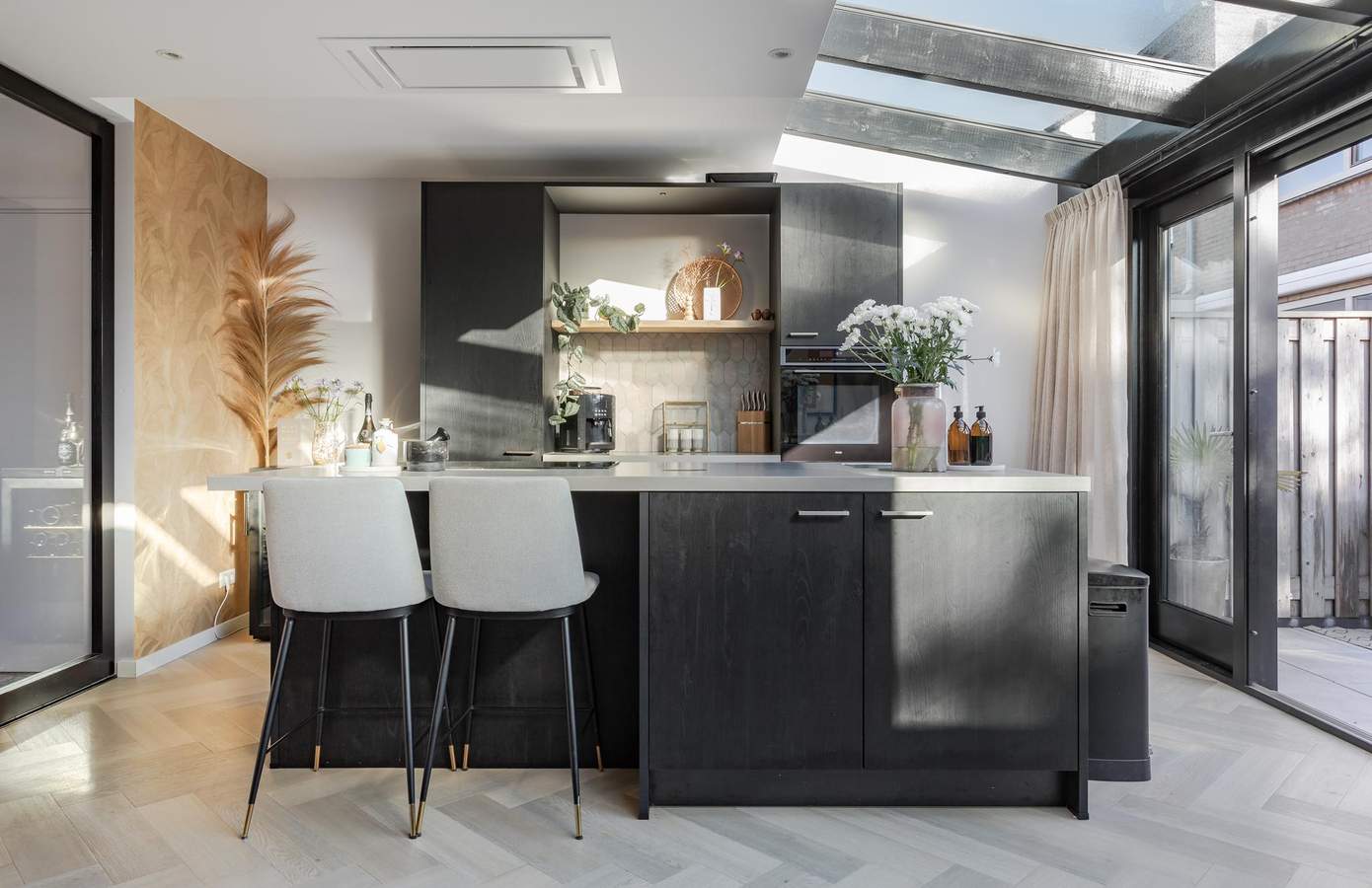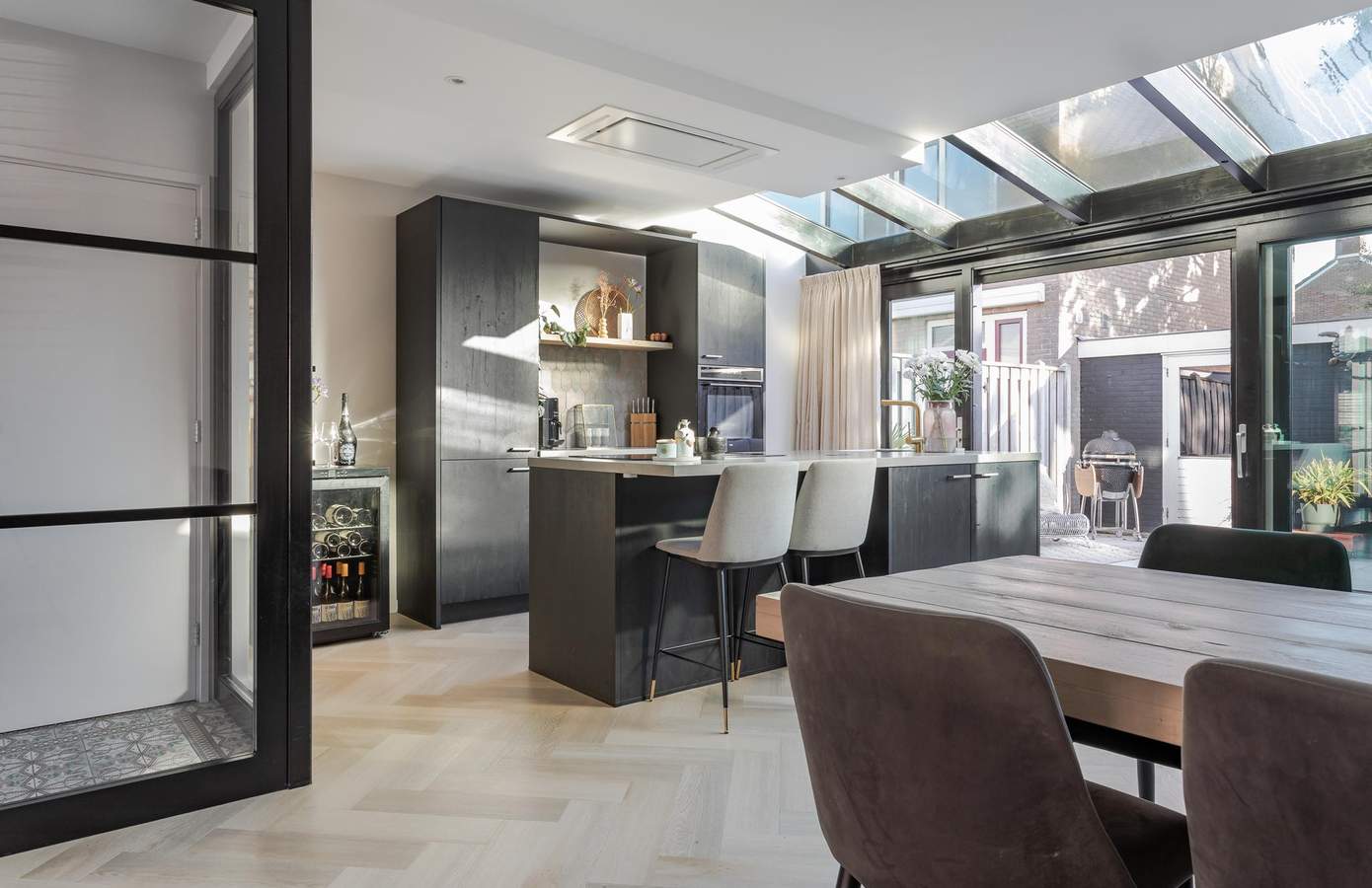 De stijlvolle uitbouw is verder voorzien van zwarte houten kozijnen, een lichtstraat en een schuifpui, allemaal uitgevoerd met zonwerend glas. Dit zorgt ervoor dat je optimaal kunt genieten van natuurlijk daglicht, terwijl de woning in de zomer heerlijk koel blijft.