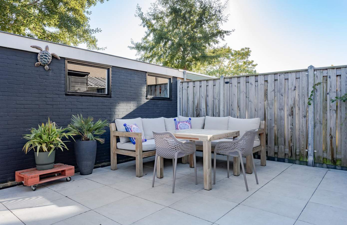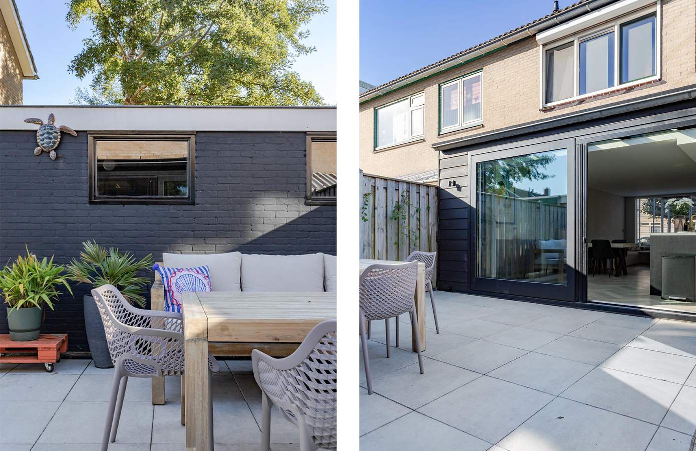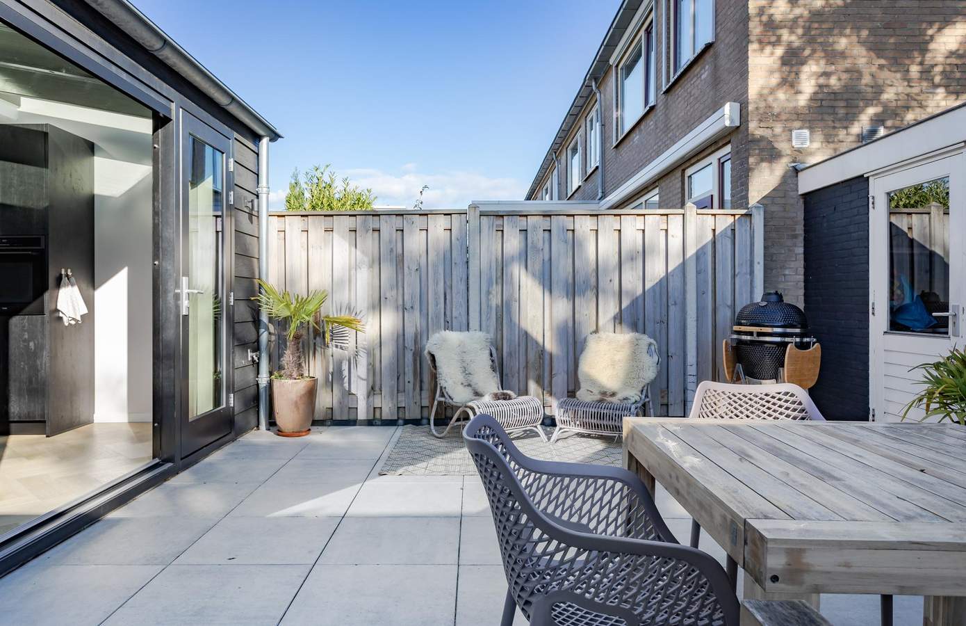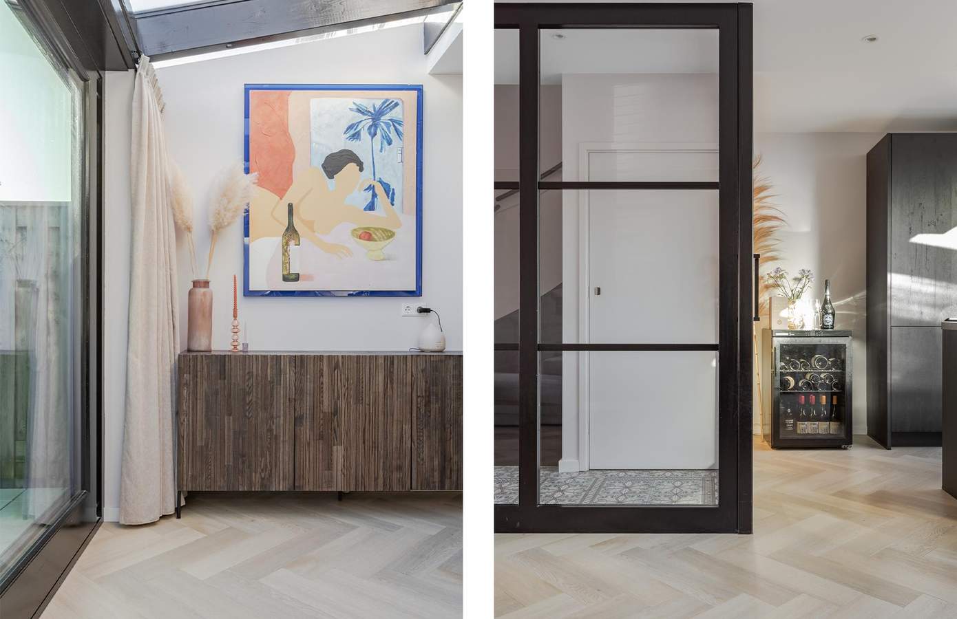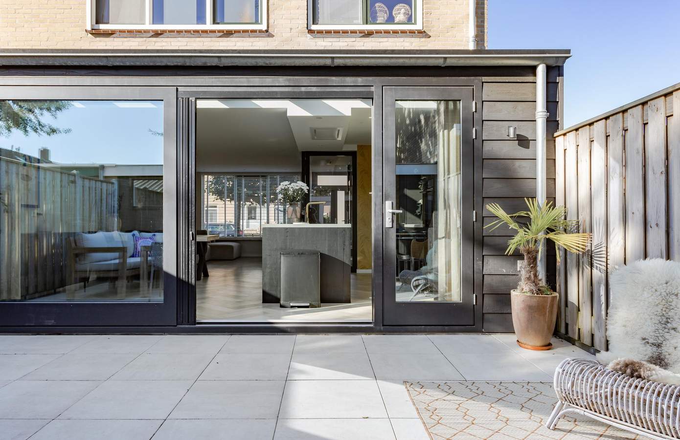 De stijlvolle uitbouw is verder voorzien van zwarte houten kozijnen, een lichtstraat en een schuifpui, allemaal uitgevoerd met zonwerend glas. Dit zorgt ervoor dat je optimaal kunt genieten van natuurlijk daglicht, terwijl de woning in de zomer heerlijk koel blijft.