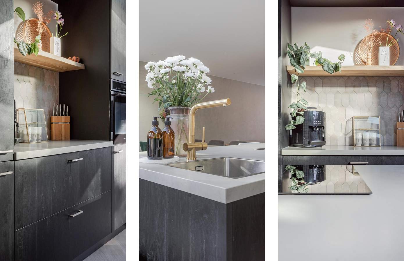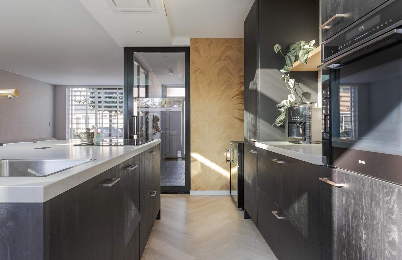 De entree van de woning is een stijlvol welkom, met een hal die wordt gesierd door antieke Franse tegels en een glazen wand, waardoor je direct een doorkijk hebt naar de rest van de woning. Via een prachtige, hoge taatsdeur betreed je de woonkeuken, een absolute parel van het huis. De moderne matzwarte keuken, geplaatst in 2021, is uitgerust met hoogwaardige inbouwapparatuur, zoals een inductiekookplaat, plafondafzuiging, combi-oven, koelkast en vriezer. Het grote kook-/spoeleiland met een marmerlook blad en bar biedt een gezellige plek om samen te komen. Dankzij de uitbouw is er volop ruimte voor een royale eettafel, waardoor je vanuit elke hoek van de woning in verbinding staat met elkaar.