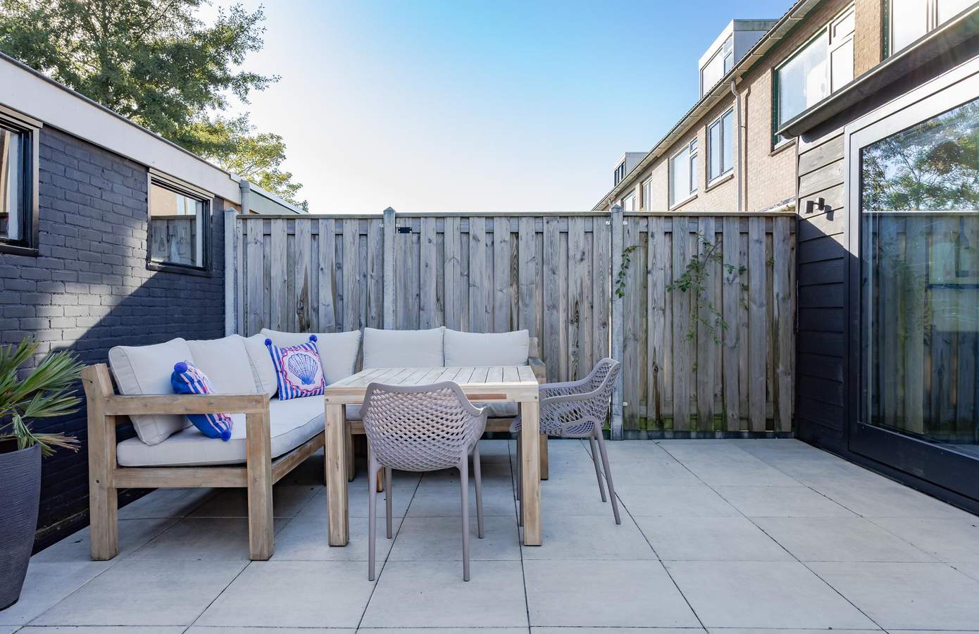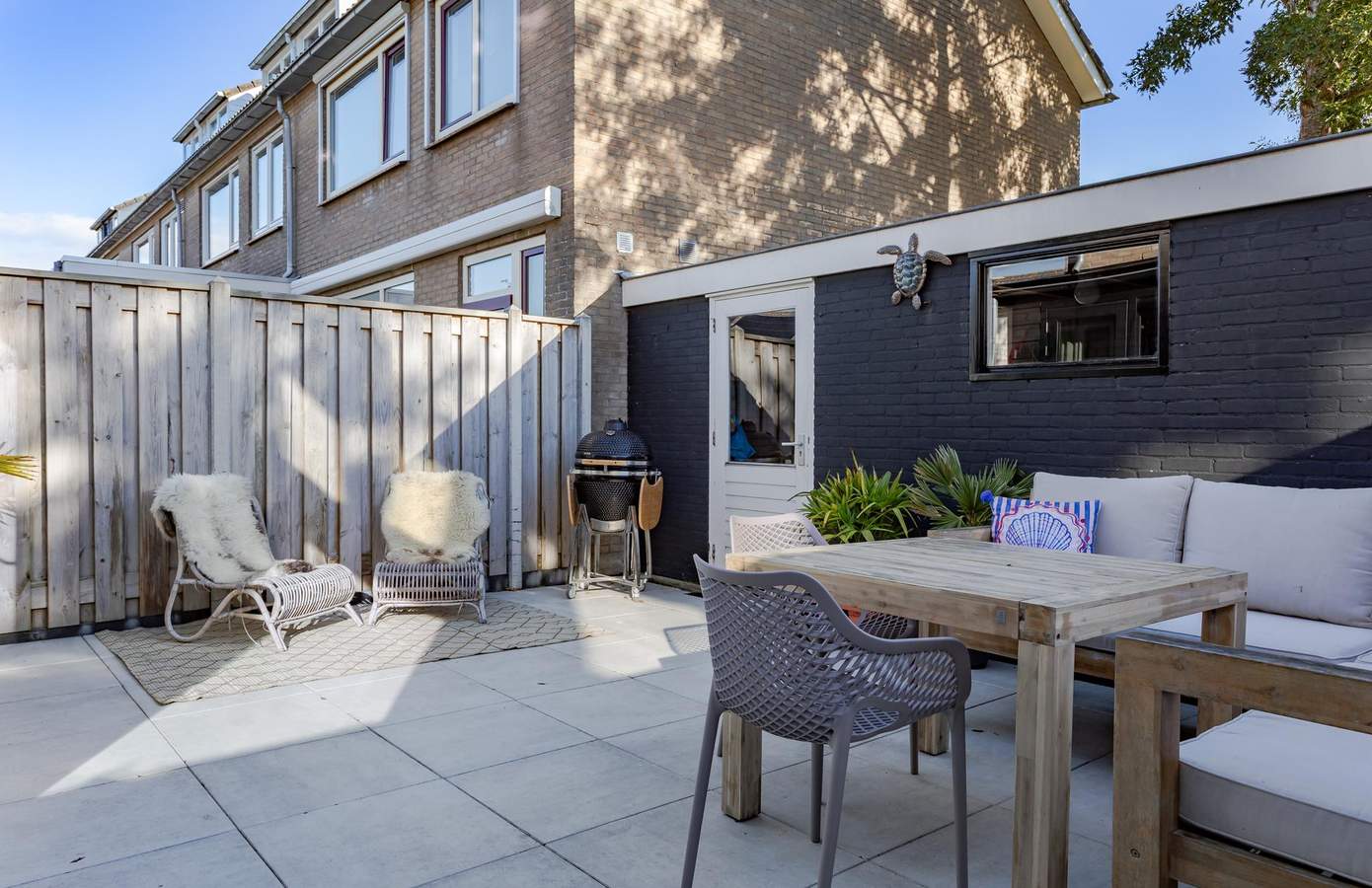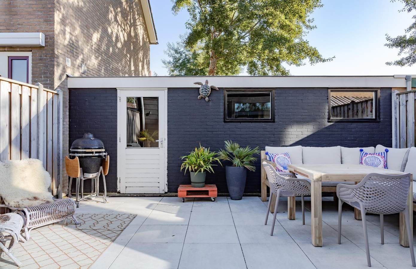 De tuin is onderhoudsvriendelijk aangelegd, waardoor je in iedere hoek heerlijk van de zon kunt genieten. Over de gehele breedte van de tuin bevindt zich een ruime berging, met voldoende plek voor fietsen en al uw tuinspullen. De berging is voorzien van elektriciteit en heeft een loopdeur naar de steeg achter de woning. Vanuit de steeg kunnen de fietsen eenvoudig in de berging worden gezet en kunnen de kinderen veilig te voet naar de speeltuin achter het huis.