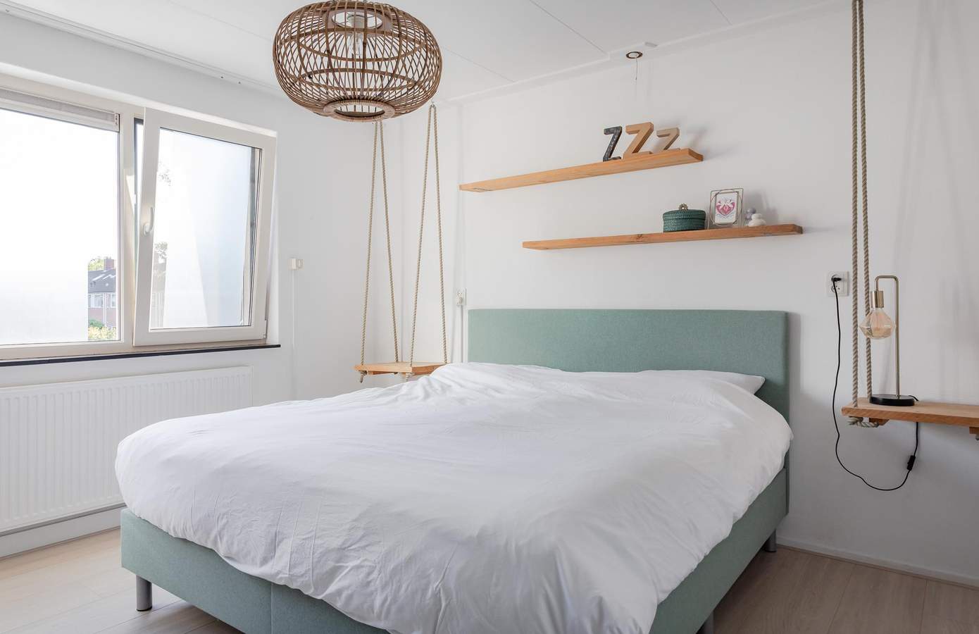 Op de eerste verdieping bevinden zich drie slaapkamers en de badkamer. Aan de achterzijde van de woning liggen twee slaapkamers, waaronder de masterbedroom, die is voorzien van rolluiken. De slaapkamer aan de voorzijde heeft zonwering voor de ramen. De badkamer is modern ingericht met een inloopdouche, een dubbele wastafel en een tweede toilet.