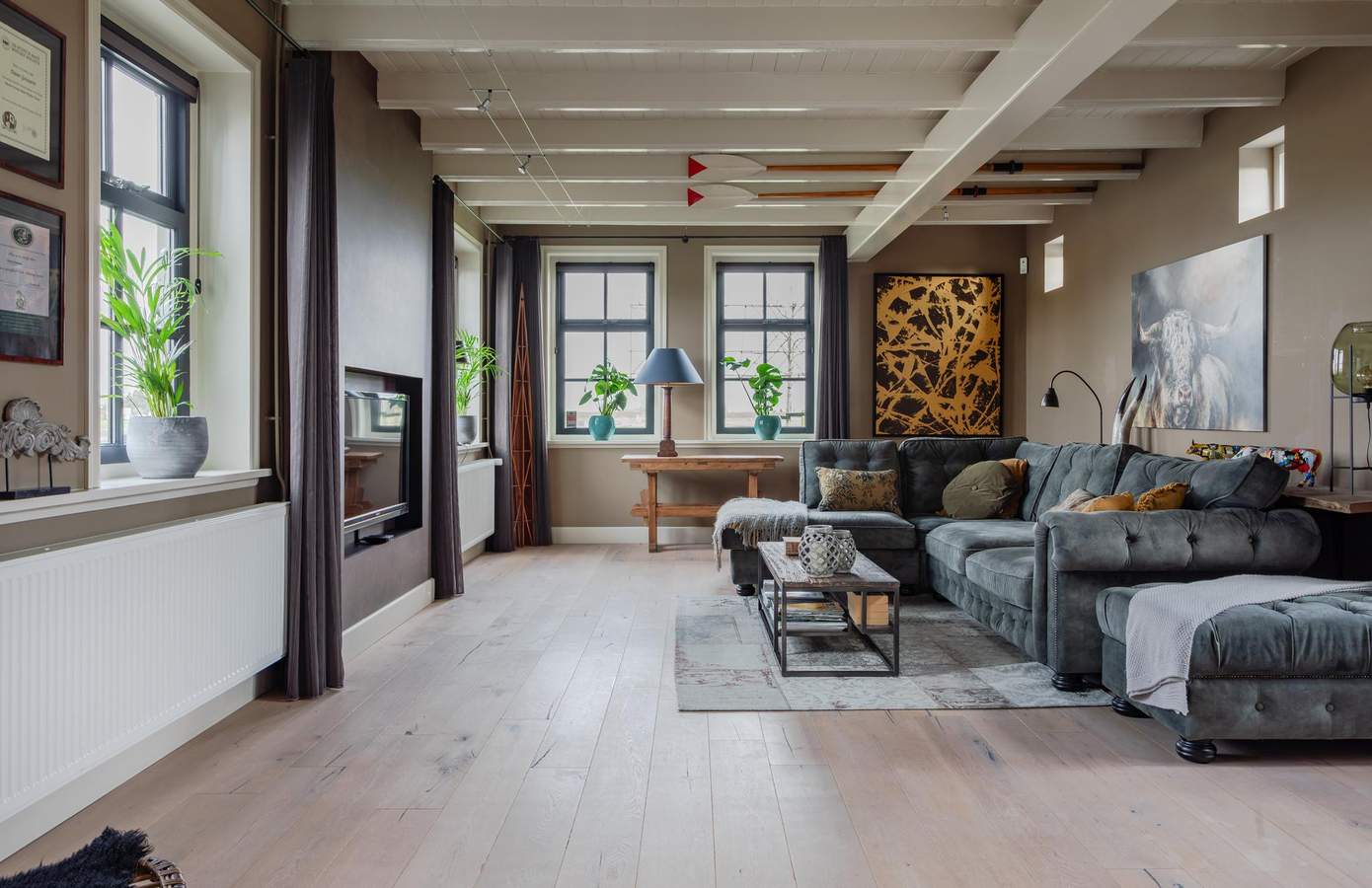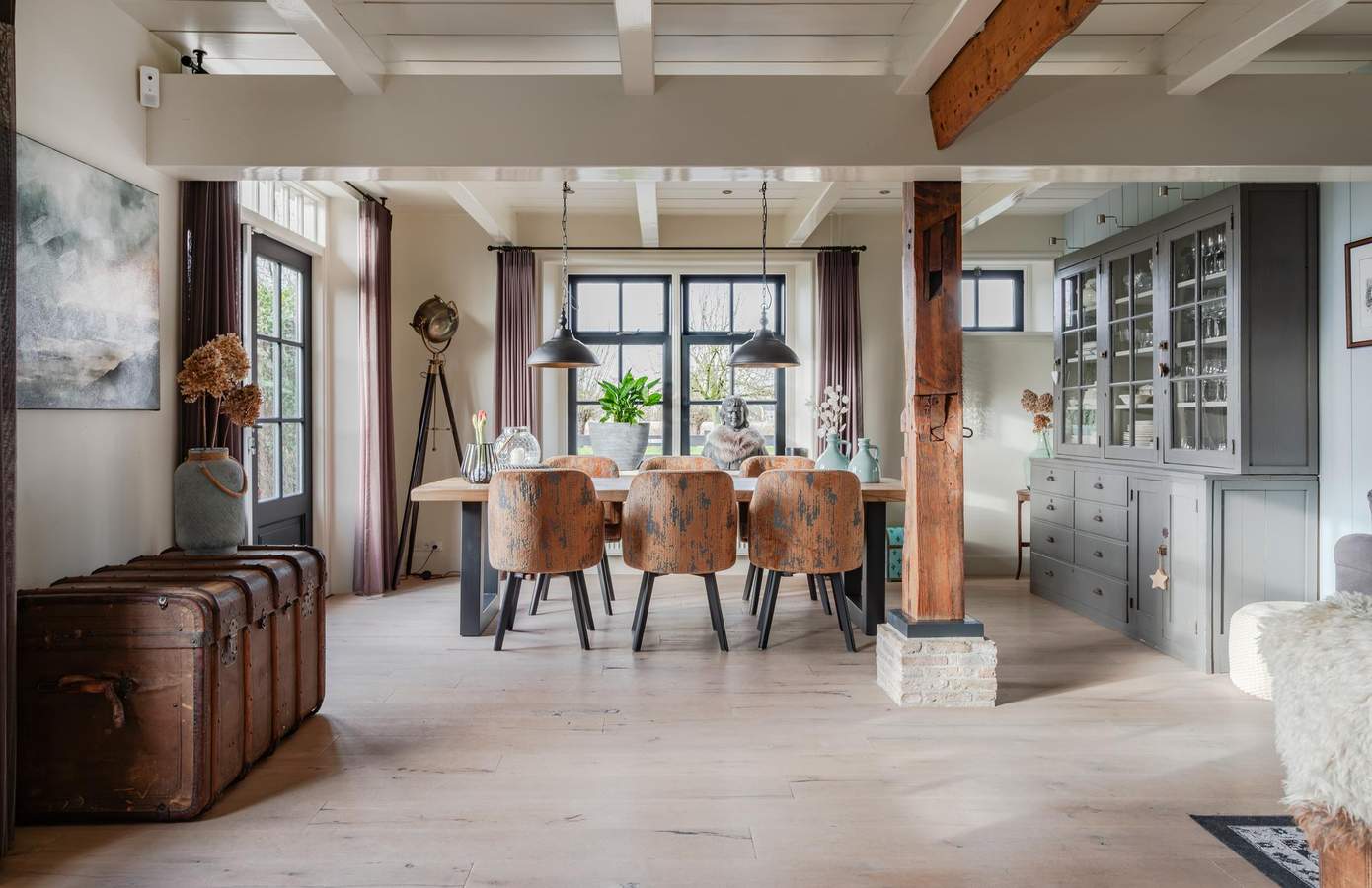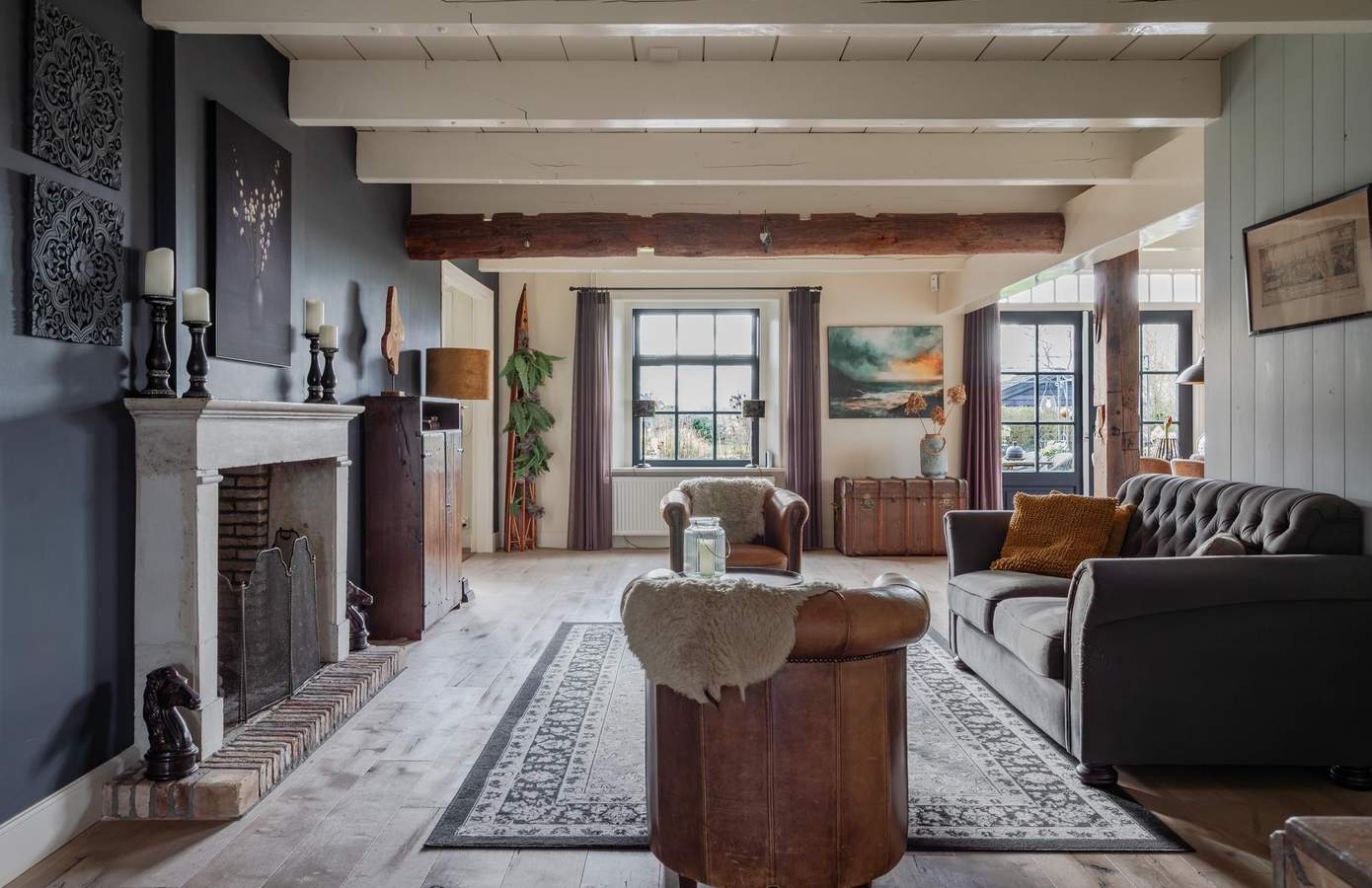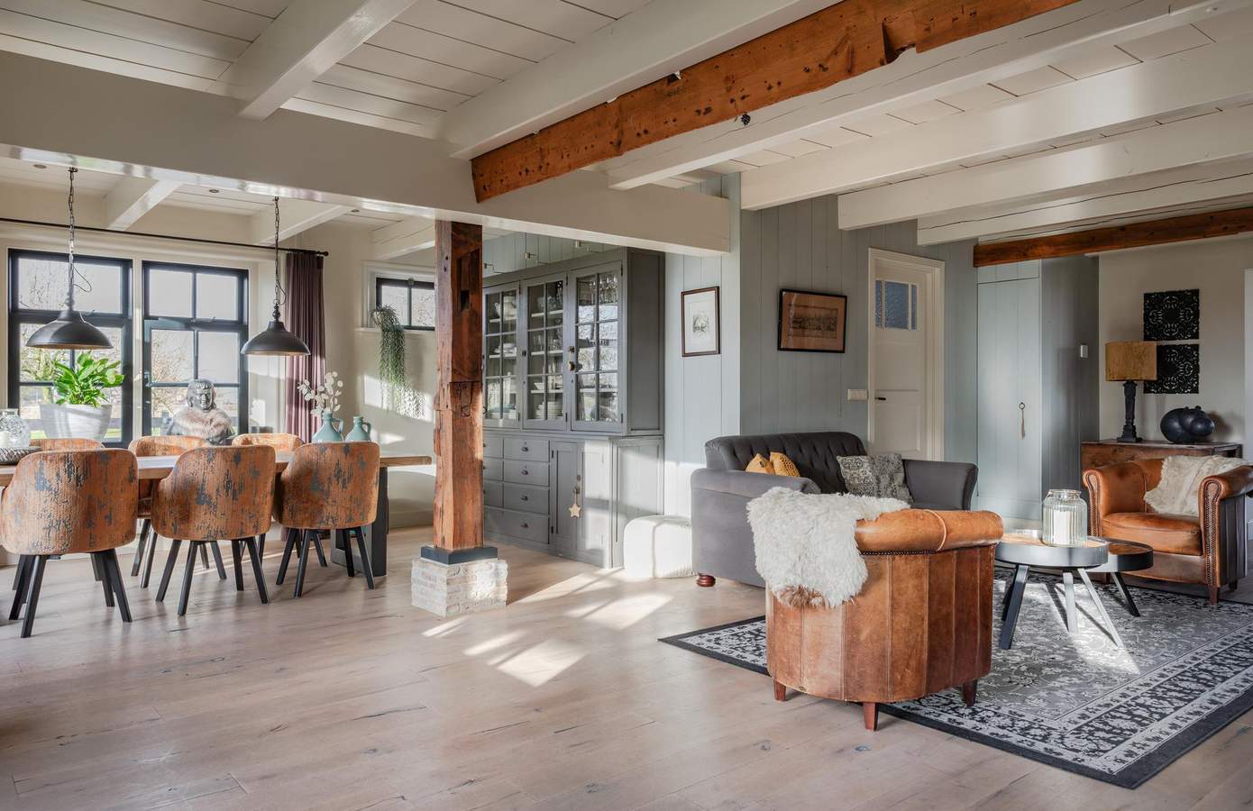 Bij binnenkomst ervaart u direct de sfeer die dit huis zo bijzonder maakt. Originele deuren op de begane grond, balklagen die zichtbaar zijn gelaten en een indrukwekkend vierkant waarvan de palen elk hun eigen geschiedenis vertellen. Een aantal palen zijn afkomstig van een schip, de andere van een molen, met de windstreken in het hout gekerfd. Bij de renovatie is het vierkant volledig verplaatst en daarna exact teruggezet op een nieuwe fundering. Onder de poeren ligt, volgens oud gebruik, een stuiver voor geluk.