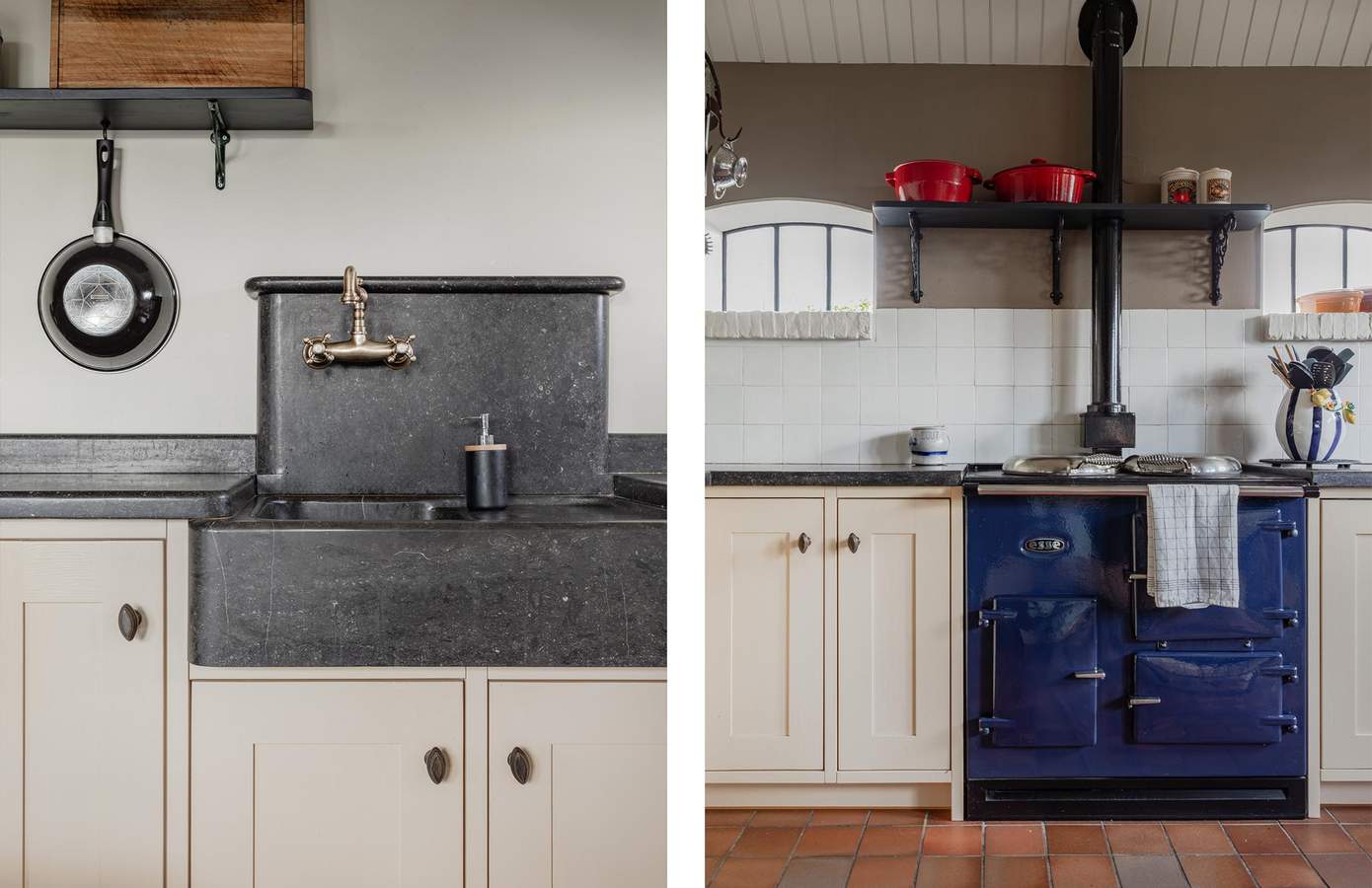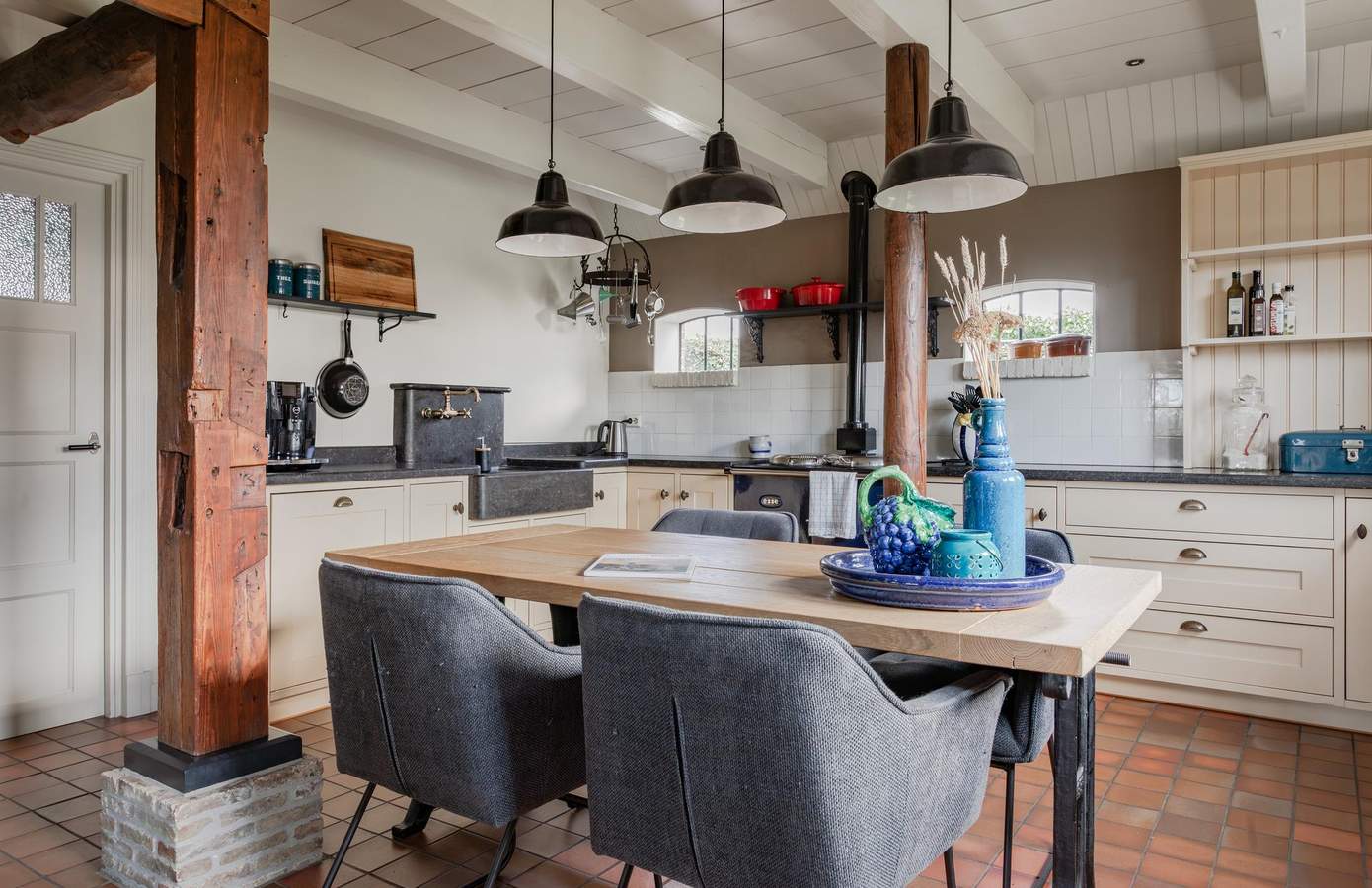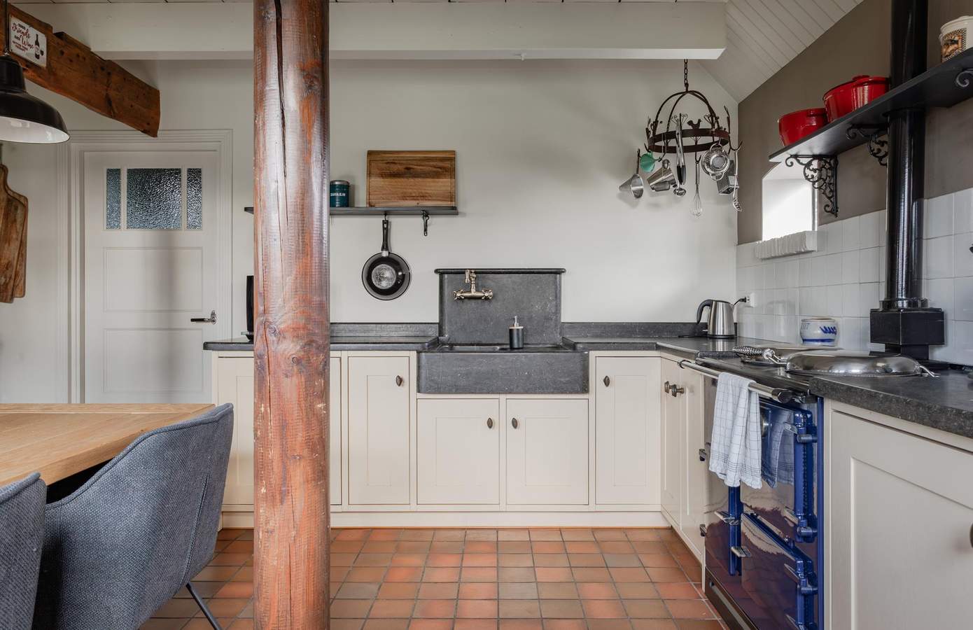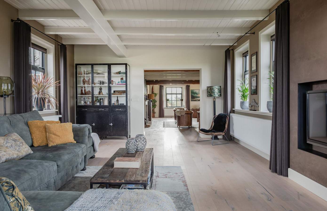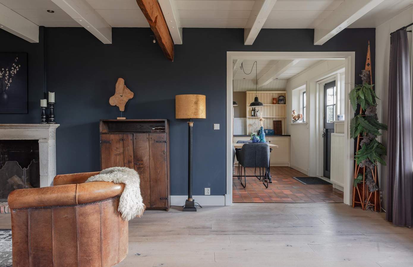 De woonkamer aan de voorzijde biedt de mogelijkheid om relatief eenvoudig een slaapkamer en badkamer op de begane grond te realiseren, waardoor levensloopbestendig wonen tot de opties behoort. De eethoek aan de achterzijde heeft uitzicht op de tuin. De keuken past perfect bij het karakter van de boerderij, een gezellige landelijke woonkeuken. Vanuit de keuken bereikt u de bijkeuken, waar authentieke details bewaard zijn gebleven, waaronder een plank die hier al sinds circa 1900 hangt.