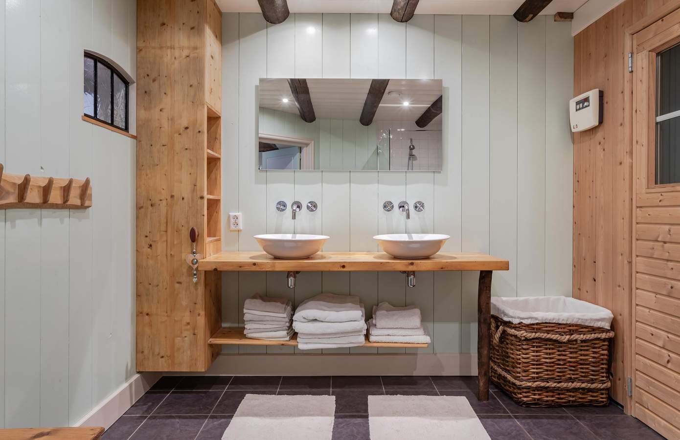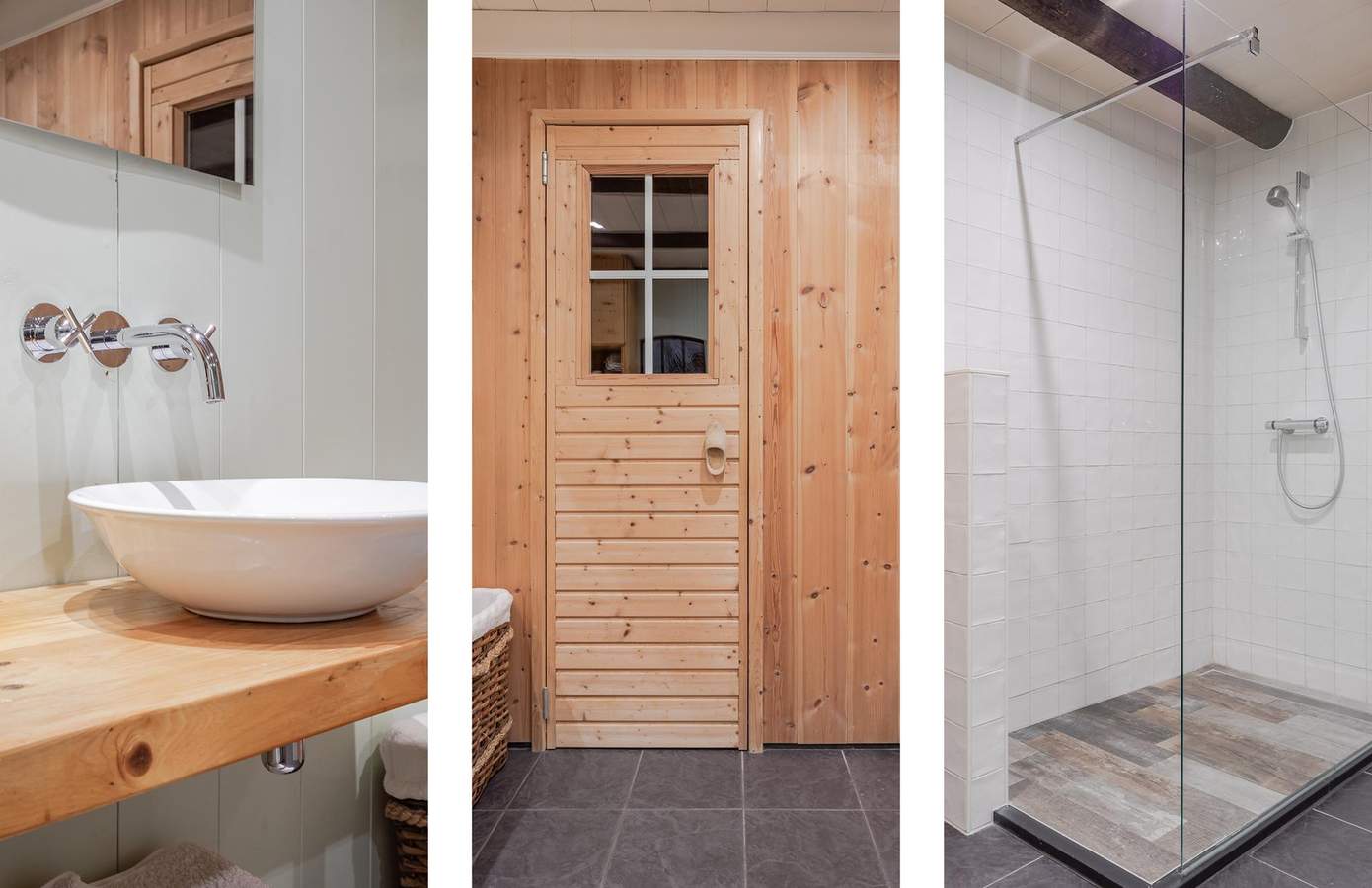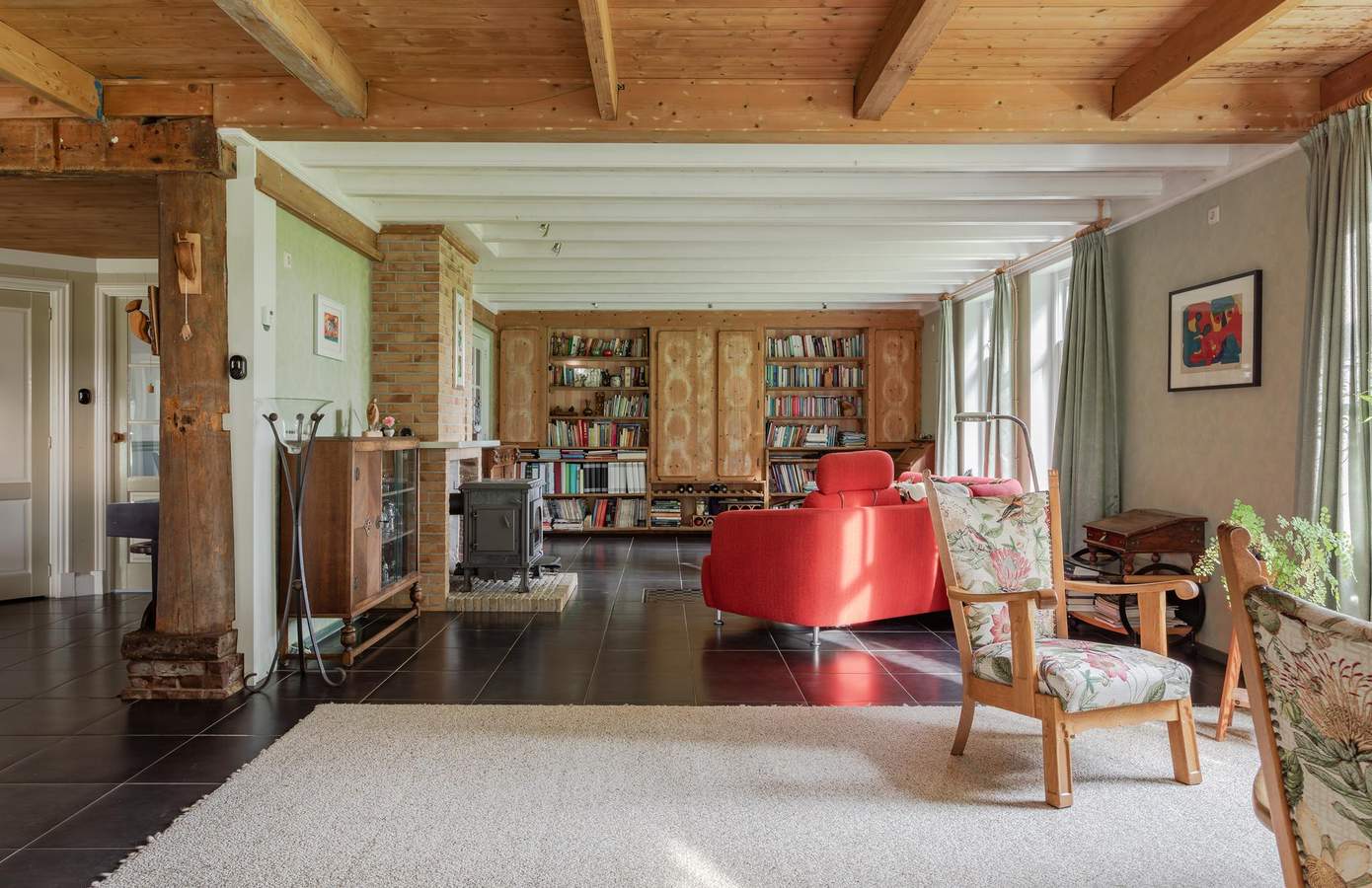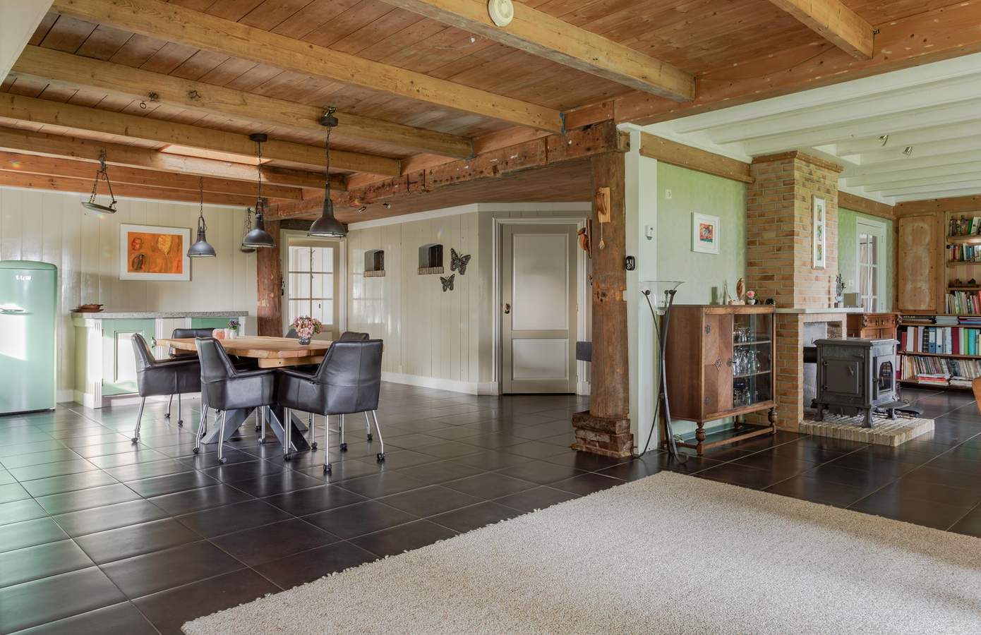 De huidige eigenaren hebben met liefde en zorg hergebruik gemaakt van materialen, van de overkapping tot het badkamermeubel, de kastenwanden en zelfs een kaasplankenkast in de woonkamer. De woonkamer vormt het hart van de woning, met een gezellige spekstenen houtkachel en een schaakbord in de vloer ervoor. Grote ramen met HR beglazing vullen de ruimte met licht, terwijl vloerverwarming op de gehele begane grond voor een behaaglijk gevoel zorgt. De keuken is uitgerust met een groot granieten werkblad en bevindt zich aan de tuinzijde van de boerderij. U kunt hier koken terwijl u door het raam een schilderij aanschouwt. Stalraampjes in de woonkamer en de badkamer op de begane grond brengen een stukje geschiedenis in de woning. Op de begane grond vindt u de bijkeuken met wasmachine- en drogeraansluiting, een ‘bij-bijkeuken’ met een werkbank, de dars (momenteel in gebruik als berging), een slaapkamer/kantoor en een badkamer. Als u naar de eerste verdieping gaat, vindt u drie ruime slaapkamers en een grote badkamer. Hier zijn alle houten balken in het zicht, evenals het vierkant dat door de gehele boerderij terugkomt.