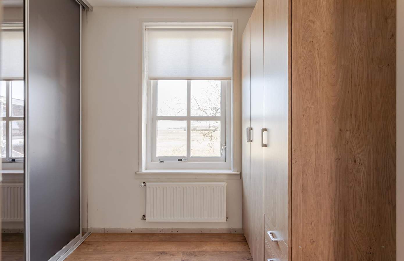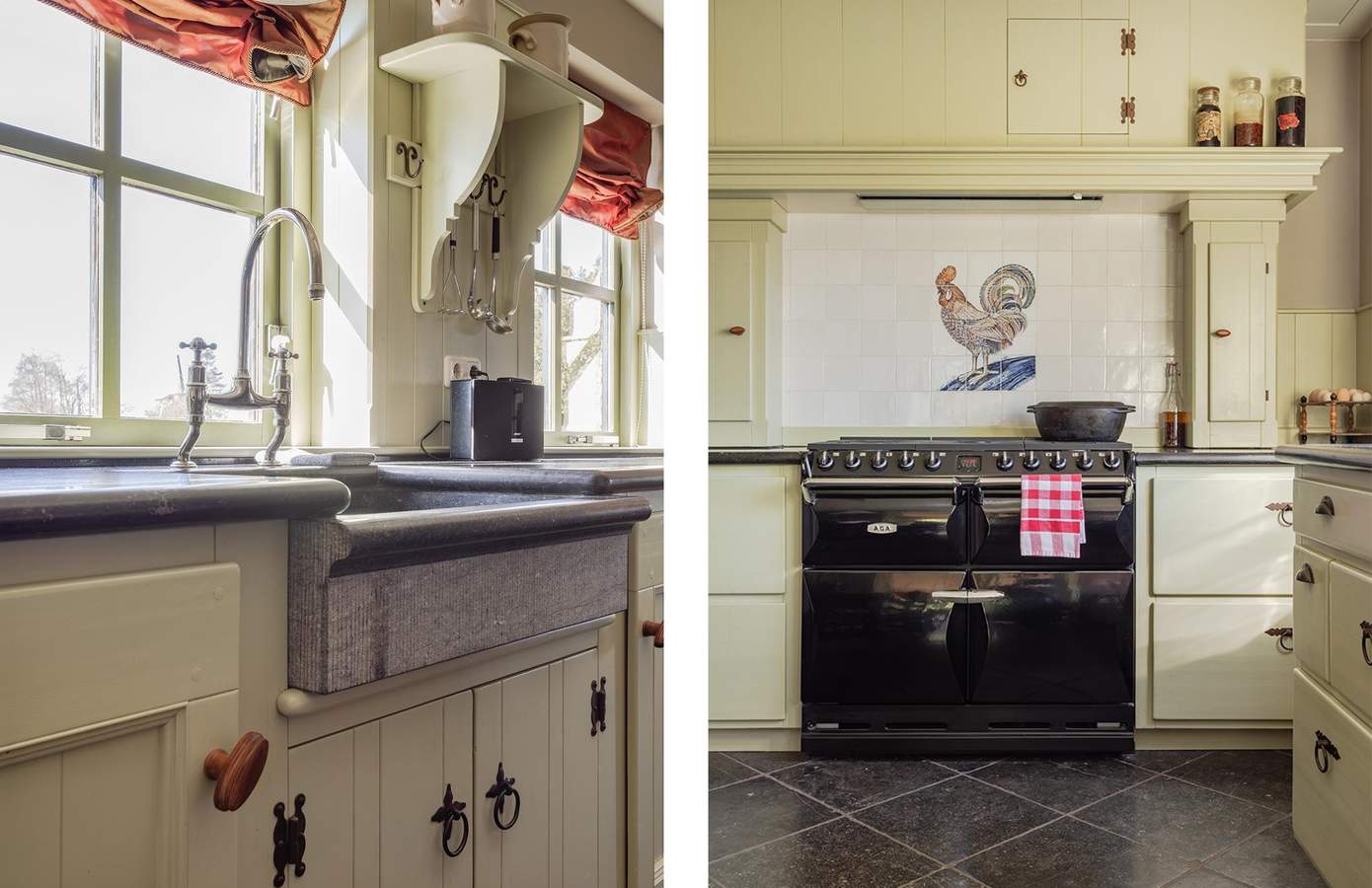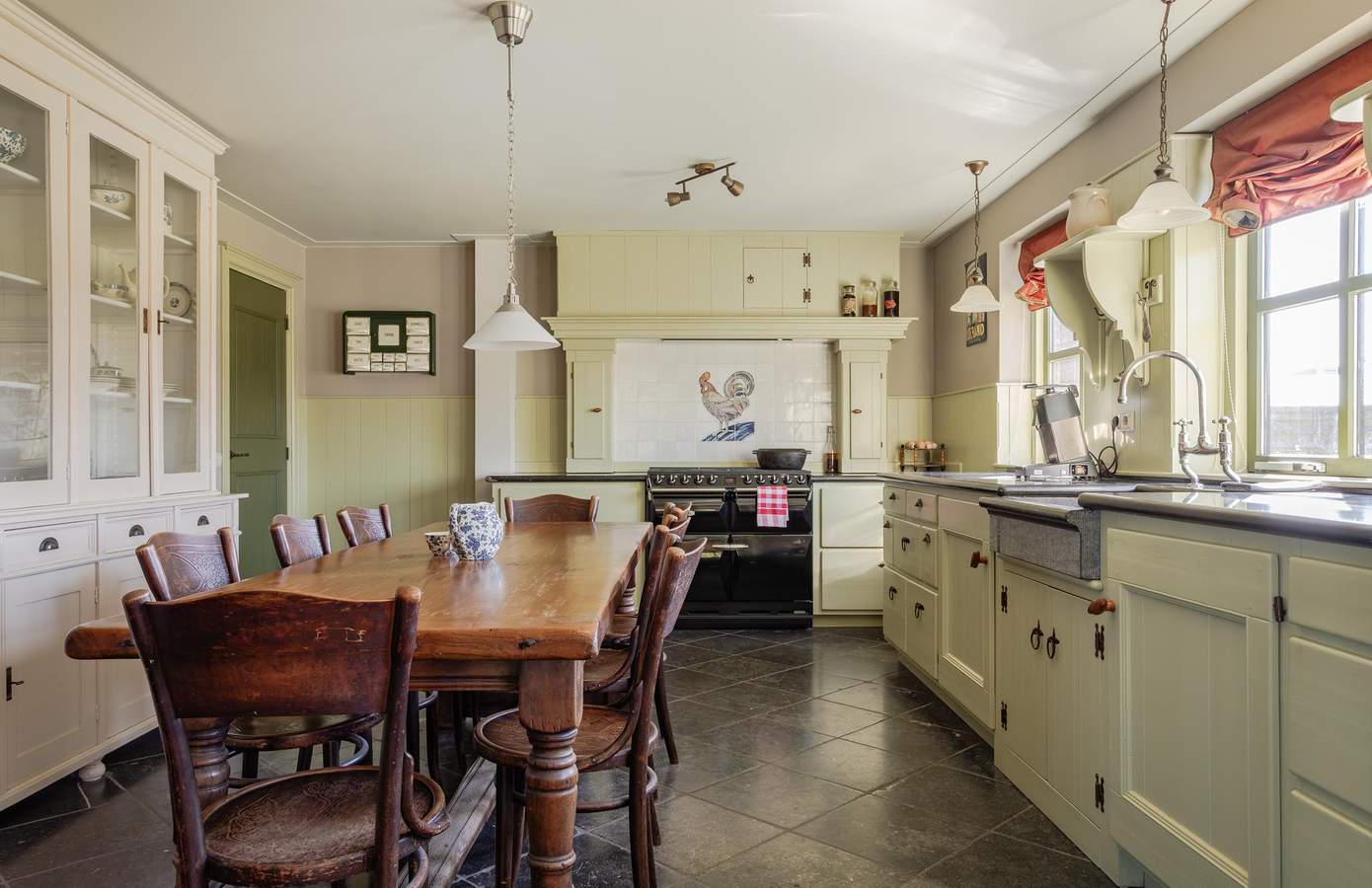 Binnen wordt u direct verwelkomd door warmte en vakmanschap. In de handgemaakte, traditionele houten keuken staat een nieuwe AGA-fornuis met grill, warmhoud- en twee heteluchtovens. De deuren in deze keuken — afkomstig uit een Belgisch klooster — klappen naar beide zijden open. Het werkblad is van Belgisch hardsteen, met een indrukwekkende gootsteen die uit één steen gehouwen is. De vloer in de woonkamer is gelegd met robuuste grenendelen. De darsdeuren, speciaal voor deze boerderij ontworpen, zijn voorzien van ramen die uitkijken over de uitgestrekte weilanden — met in de verte de skyline van Alkmaar. Op de eerste verdieping zijn twee kamers, een ruime badkamer, een vide en een aparte wasruimte. De tweede verdieping biedt een grote slaapkamer, met de mogelijkheid om hier eenvoudig twee aparte kamers te realiseren.
