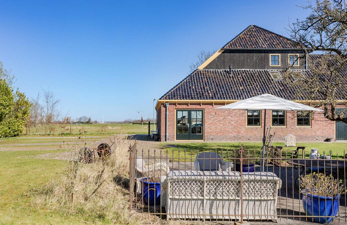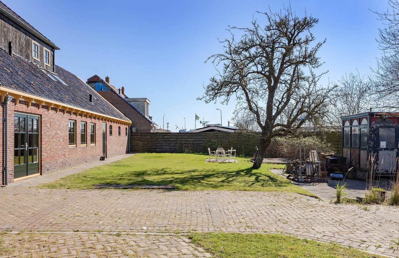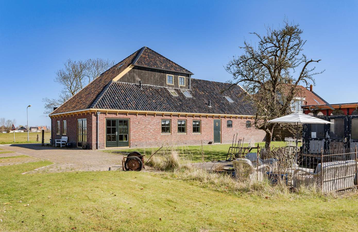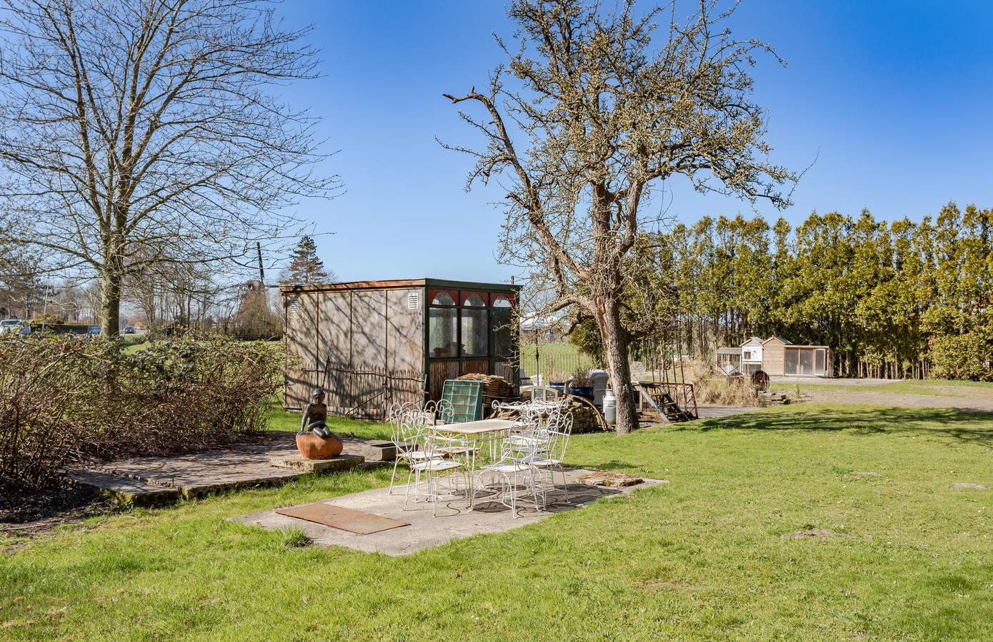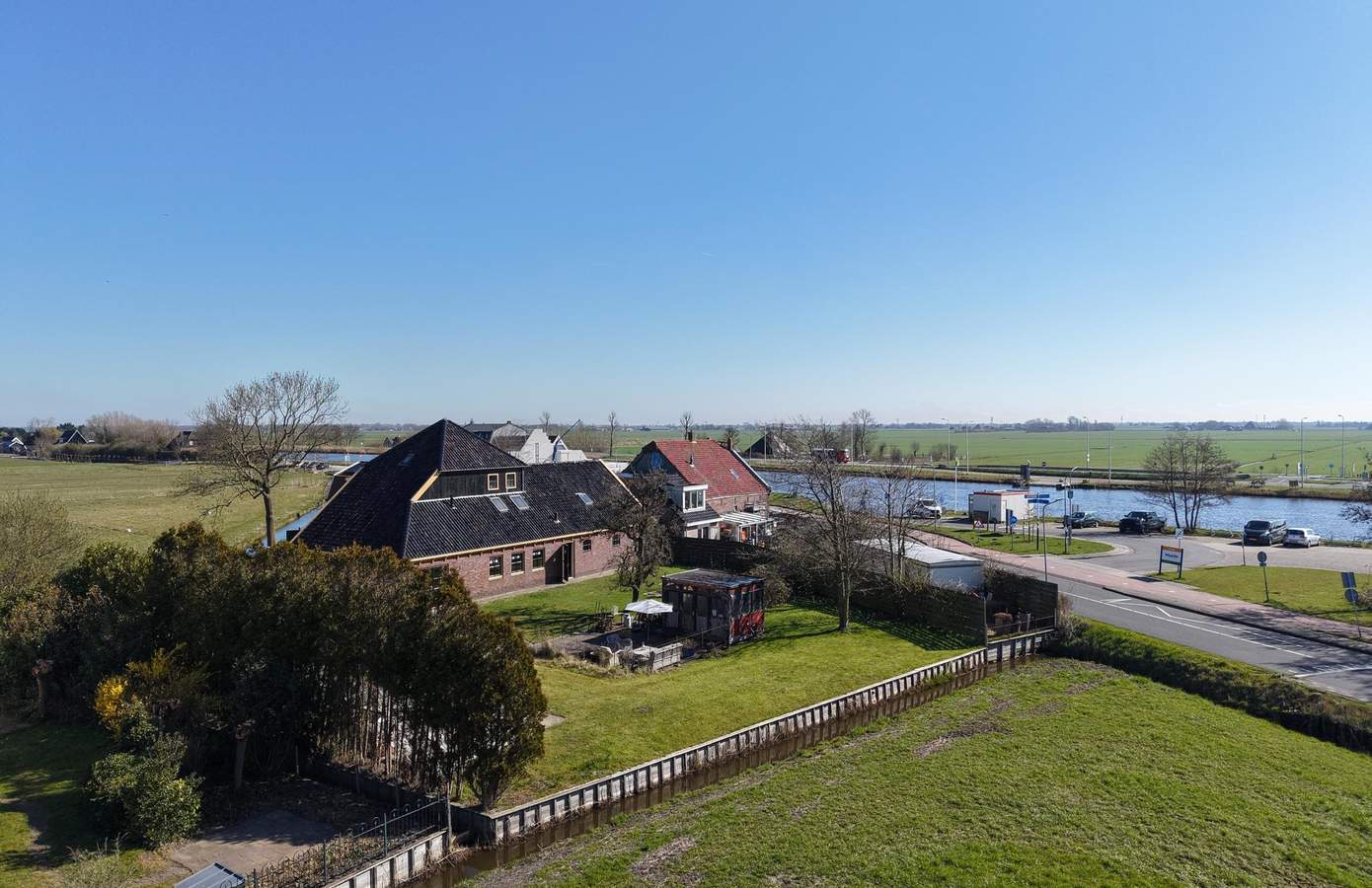 Op het erf is ruimte in overvloed: zeven parkeerplaatsen en een ruim opgezette tuin. In de tuin lopen kippen en staat een tuinhuis, van origine een oude bloemenstal van het NS-station in Haarlem. Aan de overkant van de weg is nog eens ruim een hectare weiland optioneel beschikbaar. En voor wie het water op wil: recht tegenover het huis is een plek om een boot te water te laten. Hier bepaalt u zélf het uitzicht, elke dag opnieuw.