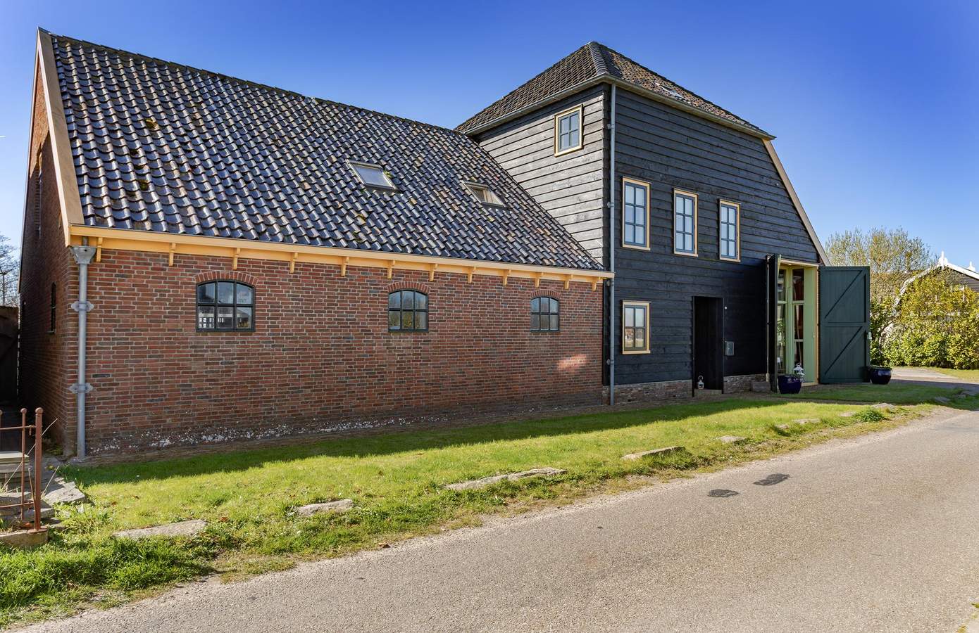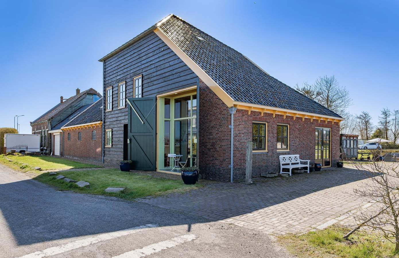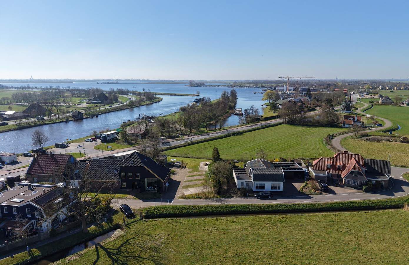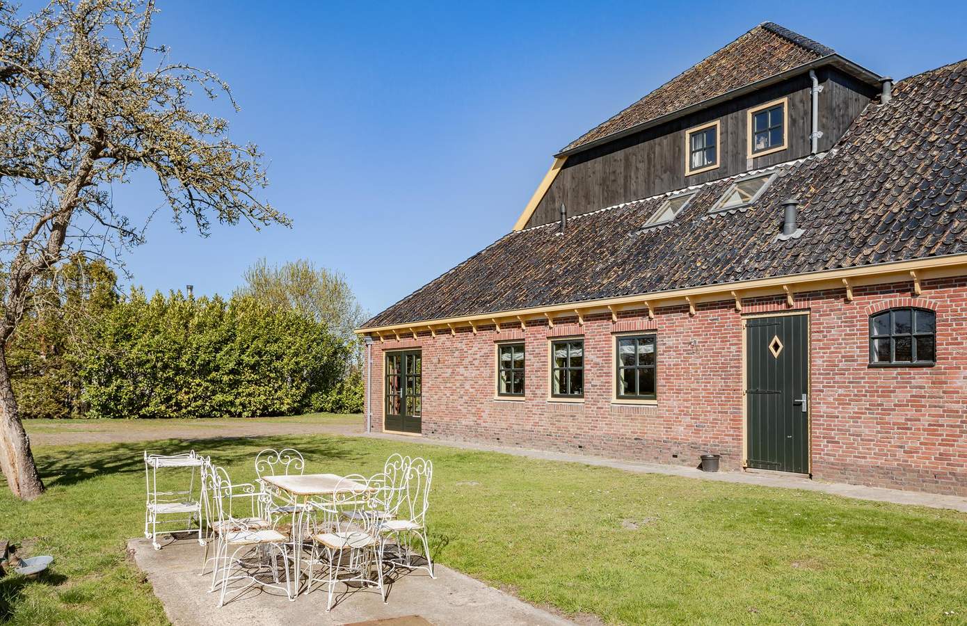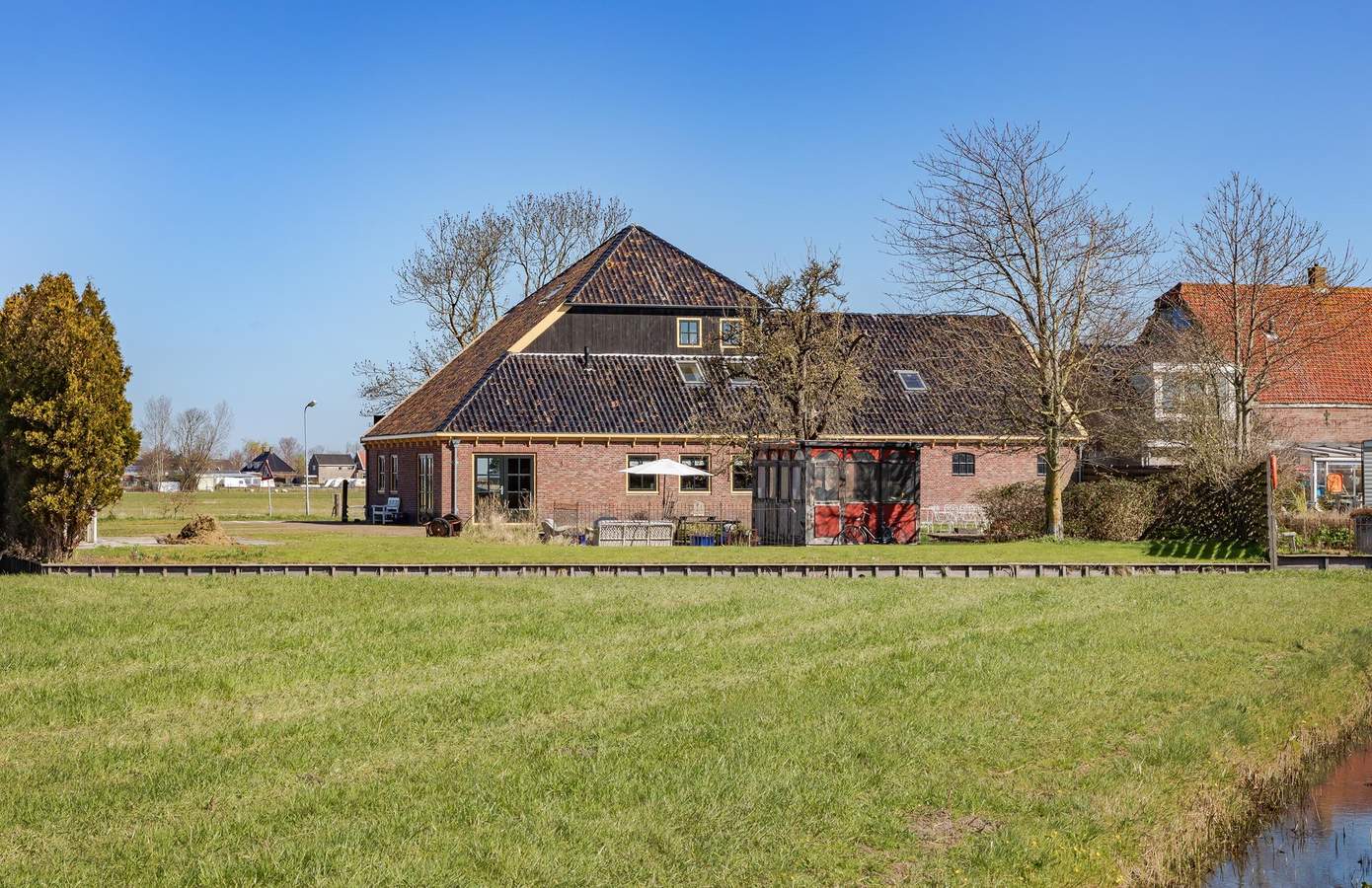 Op het erf is ruimte in overvloed: zeven parkeerplaatsen en een ruim opgezette tuin. In de tuin lopen kippen en staat een tuinhuis, van origine een oude bloemenstal van het NS-station in Haarlem. Aan de overkant van de weg is nog eens ruim een hectare weiland optioneel beschikbaar. En voor wie het water op wil: recht tegenover het huis is een plek om een boot te water te laten. Hier bepaalt u zélf het uitzicht, elke dag opnieuw.