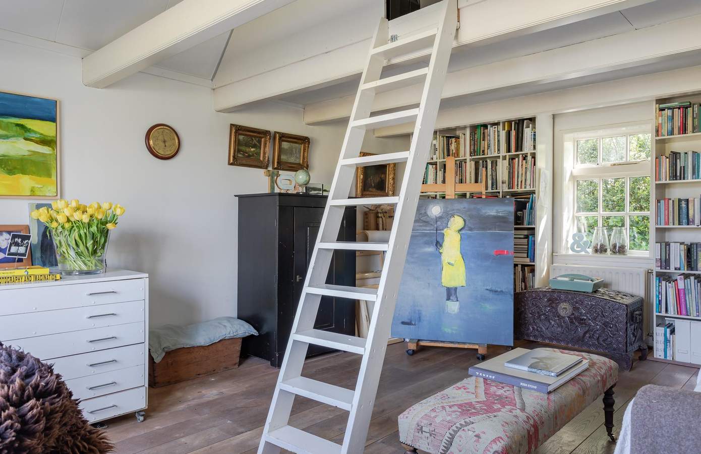 De eerste verdieping heeft een tweede slaapkamer met vaste kastenwand en een tweede badkamer, voorzien van een dubbele wastafel, douche en toilet. Ook is hier nog een grote bergruimte onder het dak.