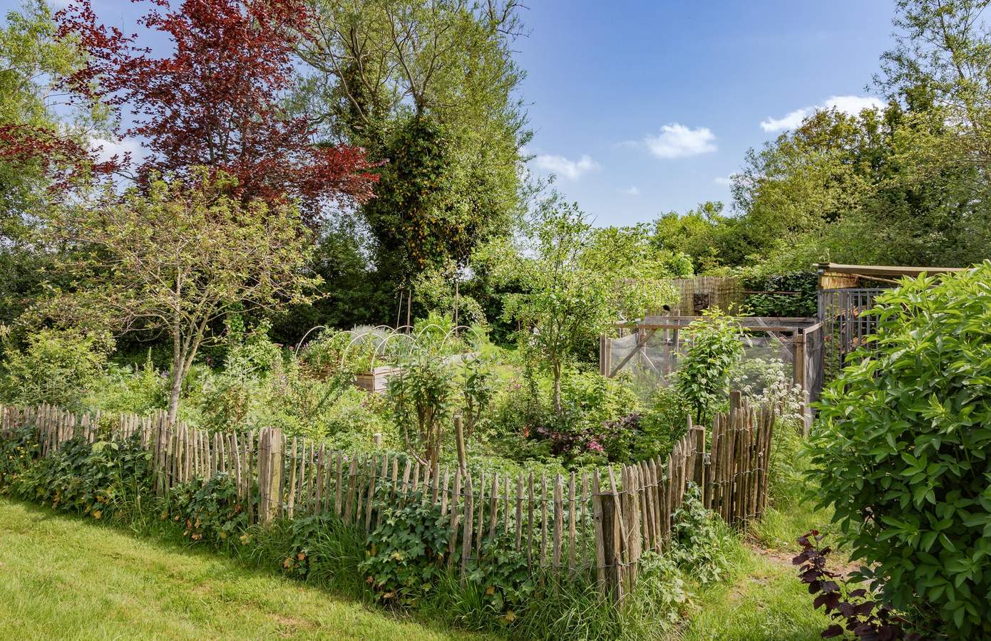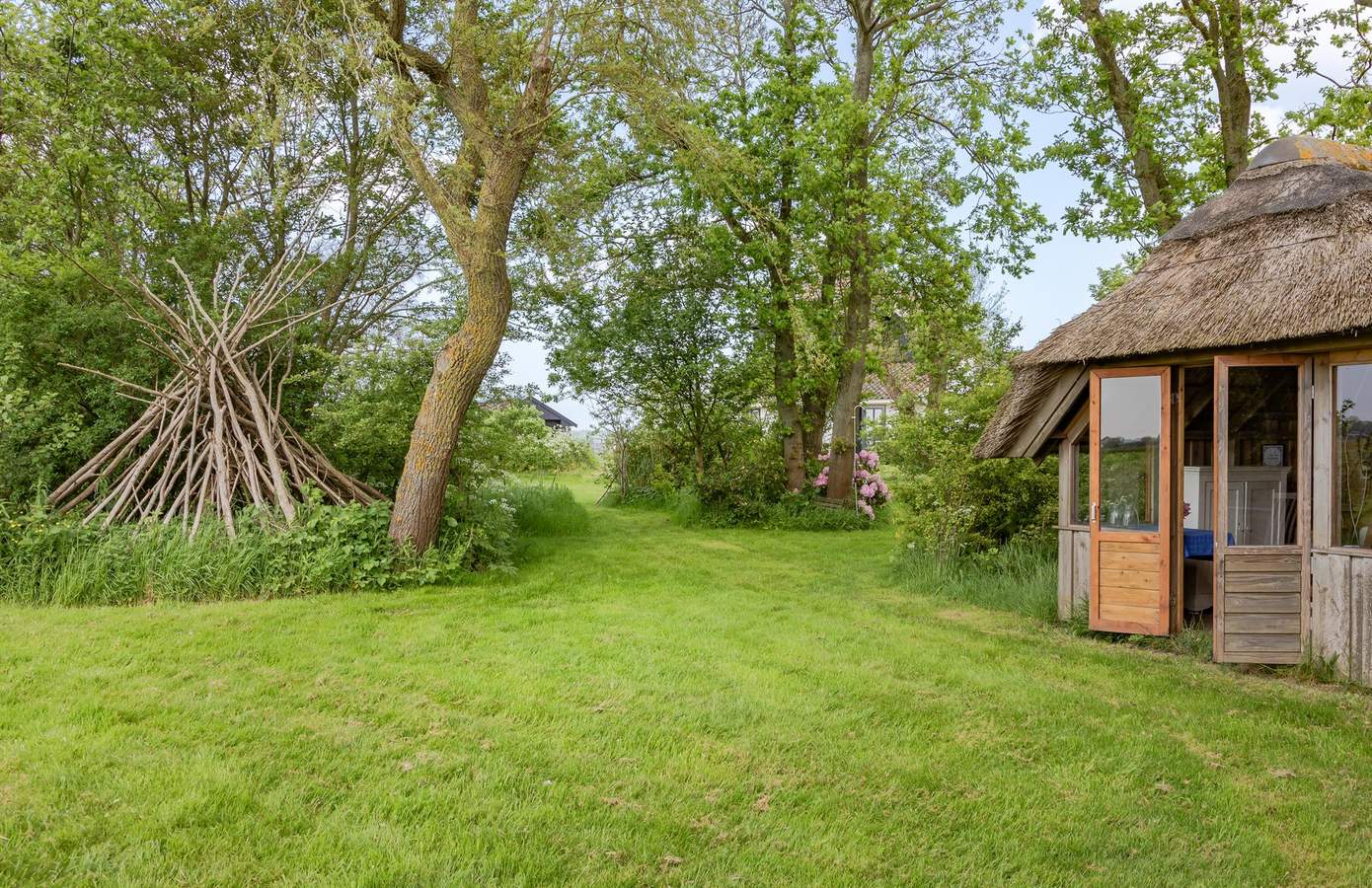 Wat een fantastische tuin! Het perceel wordt omgeven door weilanden en vogelrijke bosschages. Vanaf het terras heb je een prachtig uitzicht over de landerijen. De bloemen- en groentetuin bevindt zich aan de oostkant nabij de keuken. Er is een moestuin met twee hobbykassen waar tomaten, komkommer en paprika worden gekweekt en er staan talrijke fruitbomen verspreid door de tuin. Ook is er een grote vijver. Tegen de oostgrens staat een prieel verscholen, waar je in alle rust van de natuur kunt genieten. Het weiland biedt de mogelijkheid om dieren te houden.