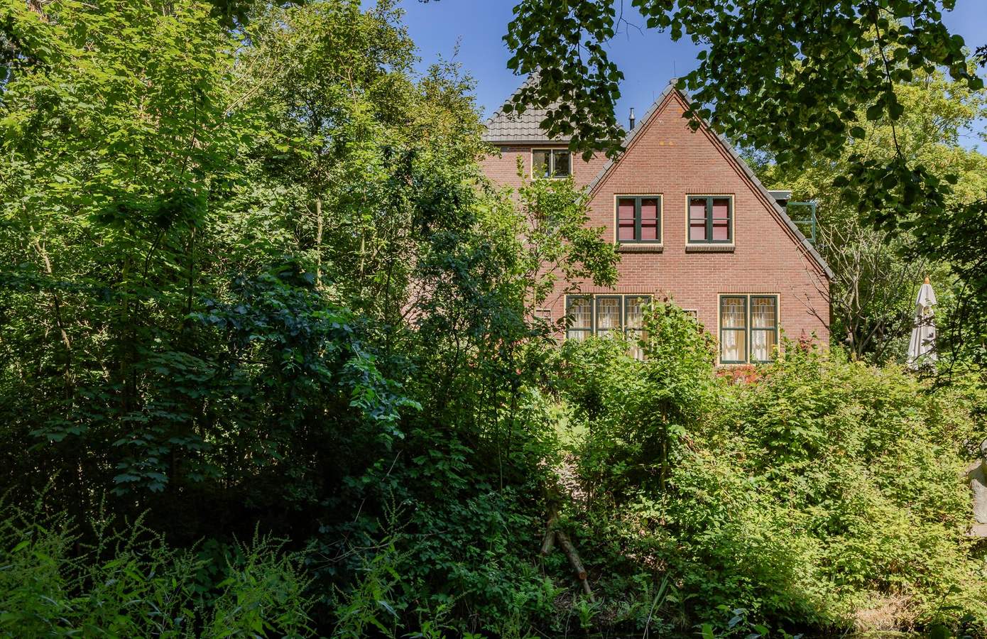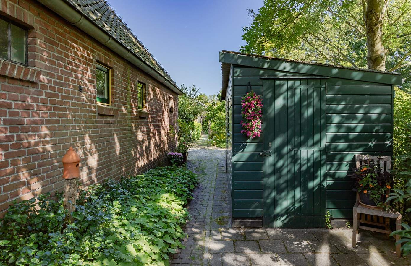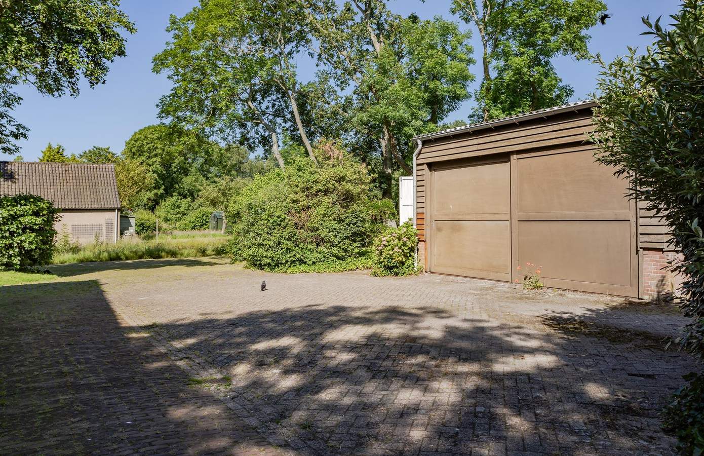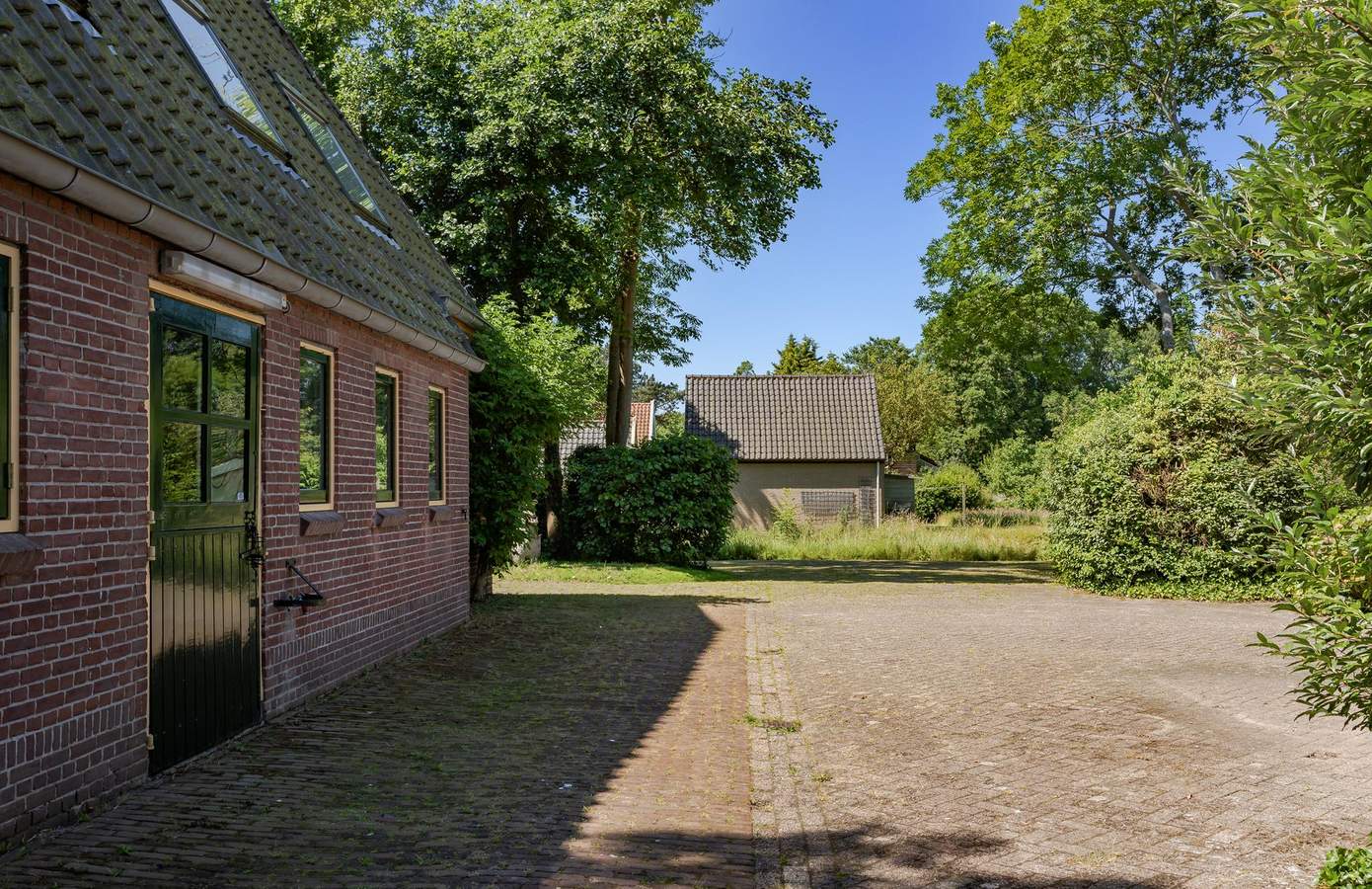 De woning is vanaf de weg bijna onzichtbaar, verscholen achter het groen en daarmee voorzien van veel privacy. De gemeenteweg naast het erf geeft toegang tot de boerderij. Hier is voldoende plek om meerdere auto’s te parkeren. In de garage (voorzien van dubbele deur) is plek om vier auto’s te parkeren. Het naastgelegen bijgebouw is het perfecte atelier, maar uiteraard ook goed te gebruiken als schuur of een mantelzorgwoning. Ook hier mogelijkheden genoeg. Het perceel biedt veel zonnige hoekjes en schaduwplekken.