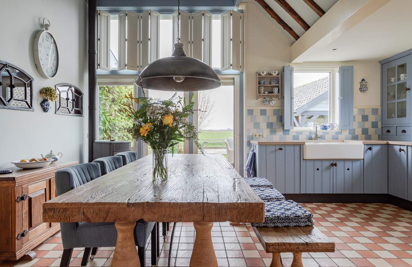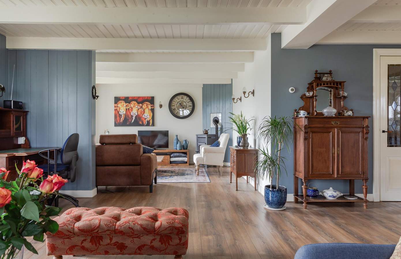De woonkeuken gelegen in de dars van de boerderij is gehuld in frisse landelijke stijl en voorzien van een sfeervolle pelletkachel en een prachtig hoog plafond met sparren en luiken voor de ramen. De keuken nodigt uit tot heerlijk koken en gezellig samenzijn. En suite deuren met glas-in-lood leiden naar de ruime woonkamer waar mooie luiken voor de ramen een charmant tintje toevoegen aan de ruimte. Het is hier heerlijk licht door de ramen rondom. Een pelletkachel zorgt voor extra sfeer en verwarmin naast de al aanwezige vloerverwarming. Het landelijke en sierlijke karakter is in de gehele woning doorgetrokken.