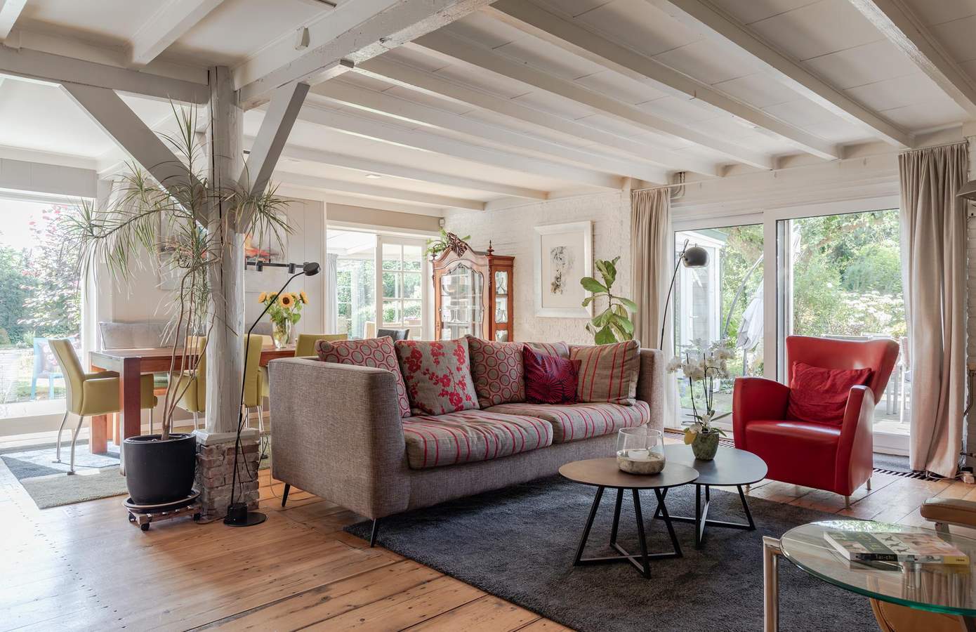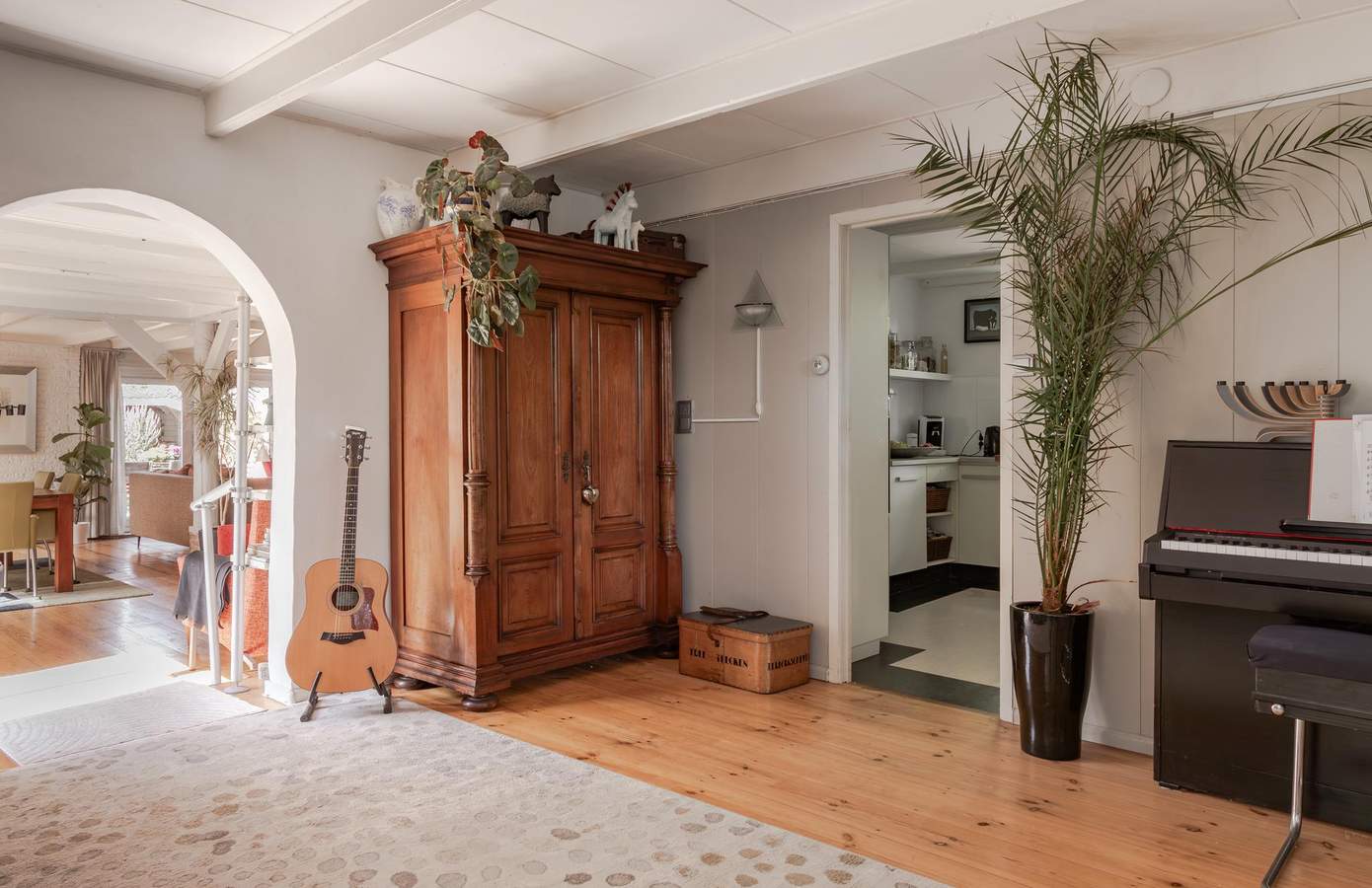 Het frisse, witgestuukte voorhuis met plat dak vormt het oorspronkelijke deel van de woning en herbergt onder meer de keuken, een praktische hobbykamer en op de verdieping maar liefst vier (slaap)kamers. Dit deel van het huis straalt eenvoud, rust en functionaliteit uit.
