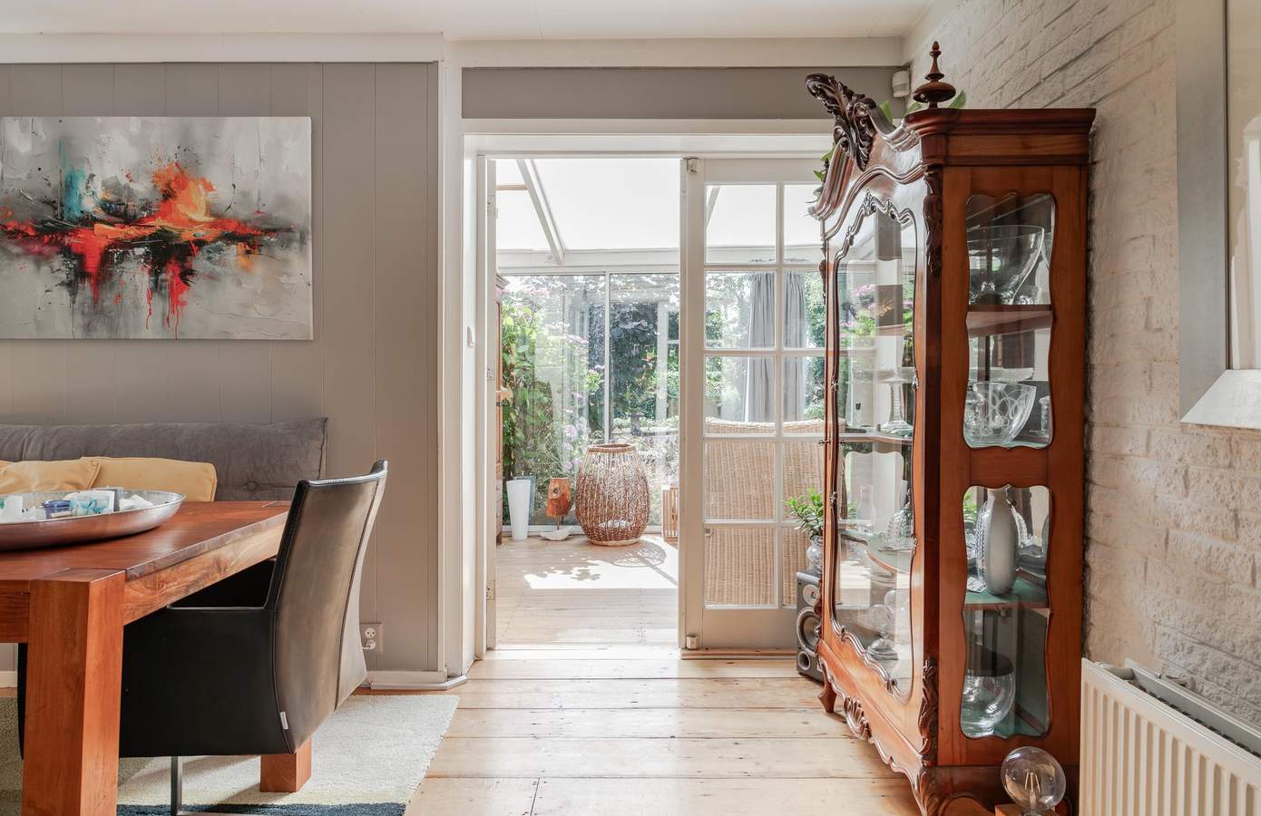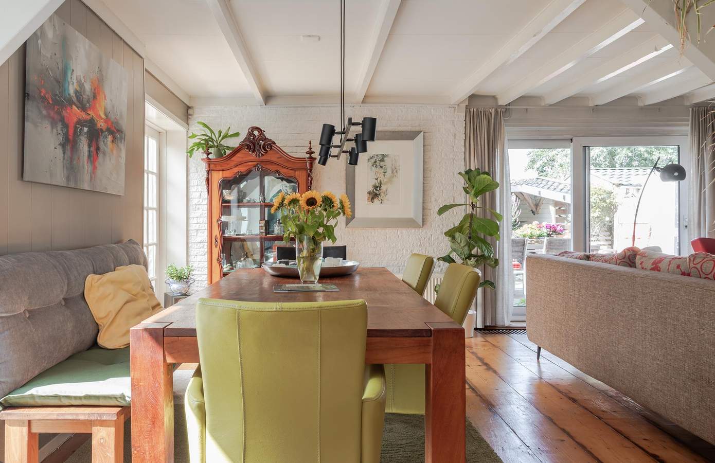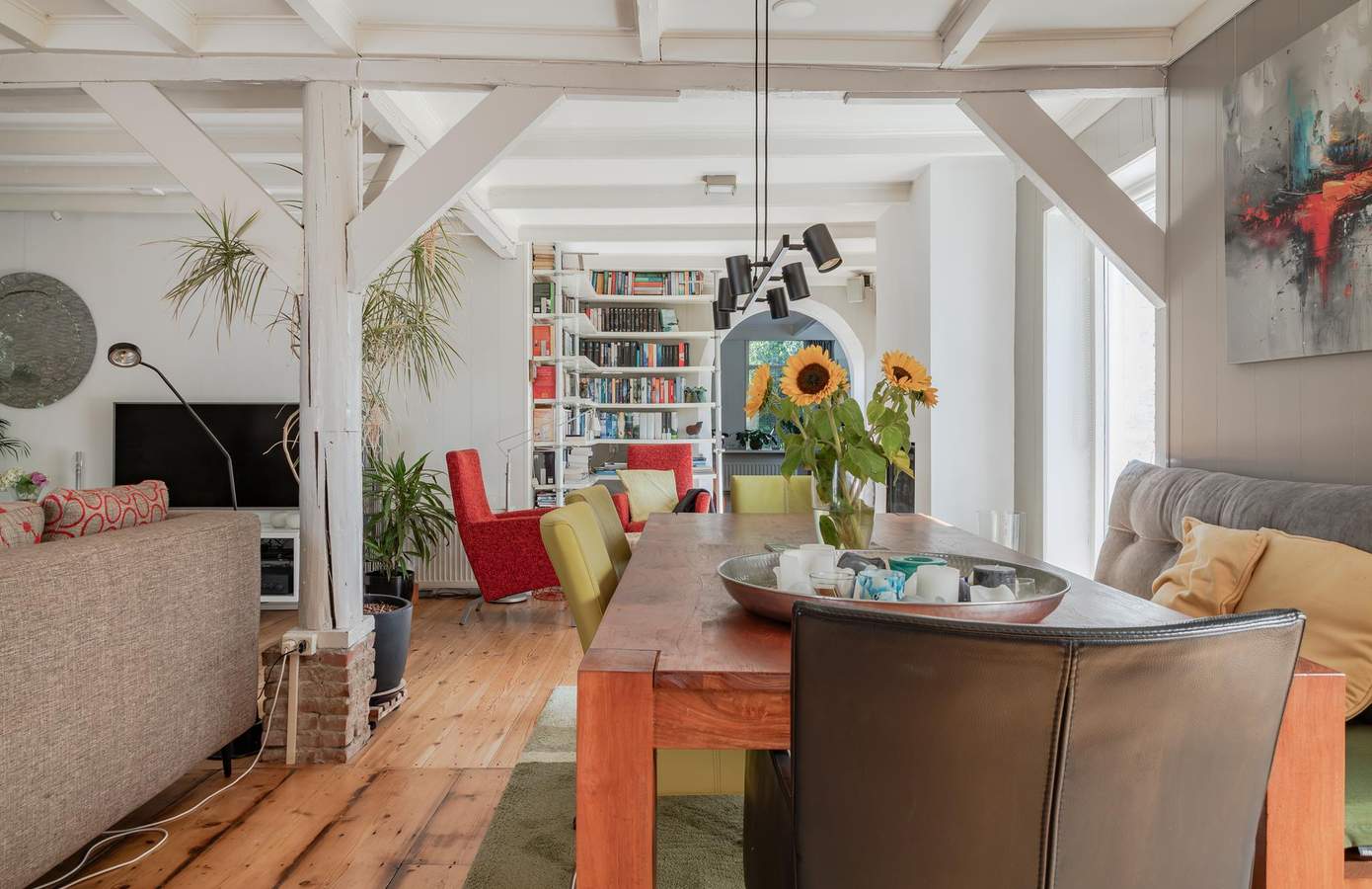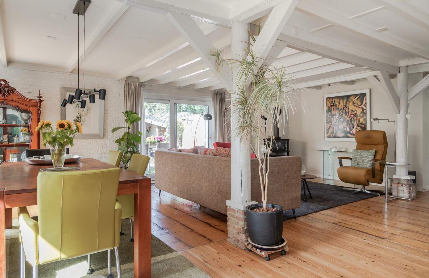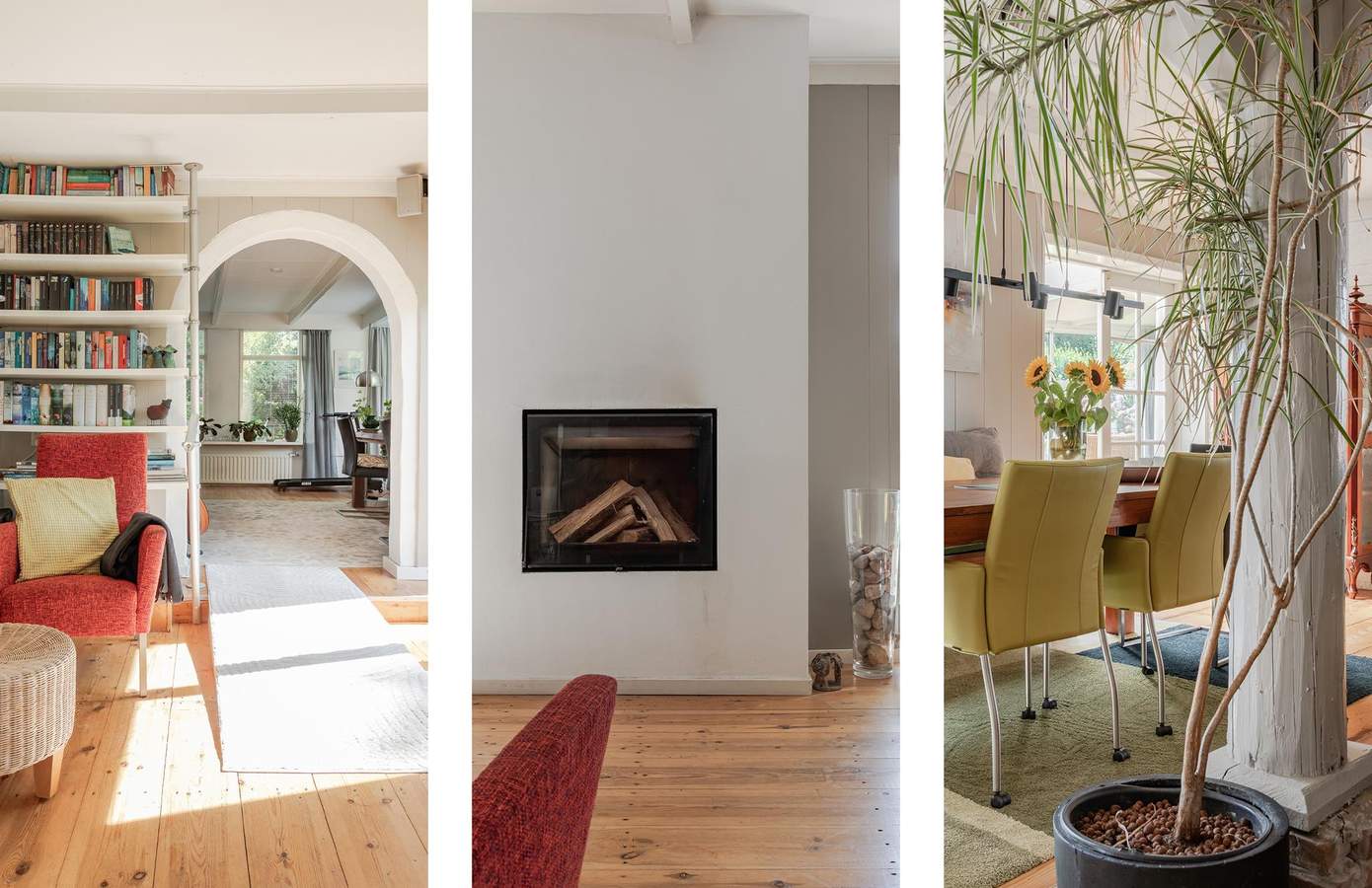 Wat direct opvalt, is hoe soepel het voorhuis overgaat in het achtergelegen stolpgedeelte – een indrukwekkend bouwvolume dat later is aangebouwd, maar aanvoelt alsof het er altijd al is geweest. De stolpschuur, is zowel visueel als functioneel volledig opgenomen in de woning. Hierdoor ontstaat een bijzondere maar kloppende woning onder één kap.