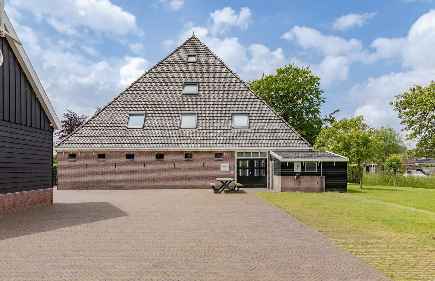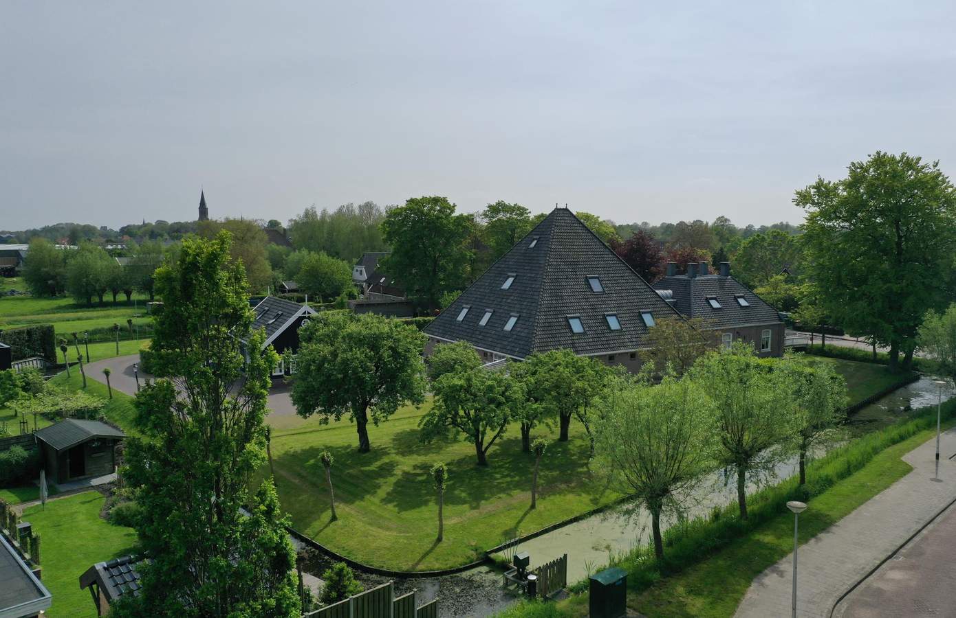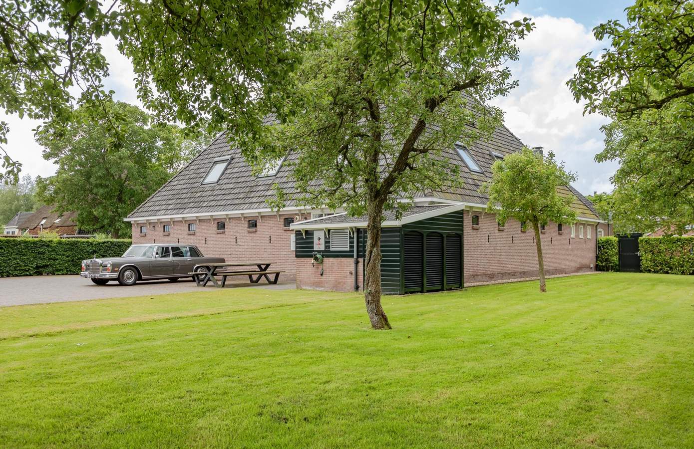 De stolpboerderij is een monument, daterend uit 1910. Het bevatte woonruimtes, maar werd vooral gebruikt om de koeien te melken en de oogst uit de boomgaard te verwerken. De enorme inhoud biedt nu een zee aan mogelijkheden, van royaal wonen tot bedrijf aan huis of zorgfunctie. Rondom uitstekend geïsoleerd, voorzien van vloerverwarming en van buiten met de grootst mogelijke zorg in oude glorie hersteld. De boerderij heeft drie toegangen van buitenaf en een binnendoor. Laatstegnoemde bevindt zich in de gang die de boerderij verbindt met het voorhuis. Deze deur leidt naar ‘de groene kamer’, zoals ook de oorspronkelijke bewoners het al noemden. Gevoelsmatig hoort deze kamer bij het voorhuis. Het is voorzien van een meterslange wandkast, wasmachine-aansluiting en een badkamer met toilet. Dat maakt het geschikt als slaap-, hobby- of praktijkruimte. De groene kamer grenst aan de volgende multi-inzetbare ruimte, nu oefenruimte voor de drummer des huizes. Het vierkant en de dars zijn omgetoverd tot een strakke garage c.q. werkplaats. Grote ingang, veel licht en hoogte, vloerverwarming, krachtstroom, perslucht, water en waterafvoer: alles is er. Zelfs de oude balken in het zicht en wanden in de originele kleur blauw. Rechts van de werkplaats bevinden zich de luxe uitgevoerde waskamer (met meterkast) en een extra werkkamer. Achterin de boerderij vindt u een doucheruimte met heren- en damestoilet. Hoogwaardig sanitair, een gestorte granieten vloer, maatwerk houten deuren: ook hier is alles tiptop afgewerkt. Waar vroeger de koeien op de regel stonden, is nu een luxueuze relax- en trainingsruimte. Het originele balkenplafond en het binnenmuurtje bij de keuken herinneren aan weleer. De L-vormige ruimte met tuindeuren is ook om te bouwen tot woonkamer. Vergunningen voor extra grote raampartijen zijn al aanwezig. Opnieuw een unieke aanblik. Rondom het vierkant is één grote, open kantoorvloer gemaakt, rustend op de in 2008 aangebrachte staalconstructie. Hier is ruimte voor minstens tien werkplekken. De ene kant van de U-vorm eindigt in de kantine met keuken. Aan de andere kant vindt u een dames- en herentoilet, berging en een enorme serverkast. Kortom, een werkomgeving die de productiviteit op elke mogelijke wijze stimuleert, inclusief airco, automatische luchtverversing en de eeuw-oude constructiebalken als sfeerbepalende elementen.