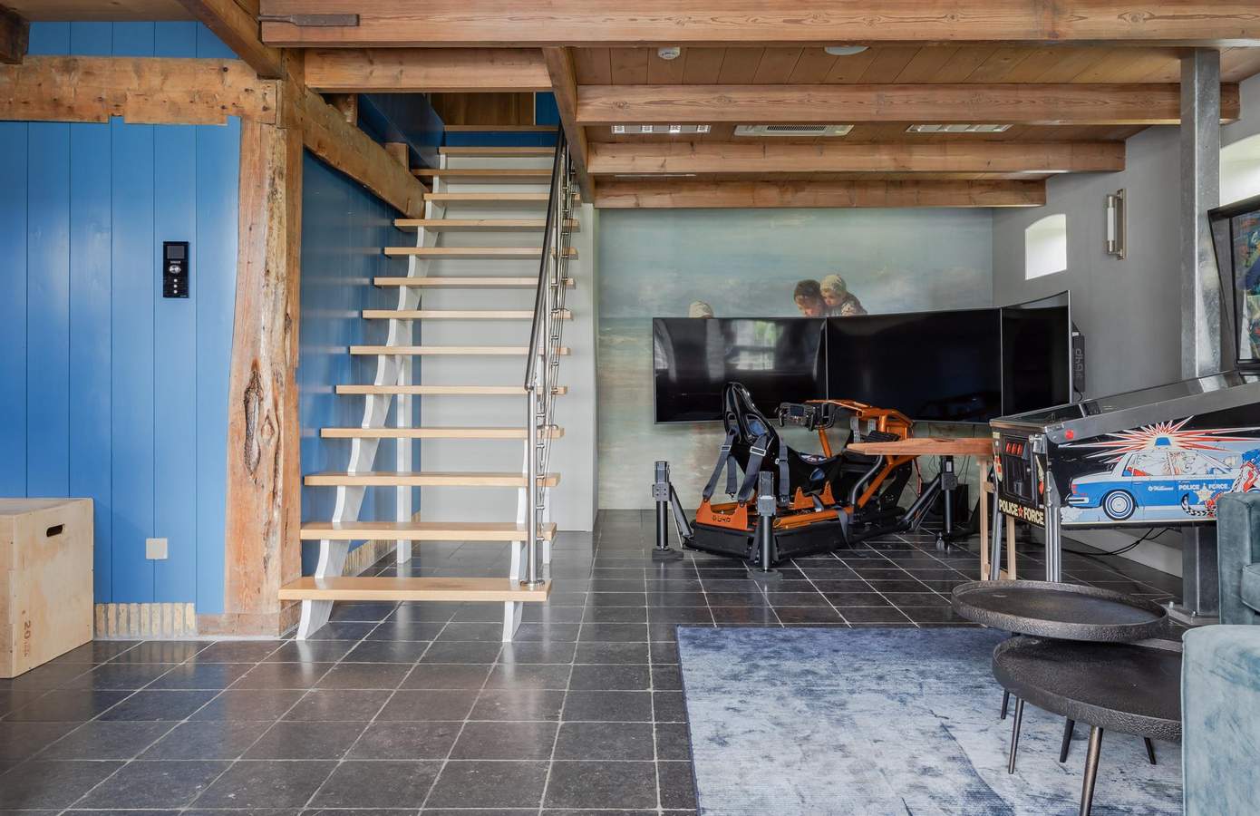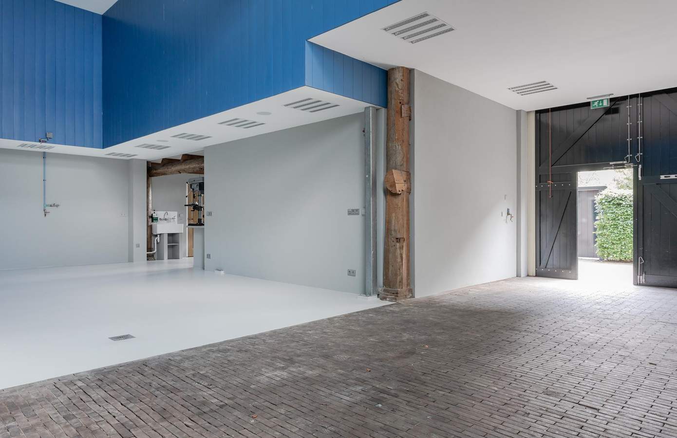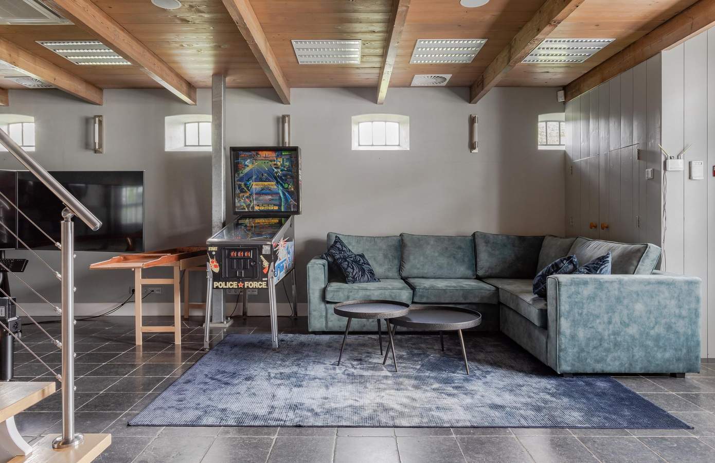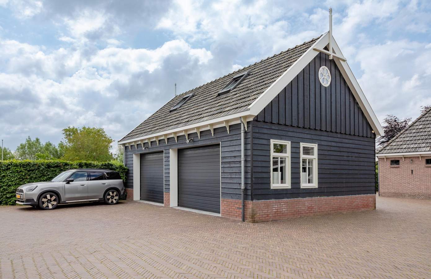 De stolpboerderij is een monument, daterend uit 1910. Het bevatte woonruimtes, maar werd vooral gebruikt om de koeien te melken en de oogst uit de boomgaard te verwerken. De enorme inhoud biedt nu een zee aan mogelijkheden, van royaal wonen tot bedrijf aan huis of zorgfunctie. Rondom uitstekend geïsoleerd, voorzien van vloerverwarming en van buiten met de grootst mogelijke zorg in oude glorie hersteld. De boerderij heeft drie toegangen van buitenaf en een binnendoor. Laatstegnoemde bevindt zich in de gang die de boerderij verbindt met het voorhuis. Deze deur leidt naar ‘de groene kamer’, zoals ook de oorspronkelijke bewoners het al noemden. Gevoelsmatig hoort deze kamer bij het voorhuis. Het is voorzien van een meterslange wandkast, wasmachine-aansluiting en een badkamer met toilet. Dat maakt het geschikt als slaap-, hobby- of praktijkruimte. De groene kamer grenst aan de volgende multi-inzetbare ruimte, nu oefenruimte voor de drummer des huizes. Het vierkant en de dars zijn omgetoverd tot een strakke garage c.q. werkplaats. Grote ingang, veel licht en hoogte, vloerverwarming, krachtstroom, perslucht, water en waterafvoer: alles is er. Zelfs de oude balken in het zicht en wanden in de originele kleur blauw. Rechts van de werkplaats bevinden zich de luxe uitgevoerde waskamer (met meterkast) en een extra werkkamer. Achterin de boerderij vindt u een doucheruimte met heren- en damestoilet. Hoogwaardig sanitair, een gestorte granieten vloer, maatwerk houten deuren: ook hier is alles tiptop afgewerkt. Waar vroeger de koeien op de regel stonden, is nu een luxueuze relax- en trainingsruimte. Het originele balkenplafond en het binnenmuurtje bij de keuken herinneren aan weleer. De L-vormige ruimte met tuindeuren is ook om te bouwen tot woonkamer. Vergunningen voor extra grote raampartijen zijn al aanwezig. Opnieuw een unieke aanblik. Rondom het vierkant is één grote, open kantoorvloer gemaakt, rustend op de in 2008 aangebrachte staalconstructie. Hier is ruimte voor minstens tien werkplekken. De ene kant van de U-vorm eindigt in de kantine met keuken. Aan de andere kant vindt u een dames- en herentoilet, berging en een enorme serverkast. Kortom, een werkomgeving die de productiviteit op elke mogelijke wijze stimuleert, inclusief airco, automatische luchtverversing en de eeuw-oude constructiebalken als sfeerbepalende elementen.