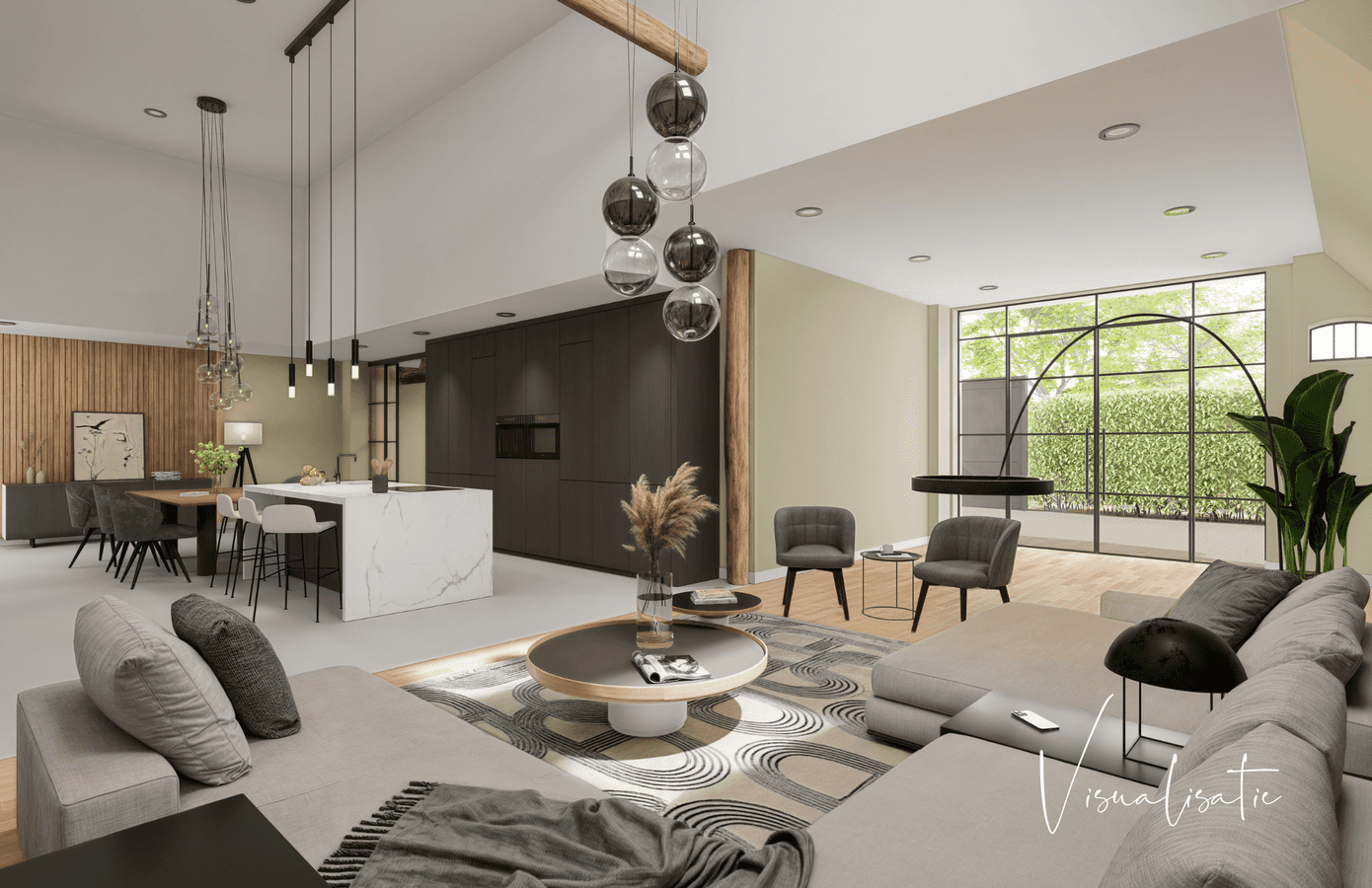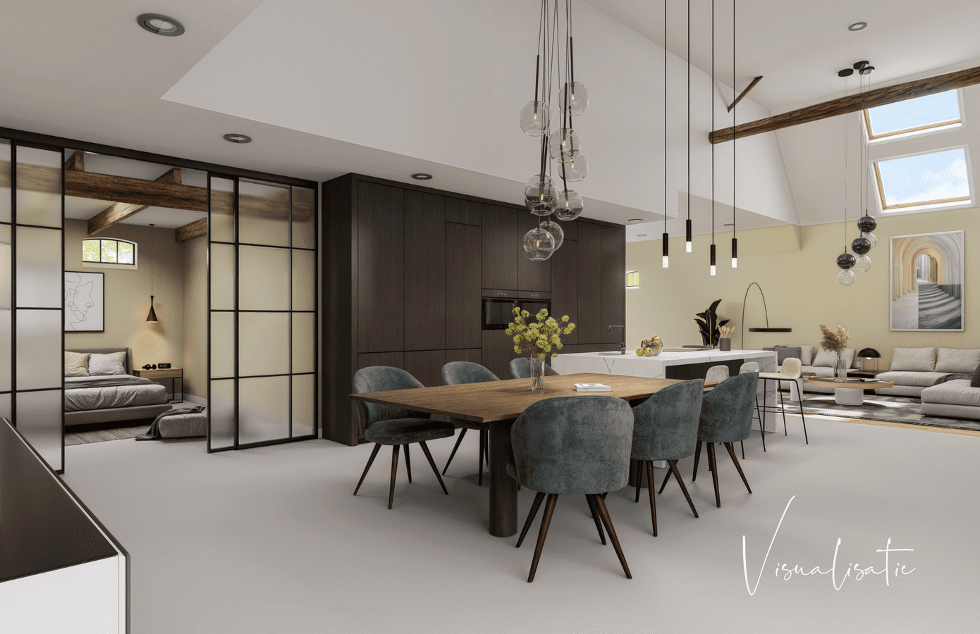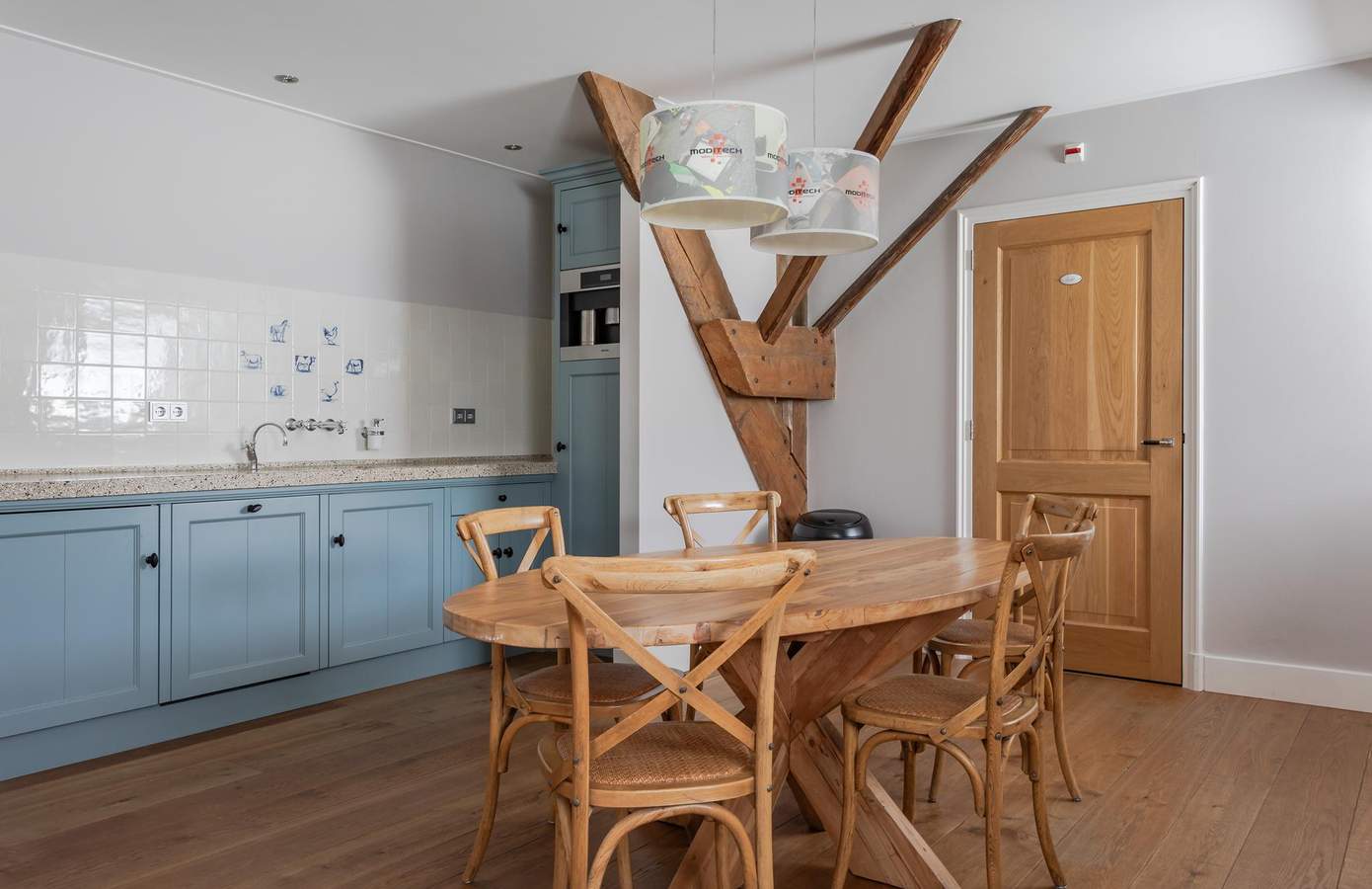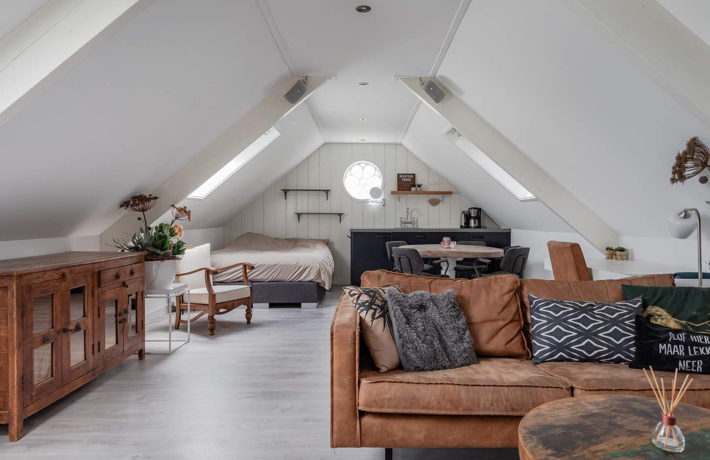 Op de verdieping is een heerlijke woonstudio gecreëerd. Strak, licht en sfeervol afgewerkt, geheel volgens de hoge standaard van de andere gebouwen. Ideaal voor oudere kinderen of als B&B.