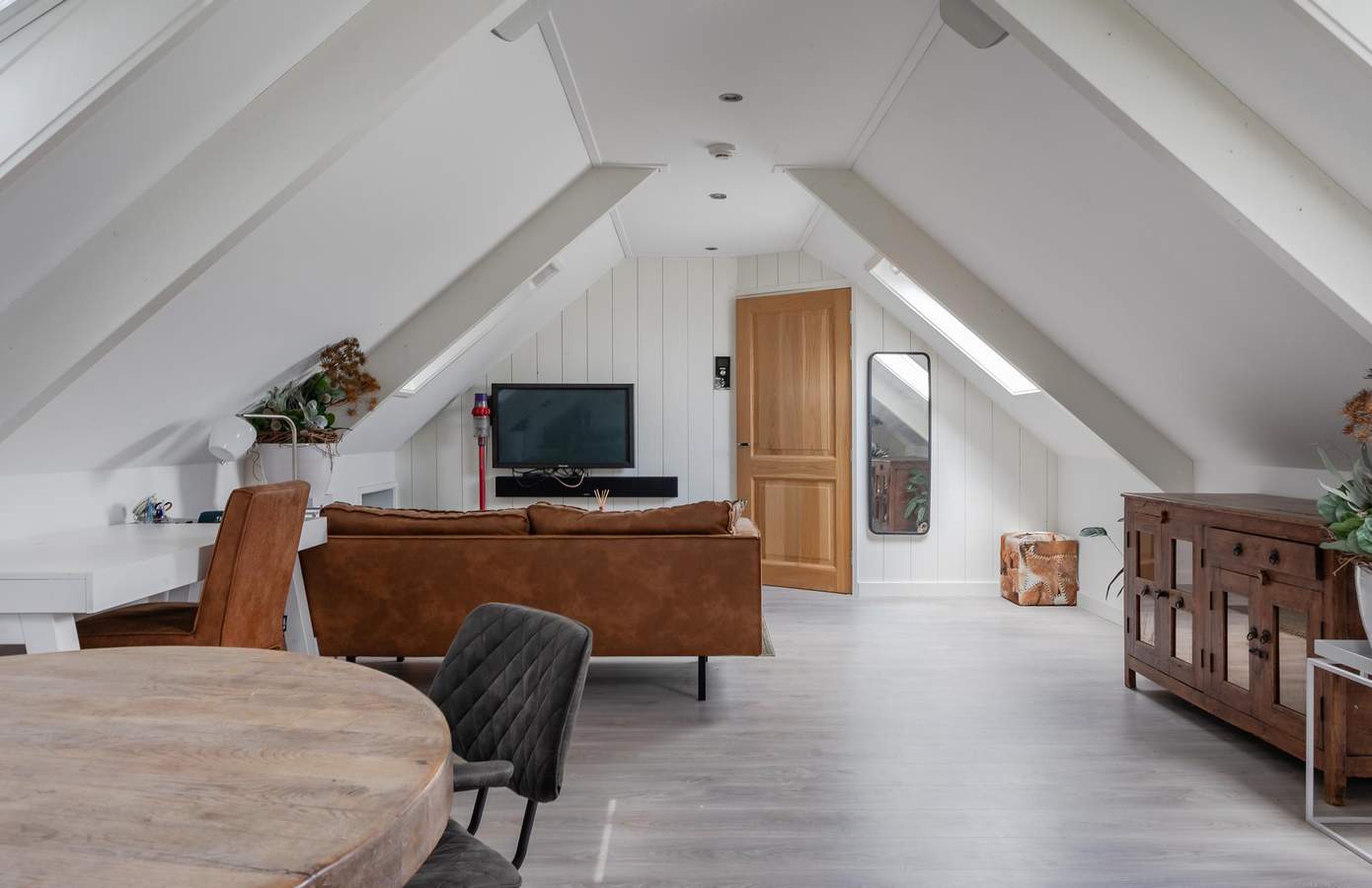 Zelfs de punt (zolder) van de boerderij is klaar voor gebruik. Geïsoleerd en ingetimmerd, met de originele katrol voor de hooibalen als historisch aandenken. Wordt het kantoor, slaapkamer of chillroom?