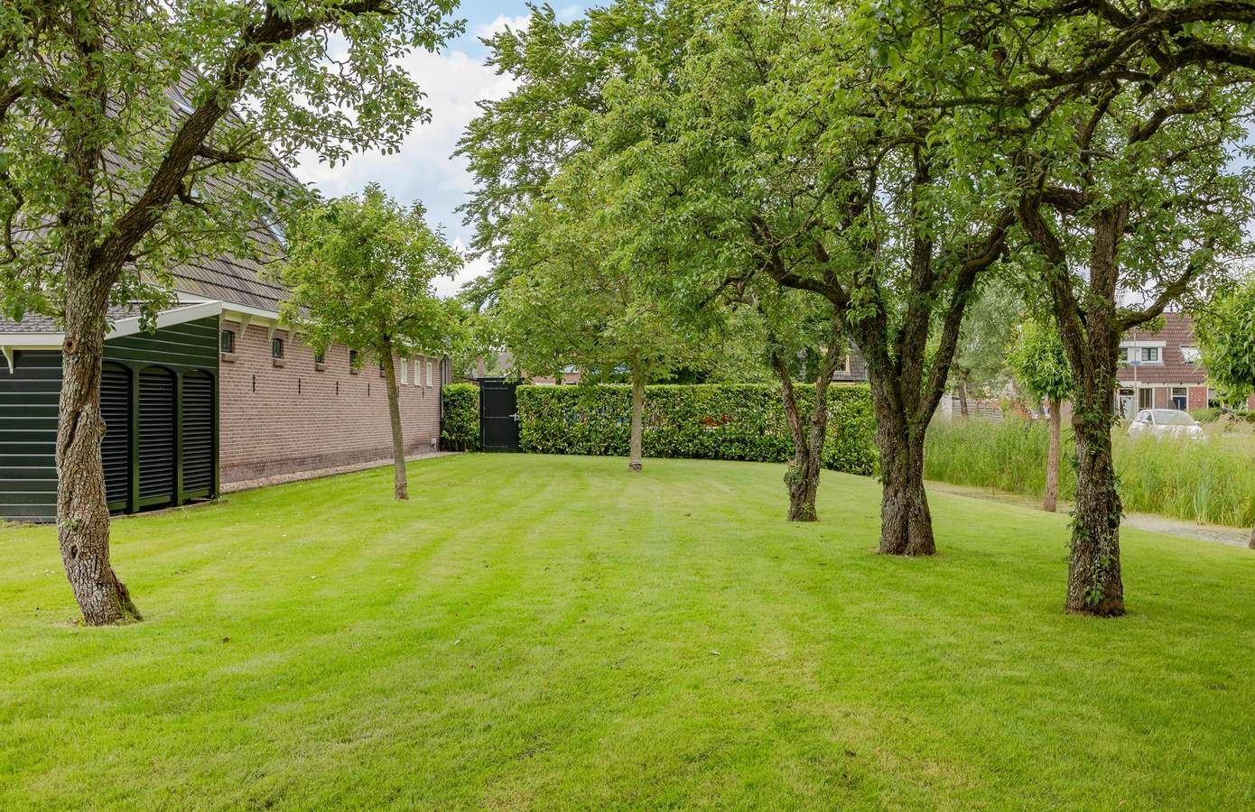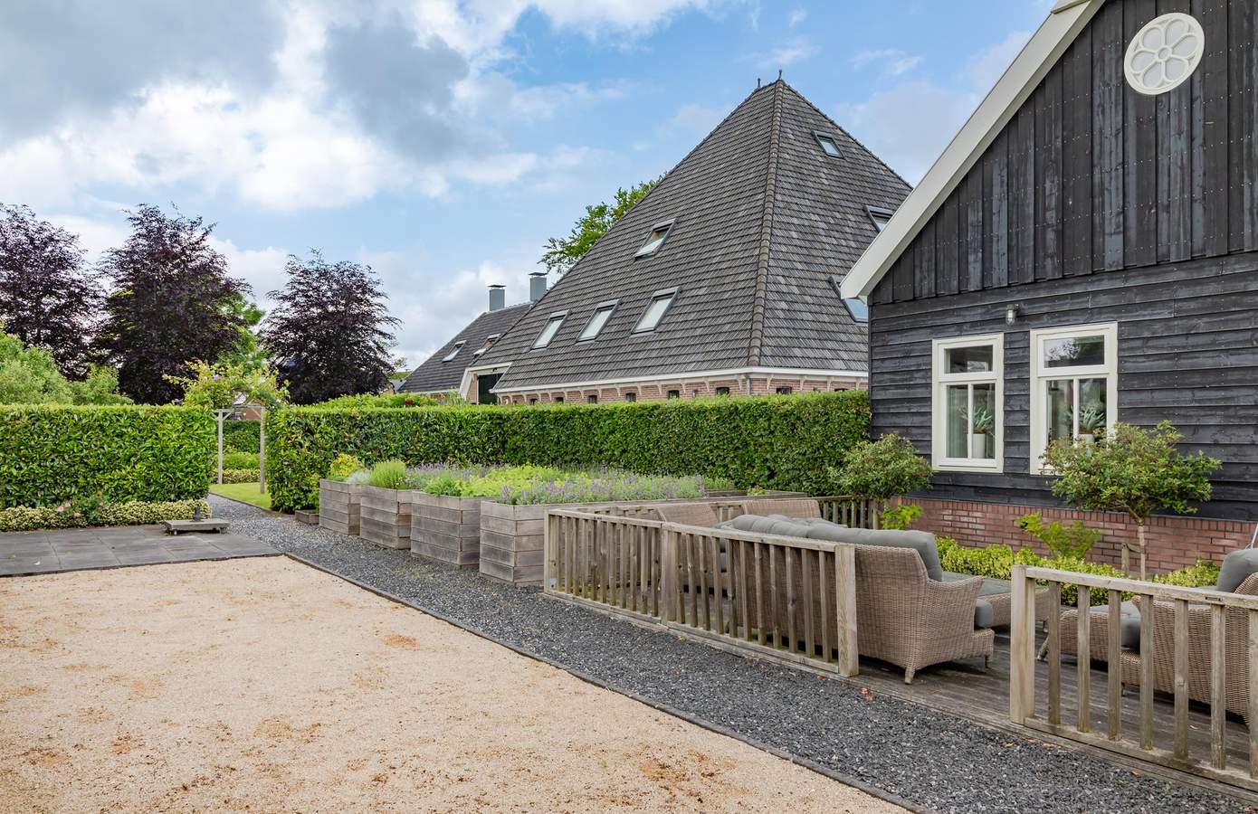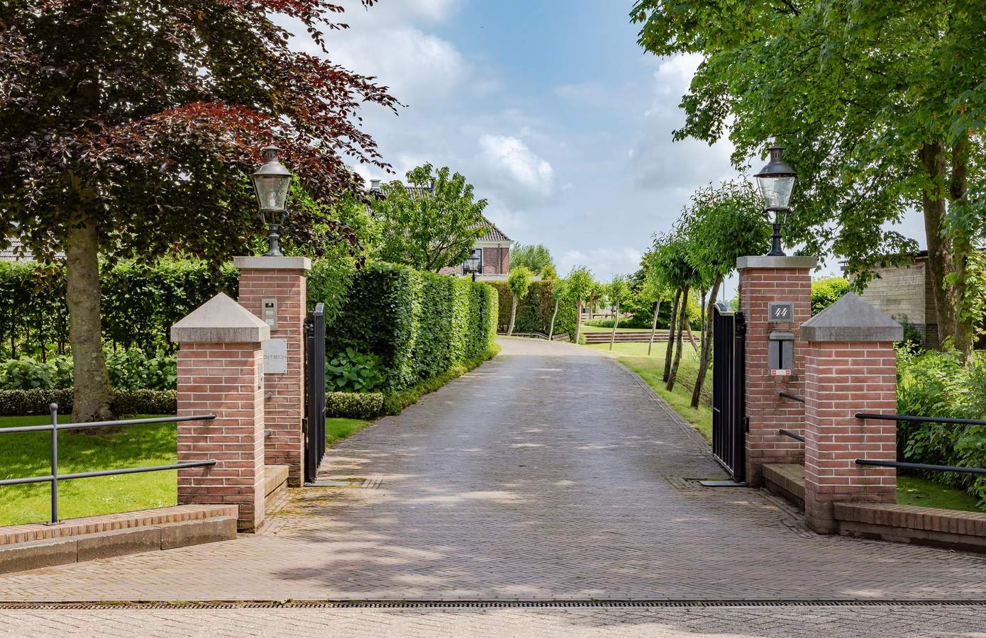 Het perfect onderhouden perceel is omringd door water. De monumentale loopbrug is met grote zorg teruggebracht in oorspronkelijke staat. Aan deze kant van de woning staan ook beuken uit de tijd dat de Herenweg nog Zuiderweg heette. Auto’s betreden het perceel via de statige brug met nummer 44. De elektrische poort is voorzien van afstandsbediening en camerabewaking. Het (gedeelde) pad leidt naar de schuur en het grote erf achter de boerderij. Bij levering dient er een nader te omschrijven recht van overpad gevestigd te worden op het pad en een erfafscheiding te worden geplaatst. Aan de boet (met wtw-unit) hangt een laadpaal.