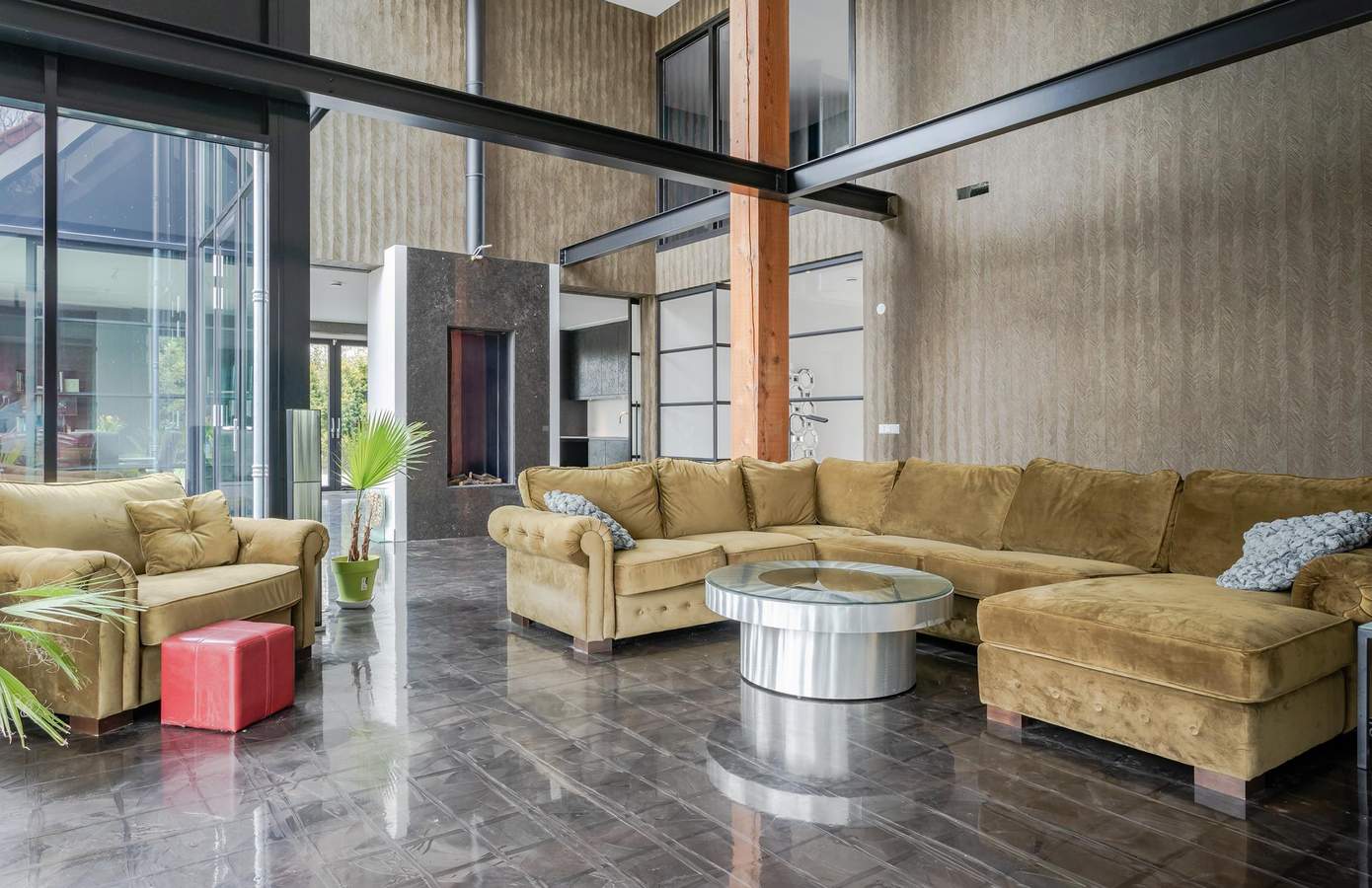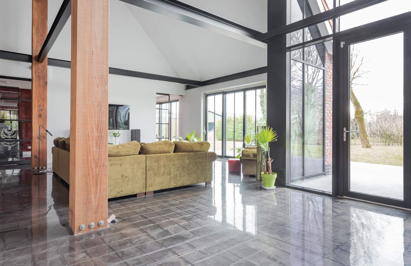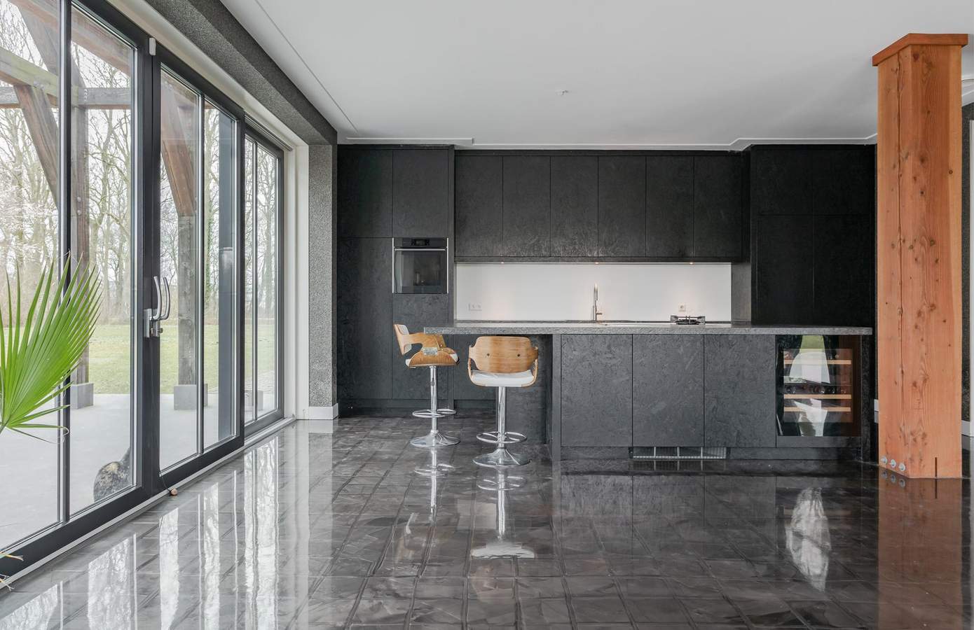 Bij binnenkomst op de begane grond treft u een chique en ruimtelijk interieur, met een woonkamer die een plafondhoogte van maar liefst 6 meter heeft. De 35 cm brede pilaren van Oregon Pine-hout in combinatie met het industriële zwartmetalen steunsysteem zorgen voor een indrukwekkende uitstraling. Grote, zwarte glazen schuifdeuren verbinden de open keuken met de tuin en creëren een prachtige overgang tussen binnen en buiten.