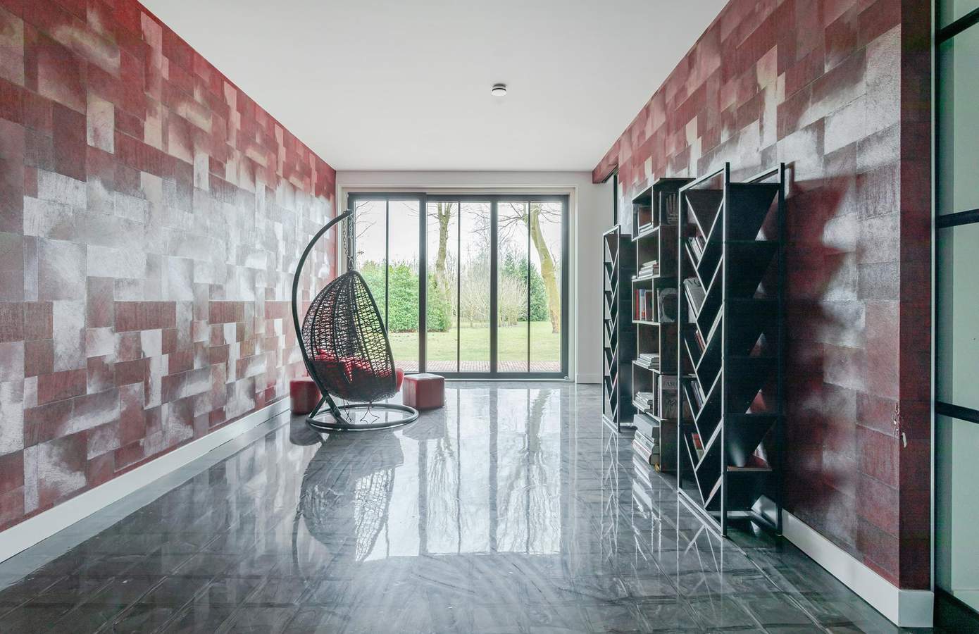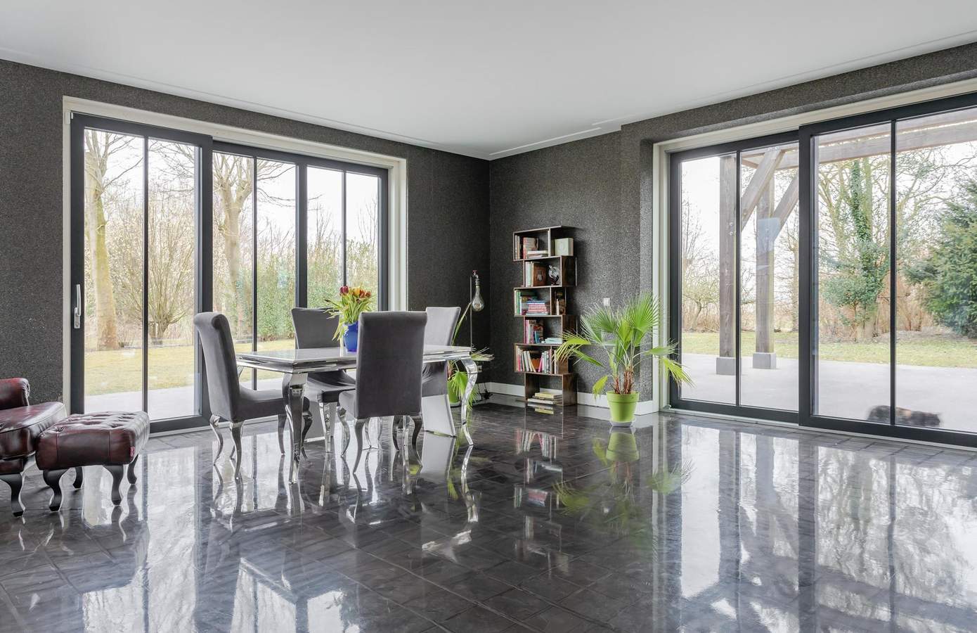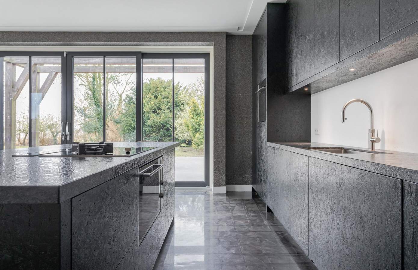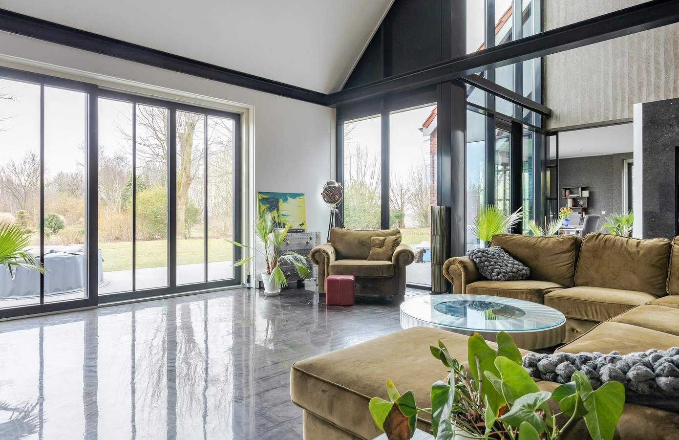 Bij binnenkomst op de begane grond treft u een chique en ruimtelijk interieur, met een woonkamer die een plafondhoogte van maar liefst 6 meter heeft. De 35 cm brede pilaren van Oregon Pine-hout in combinatie met het industriële zwartmetalen steunsysteem zorgen voor een indrukwekkende uitstraling. Grote, zwarte glazen schuifdeuren verbinden de open keuken met de tuin en creëren een prachtige overgang tussen binnen en buiten.