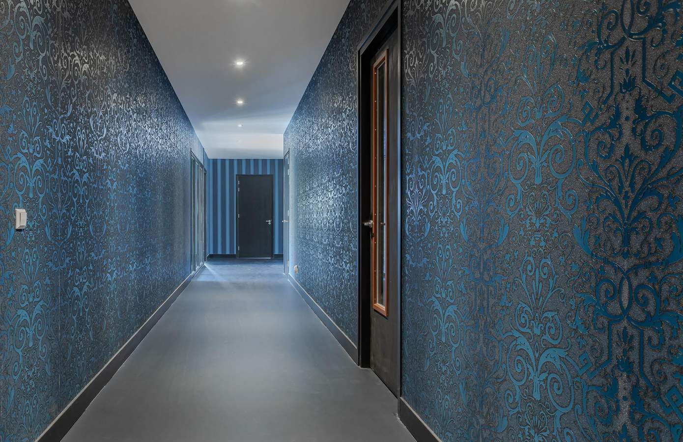 De begane grond biedt tevens een royale slaapkamer met een en-suite badkamer, een praktische bijkeuken met wasmachineaansluiting en een ingenieuze waskoker van boven naar beneden. Alle ruimtes zijn verbonden via een royale hal met handgeschilderde epoxy gietvloer, die doorloopt in de rest van de woning. De woonkamer, waar de robuuste steunbalken tot aan het plafond zichtbaar zijn, biedt een bijzonder ruimtelijk en open gevoel.