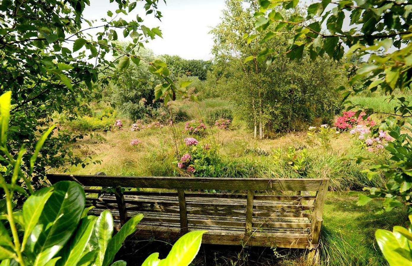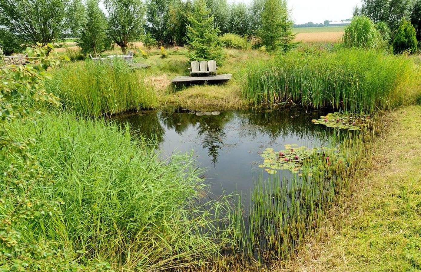 Aan de voorzijde van de boerderij strekt een groot grasveld zich uit, toegankelijk via een royale oprijlaan die is afgeschermd met een elektrische poort. Hier is meer dan voldoende parkeerruimte voor meerdere voertuigen. Het perceel beschikt over twee bijgebouwen: een hooiberg met grote deuren en een leegstaande kippenschuur van bijna 2.000 m², waarvan een deel ooit als theehuis werd gebruikt. De fraai aangelegde tuin, met een oppervlakte van ruim 10.000 m², biedt een oase van rust en privacy. Wandelpaden, vijvers, glooiende heuvels, appelbomen, bamboe en talloze vaste planten maken deze tuin werkelijk uniek. U komt hier volledig tot rust, omringd door vijftig majestueuze knotwilgen. De buitenzijde van de boerderij is volledig onderhoudsvrij en behoeft geen schilderwerk. De woning heeft nog ruim 16 jaar bouwgarantie en is opgetrokken uit hoogwaardige materialen.
