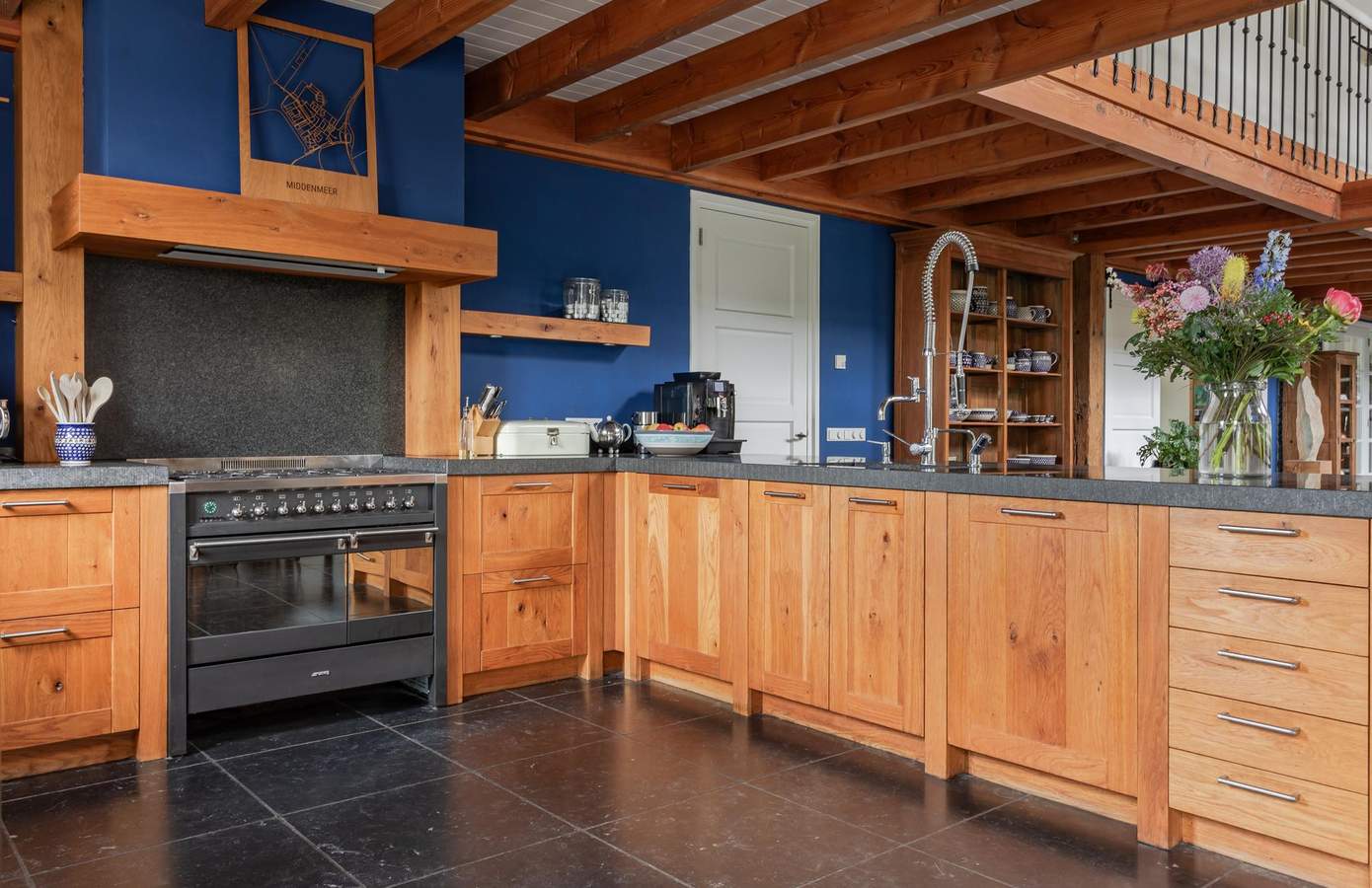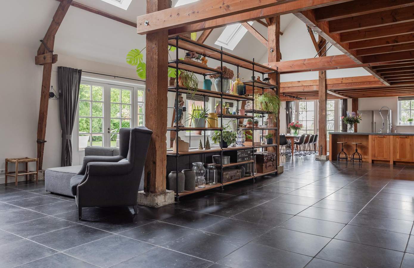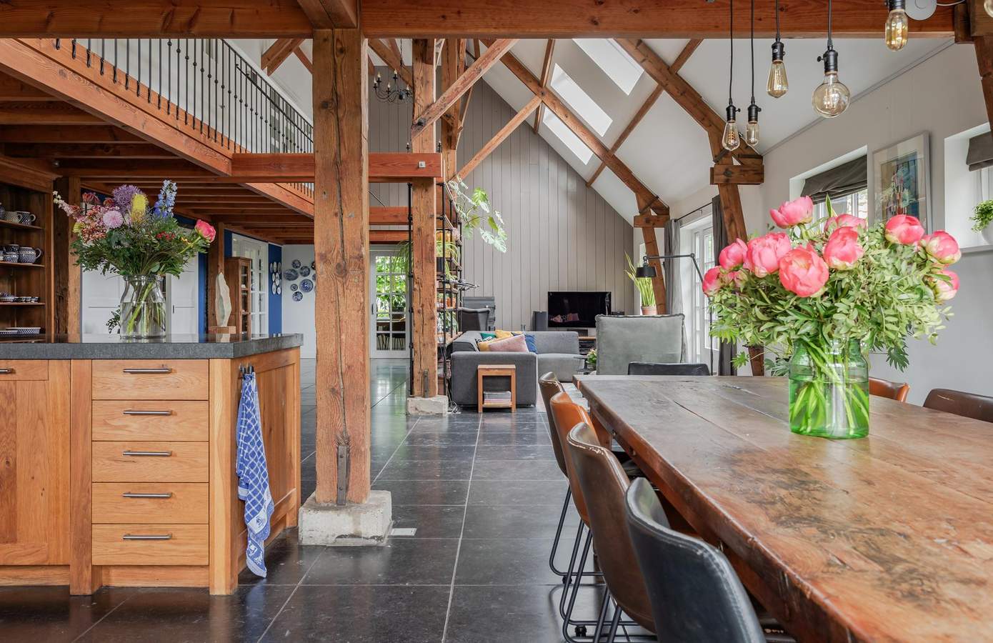 Via de hal loopt u de imponerende woonkamer binnen. Wat meteen opvalt in de living is de enorme hoogte, de balustrade en het gebruik van de houten balkenconstructie. De dakramen zorgen voor veel lichtinval. De woonruimte is landelijk industrieel ingericht, samen met de fijne houtkachel creëert dit veel sfeer. Via de dubbele openslaande deuren kunt u de tuin betreden. De royale open keuken bevindt zich in dezelfde ruimte en is uitgevoerd in stoer massief eikenhout. Dit is een droom voor elke culinaire liefhebber. Hier vindt u hoogwaardige Miele inbouwapparatuur, waaronder een stoomoven, vaatwasser, gasfornuis met oven, magnetron, koel/vriescombinatie en een Quooker kraan. Kortom, een heerlijke plek om gezellige en culinaire avonden te organiseren en veel mensen te ontvangen. Aan de voorzijde is de voorkamer gelegen, hier kunt u zich heerlijk terugtrekken om een boek te lezen bij de open haard of TV te kijken. En-suite aan de voorkamer bevindt zich nog een werkkamer. Een tweede werkkamer is gelegen tussen de hal en de bijkeuken.