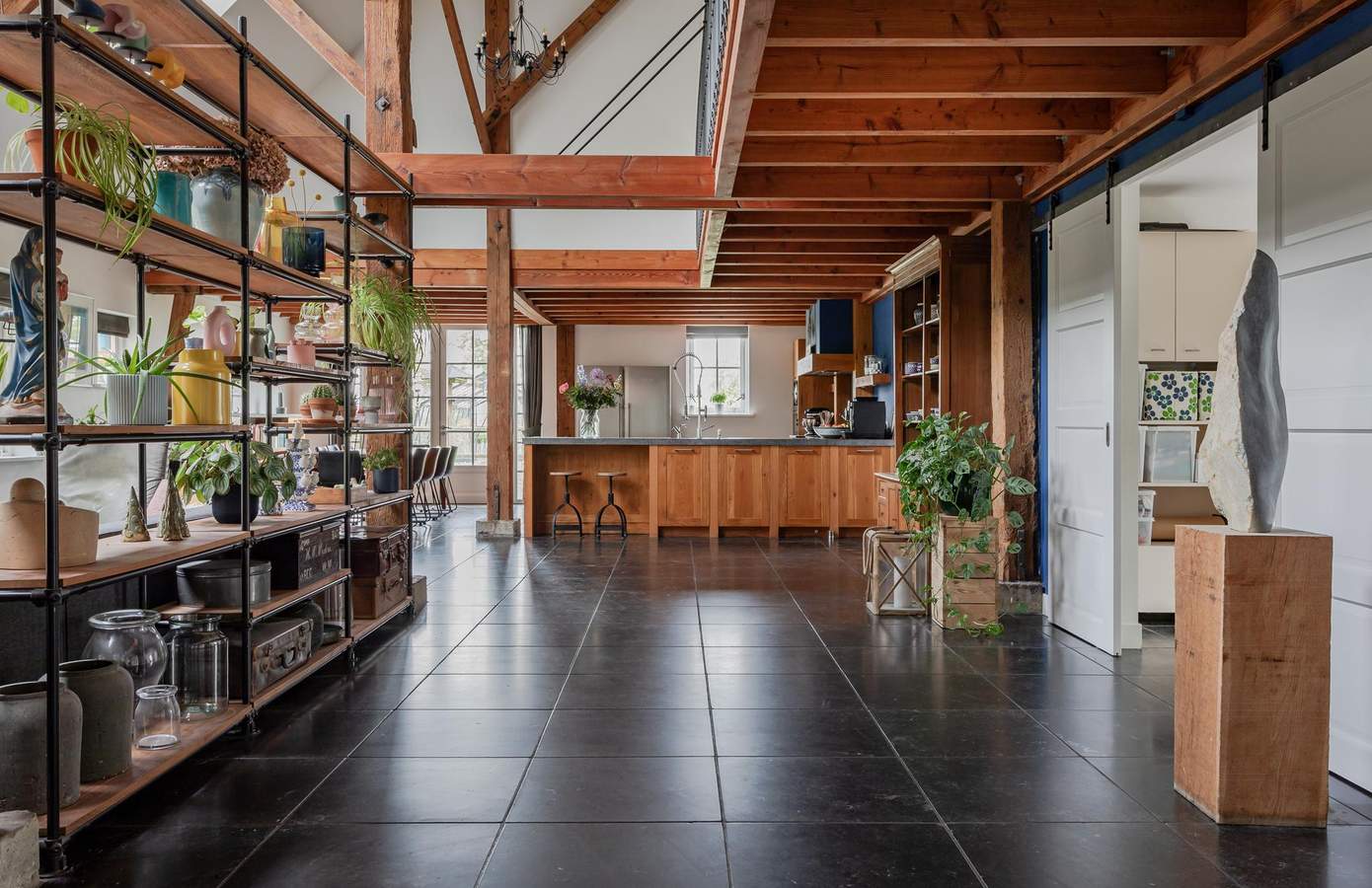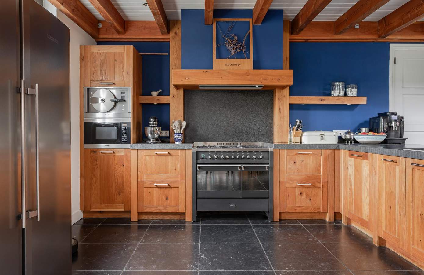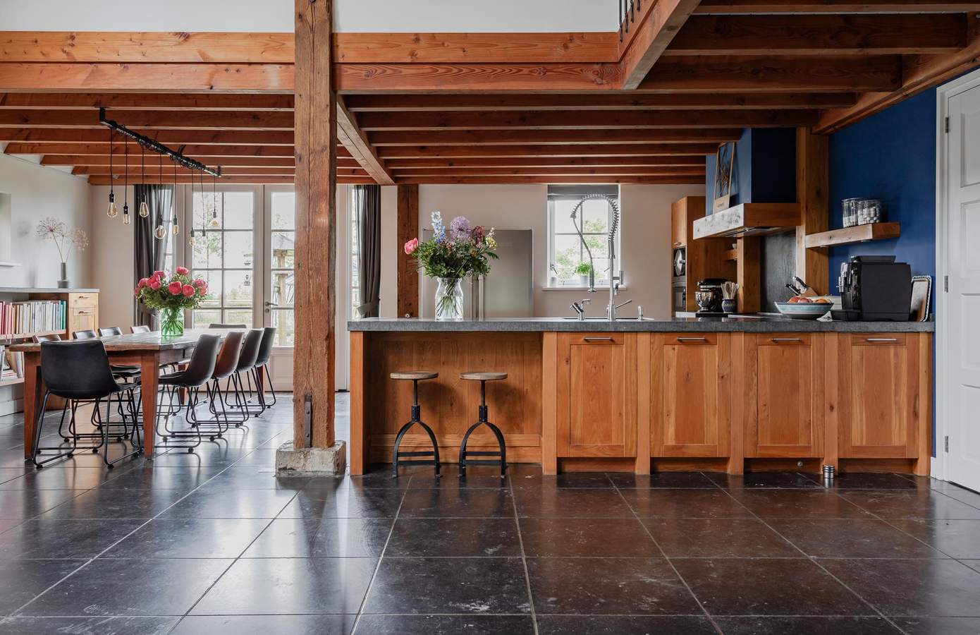 Via de hal loopt u de imponerende woonkamer binnen. Wat meteen opvalt in de living is de enorme hoogte, de balustrade en het gebruik van de houten balkenconstructie. De dakramen zorgen voor veel lichtinval. De woonruimte is landelijk industrieel ingericht, samen met de fijne houtkachel creëert dit veel sfeer. Via de dubbele openslaande deuren kunt u de tuin betreden. De royale open keuken bevindt zich in dezelfde ruimte en is uitgevoerd in stoer massief eikenhout. Dit is een droom voor elke culinaire liefhebber. Hier vindt u hoogwaardige Miele inbouwapparatuur, waaronder een stoomoven, vaatwasser, gasfornuis met oven, magnetron, koel/vriescombinatie en een Quooker kraan. Kortom, een heerlijke plek om gezellige en culinaire avonden te organiseren en veel mensen te ontvangen. Aan de voorzijde is de voorkamer gelegen, hier kunt u zich heerlijk terugtrekken om een boek te lezen bij de open haard of TV te kijken. En-suite aan de voorkamer bevindt zich nog een werkkamer. Een tweede werkkamer is gelegen tussen de hal en de bijkeuken.