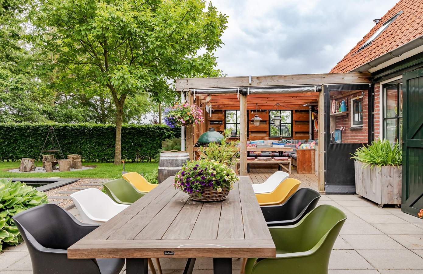 Ook is er goed nagedacht over de indeling van het perceel en de verbinding vanuit het huis met de tuin. Vanuit de keuken kijkt u op de moestuin en het voedselbos en vanuit de woonkamer komt u in de heerlijke wellness-omgeving met het terras, de zwemvijver, sauna, hottub en de buitenkeuken.