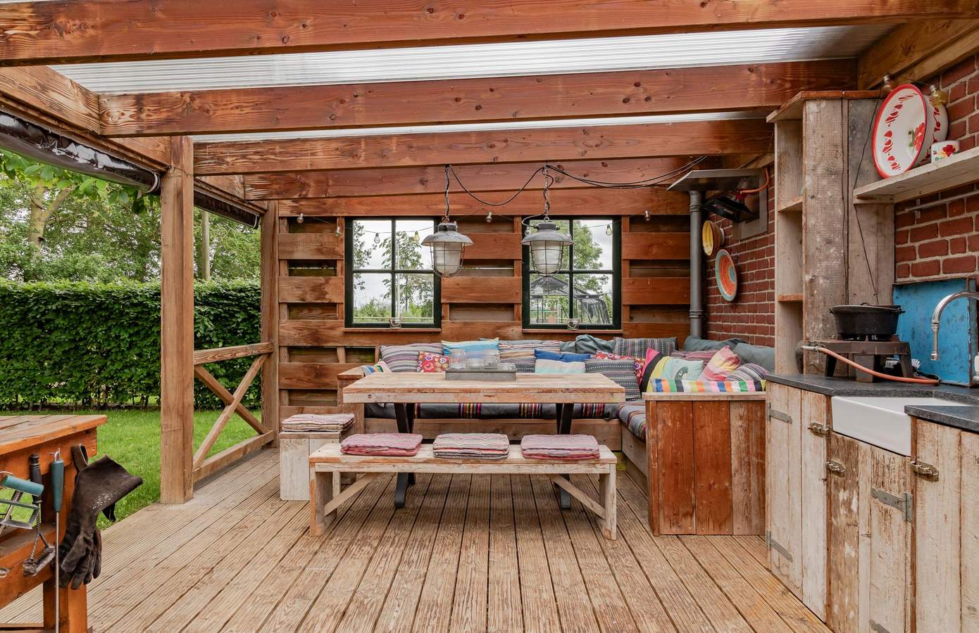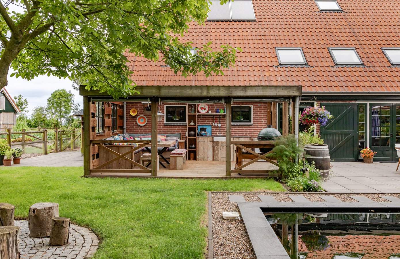 Het is in de zomer goed vertoeven in de tuin met de overdekte buitenkeuken met loungehoek, bij de vuurplaats of op één van de vele terrassen rondom het huis. De buitenkeuken is voorzien van warm en koud stromend water en een heater voor de frissere avonden.