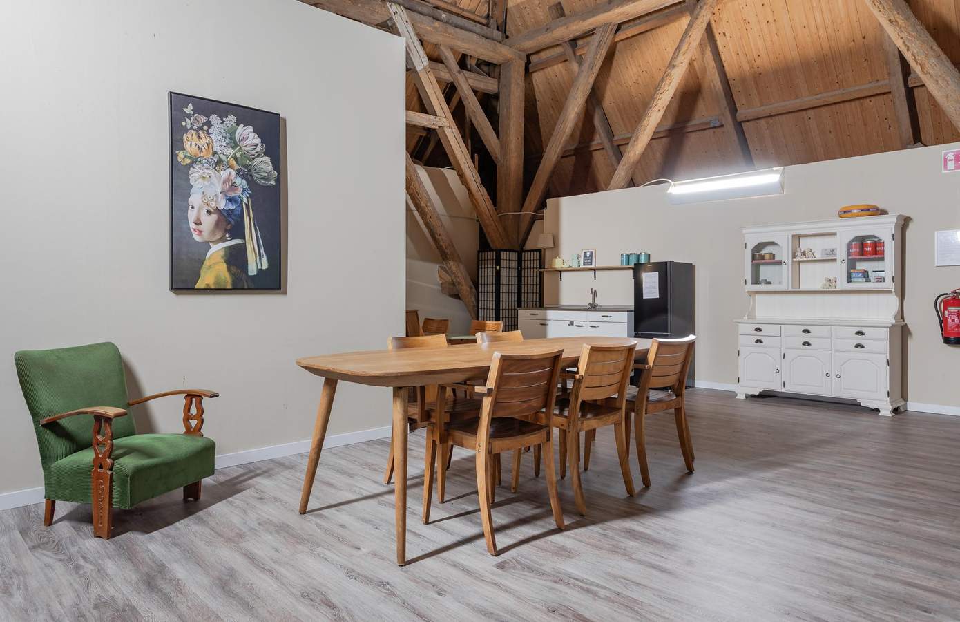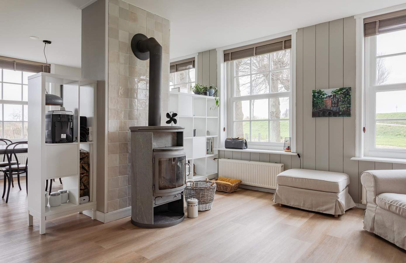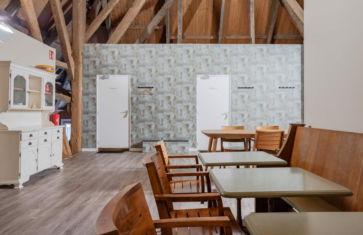 De woonkamer biedt een schitterend vrij uitzicht op de dijk en de rondom grazende dieren. Dankzij de vele ramen geniet deze ruimte van een overvloed aan natuurlijk licht. Vanuit de hal bereikt u onder andere de uitgiftebalie van de theetuin, twee slaapkamers en een recent vernieuwde badkamer. Daarnaast bevindt zich hier de volledig uitgeruste horecakeuken, waar met zorg onder andere het ontbijt voor de Bed & Breakfast wordt bereid. Achter in de hal vindt u een kantoorruimte met uitzicht op de karakteristieke dars.
