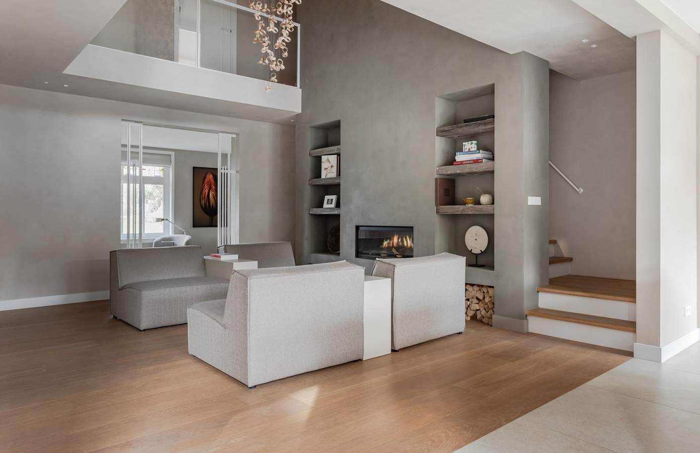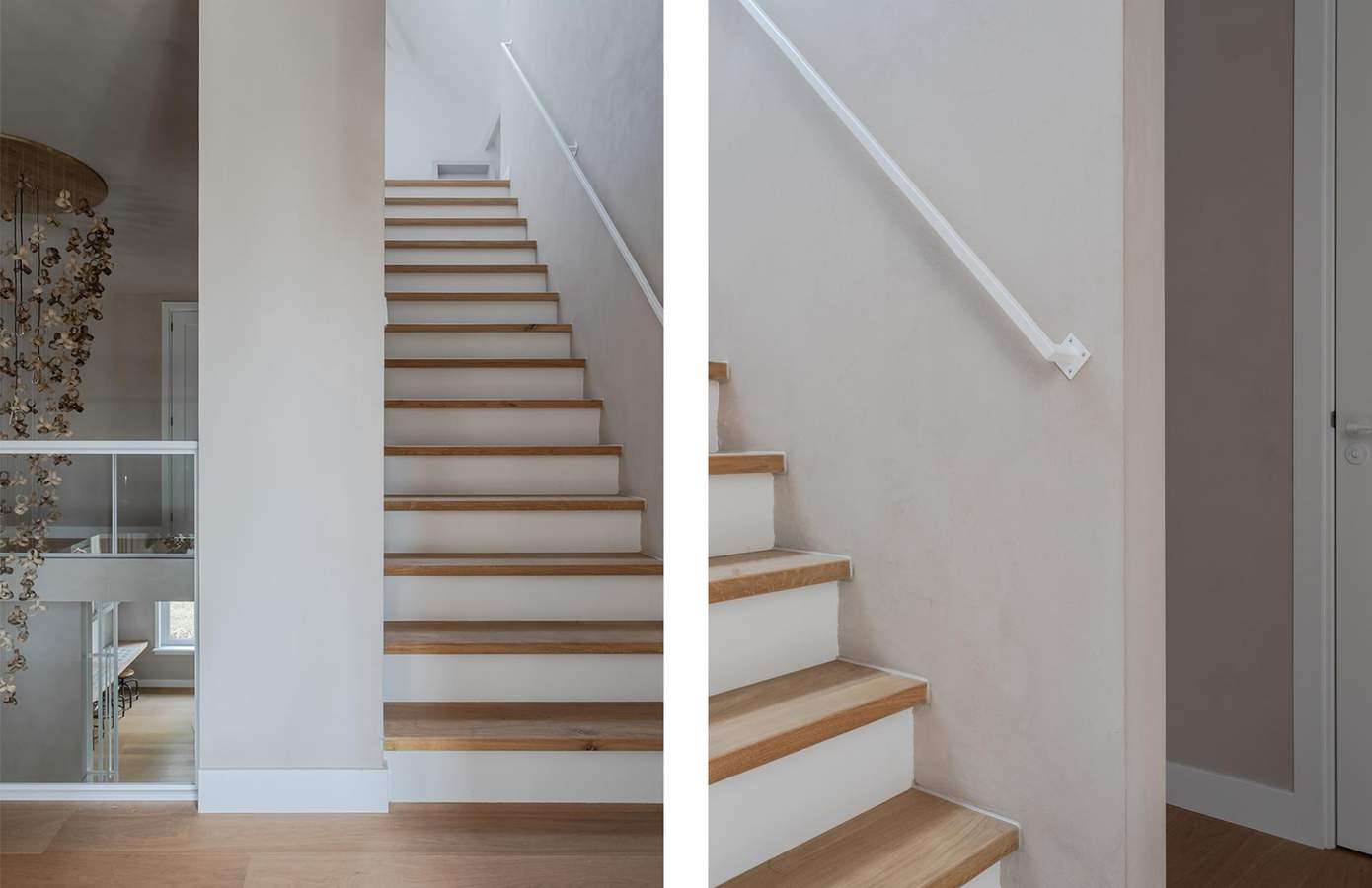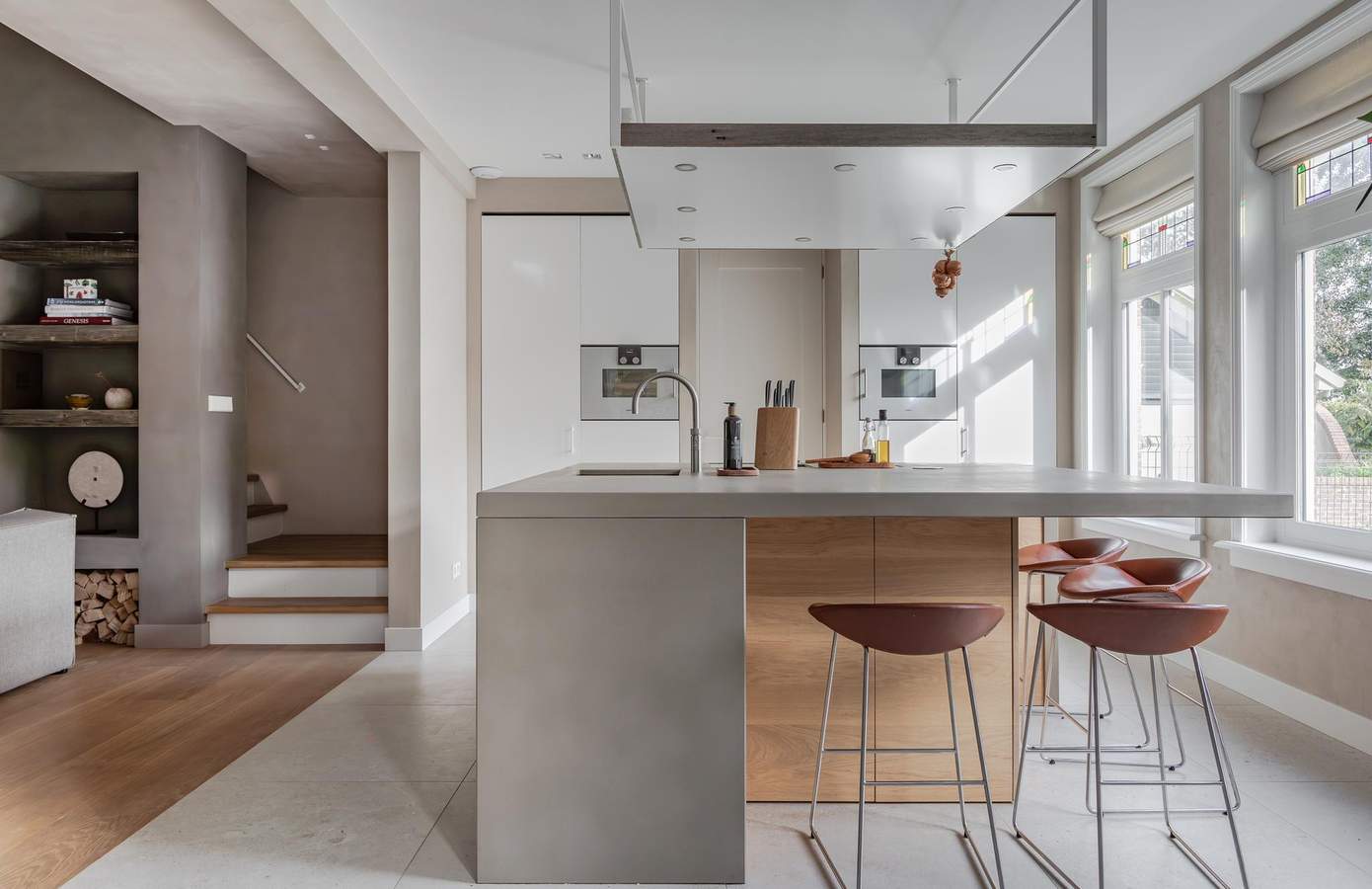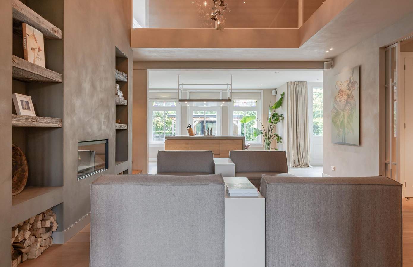 Wauw, dat is het eerste wat u denkt bij binnenkomst. ruim en sfeervol. En dan staat u enkel nog maar in de hal. Via de witte taatsdeuren loopt u de woonkamer in. Door het creëren van een vide in het hart van de boerderij is het de hoogte die gelijk indruk maakt. De prachtige parketvloer met extra dikke planken ligt bijna over de gehele begane grond. Enkel in de keuken ligt een betonlook tegel. De keuze van Brass interieurs voor de kleur wit, de houtenvloer en de wanden van betoncire zorgt voor een stijlvol interieur. Overal is over nagedacht: het verloop van de ruimtes, het gebruik van de juiste materialen en gevoel voor smaak.