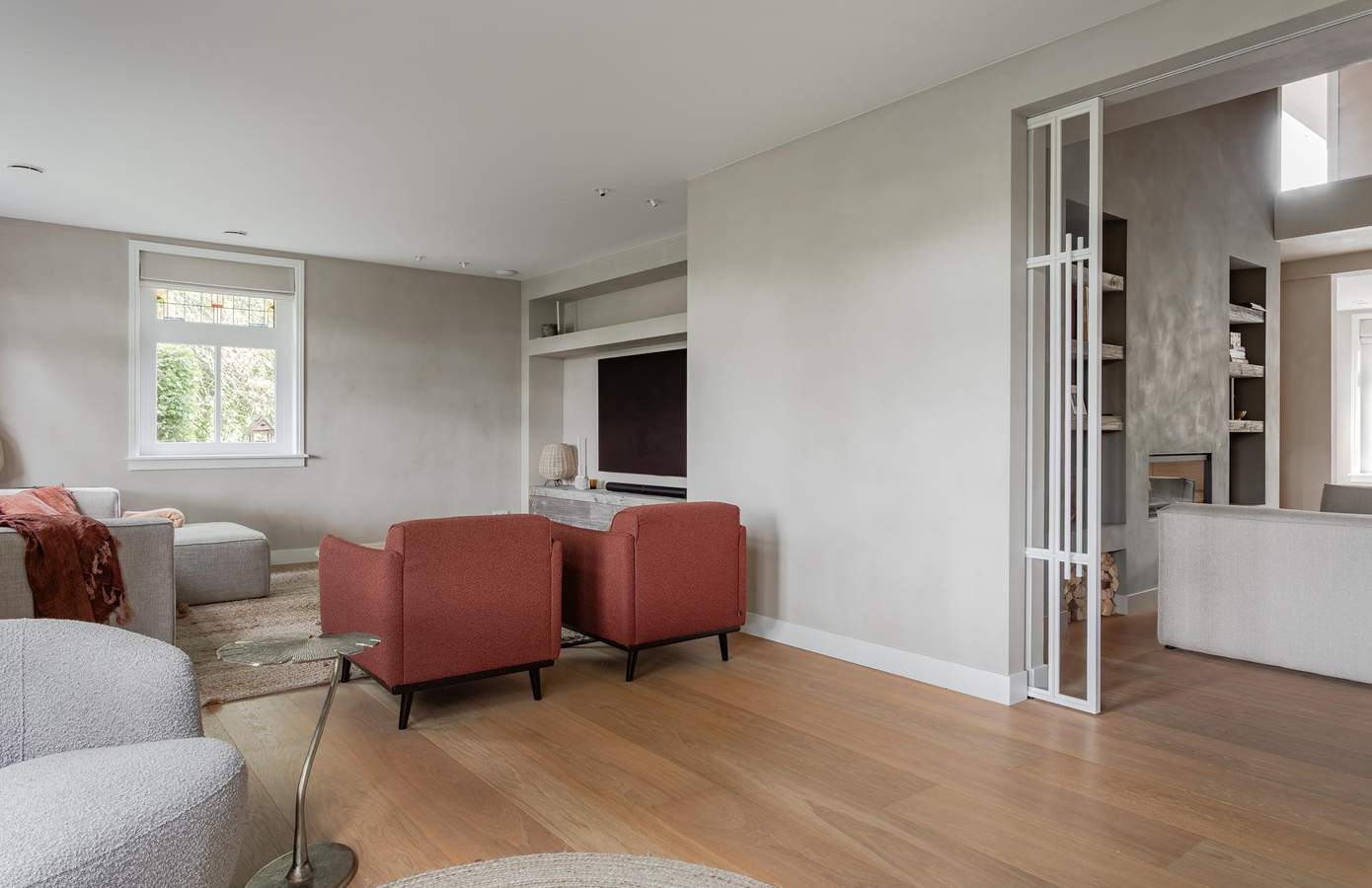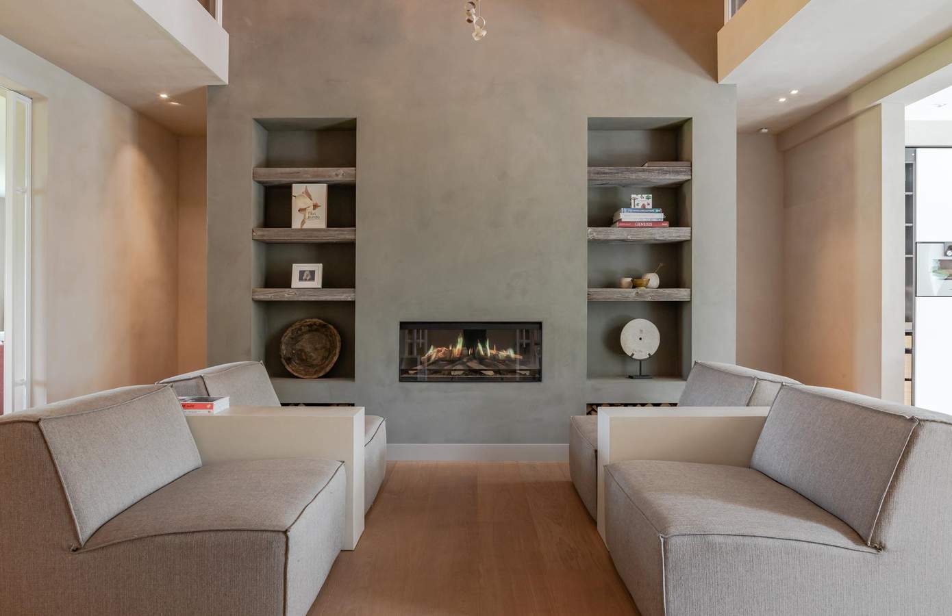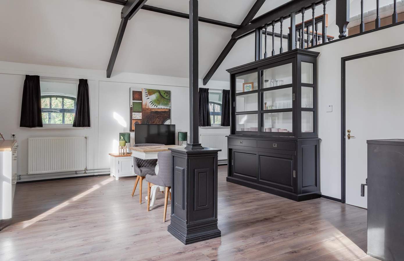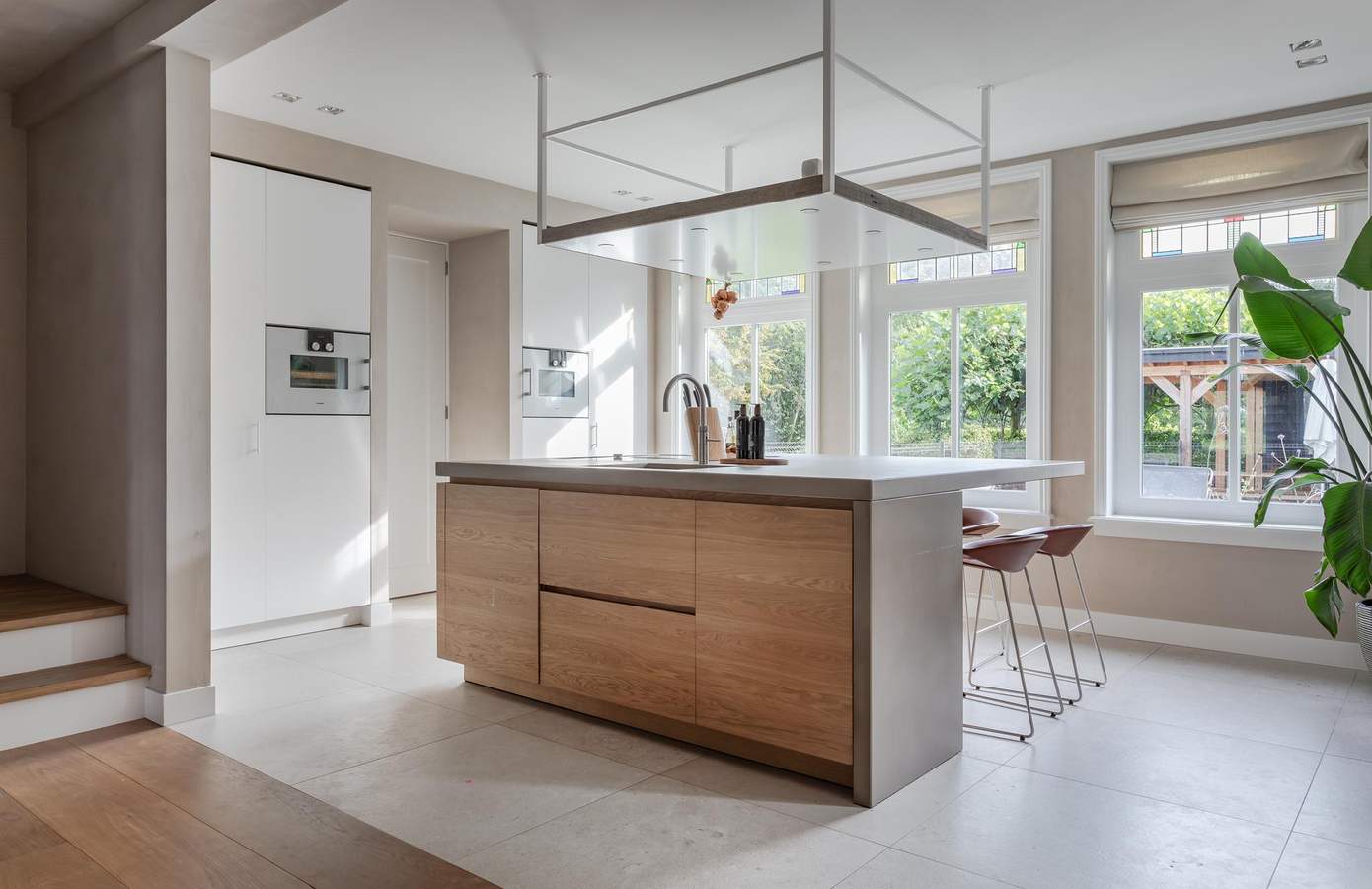 Wauw, dat is het eerste wat u denkt bij binnenkomst. ruim en sfeervol. En dan staat u enkel nog maar in de hal. Via de witte taatsdeuren loopt u de woonkamer in. Door het creëren van een vide in het hart van de boerderij is het de hoogte die gelijk indruk maakt. De prachtige parketvloer met extra dikke planken ligt bijna over de gehele begane grond. Enkel in de keuken ligt een betonlook tegel. De keuze van Brass interieurs voor de kleur wit, de houtenvloer en de wanden van betoncire zorgt voor een stijlvol interieur. Overal is over nagedacht: het verloop van de ruimtes, het gebruik van de juiste materialen en gevoel voor smaak.