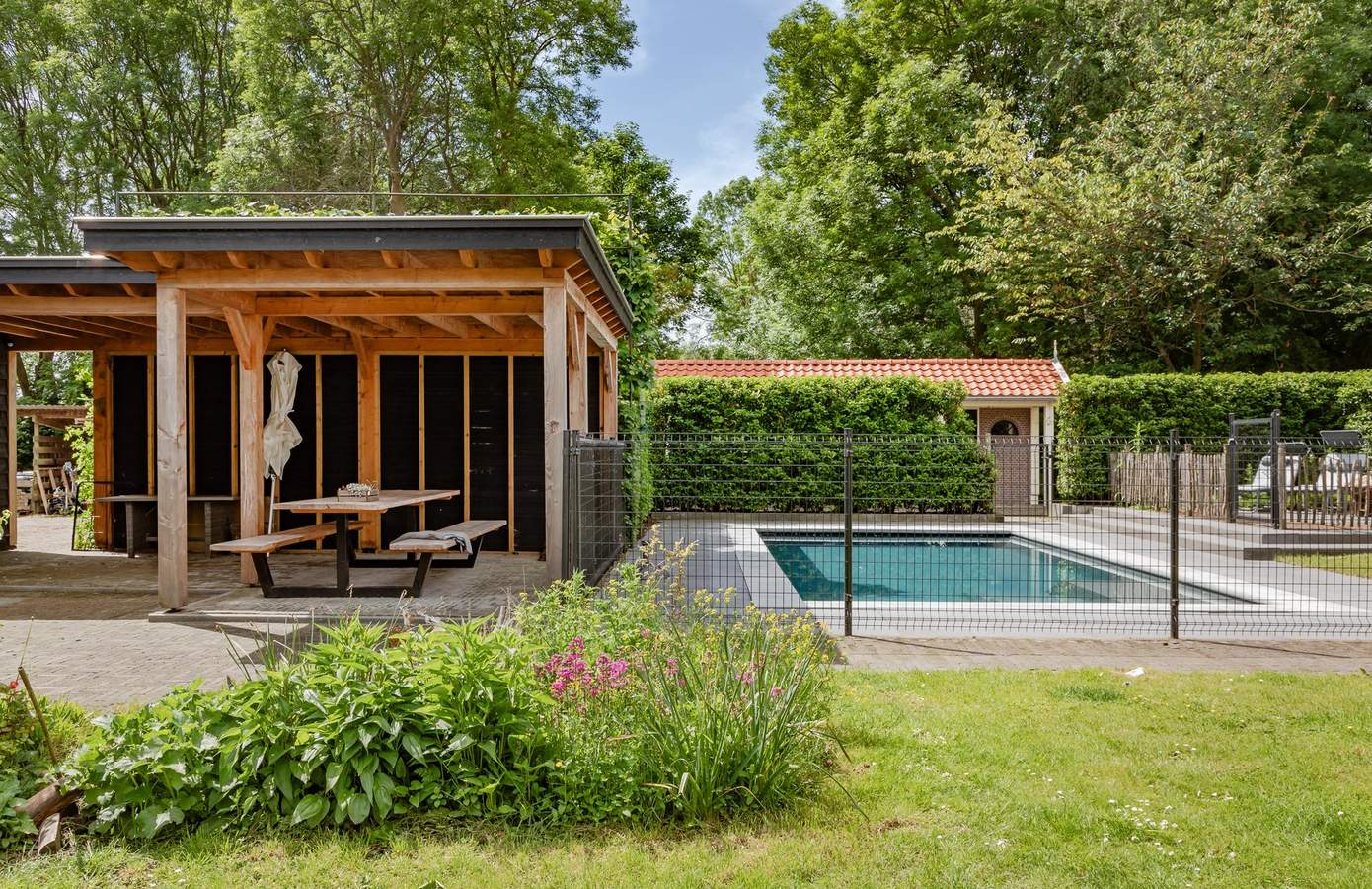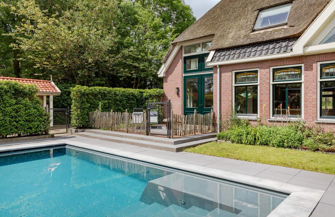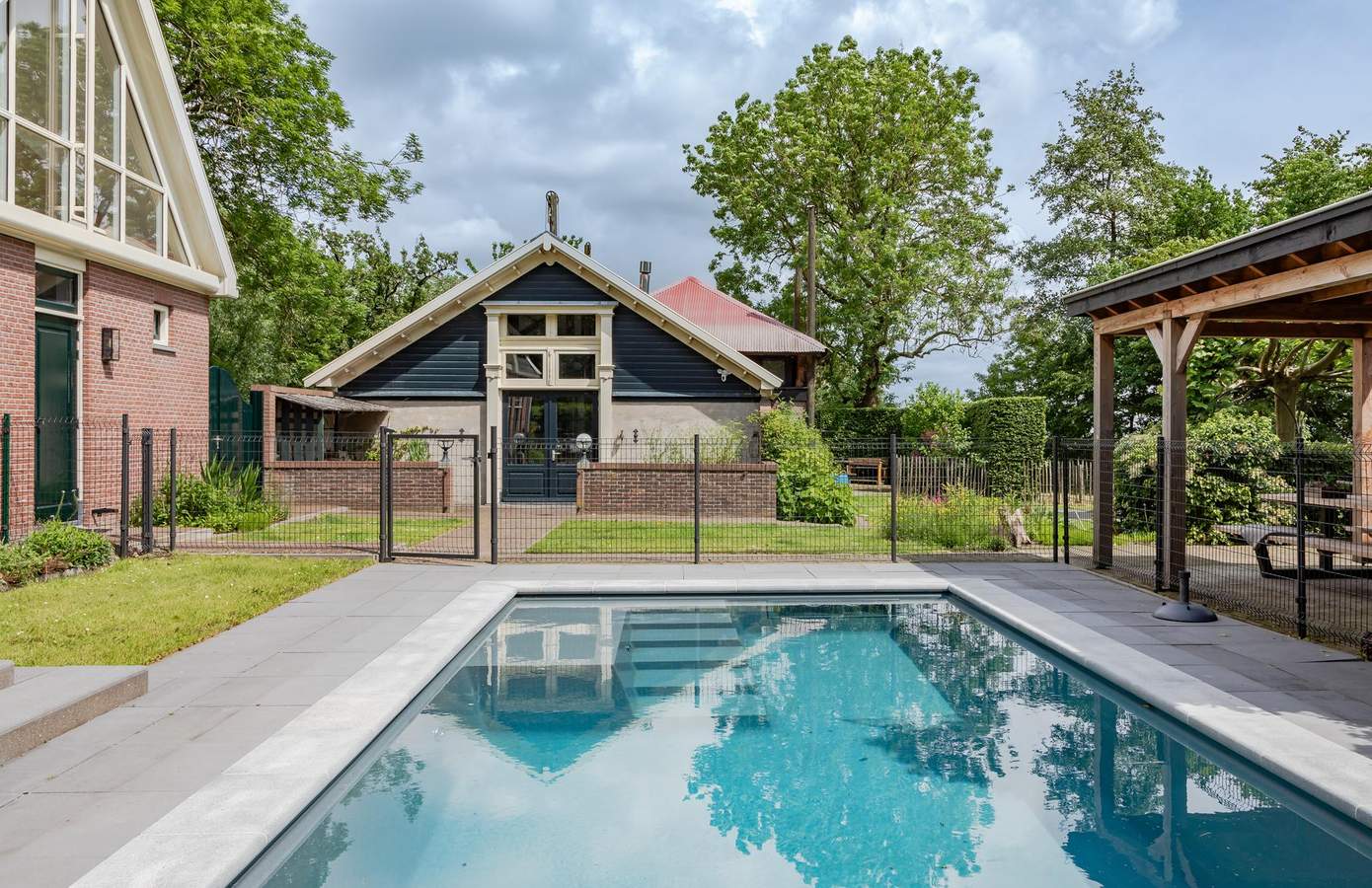 Via een elektrische poort bereikt u het erf. Een carport voor twee auto’s (met laadpalen), een schuur, een moestuin, een weiland, een boomgaard, diverse borders, u treft het hier allemaal. Een heerlijke veranda. een hyper modern en verwarmd zwembad met allerlei functies zorgen voor comfort. De voormalige stal en vijzelberg zijn in 2008 getransformeerd tot twee gastenverblijven. In 2021 zijn deze gerenoveerd. Deze ruimtes zijn ook goed te gebruiken als B&B of generatiewoning.