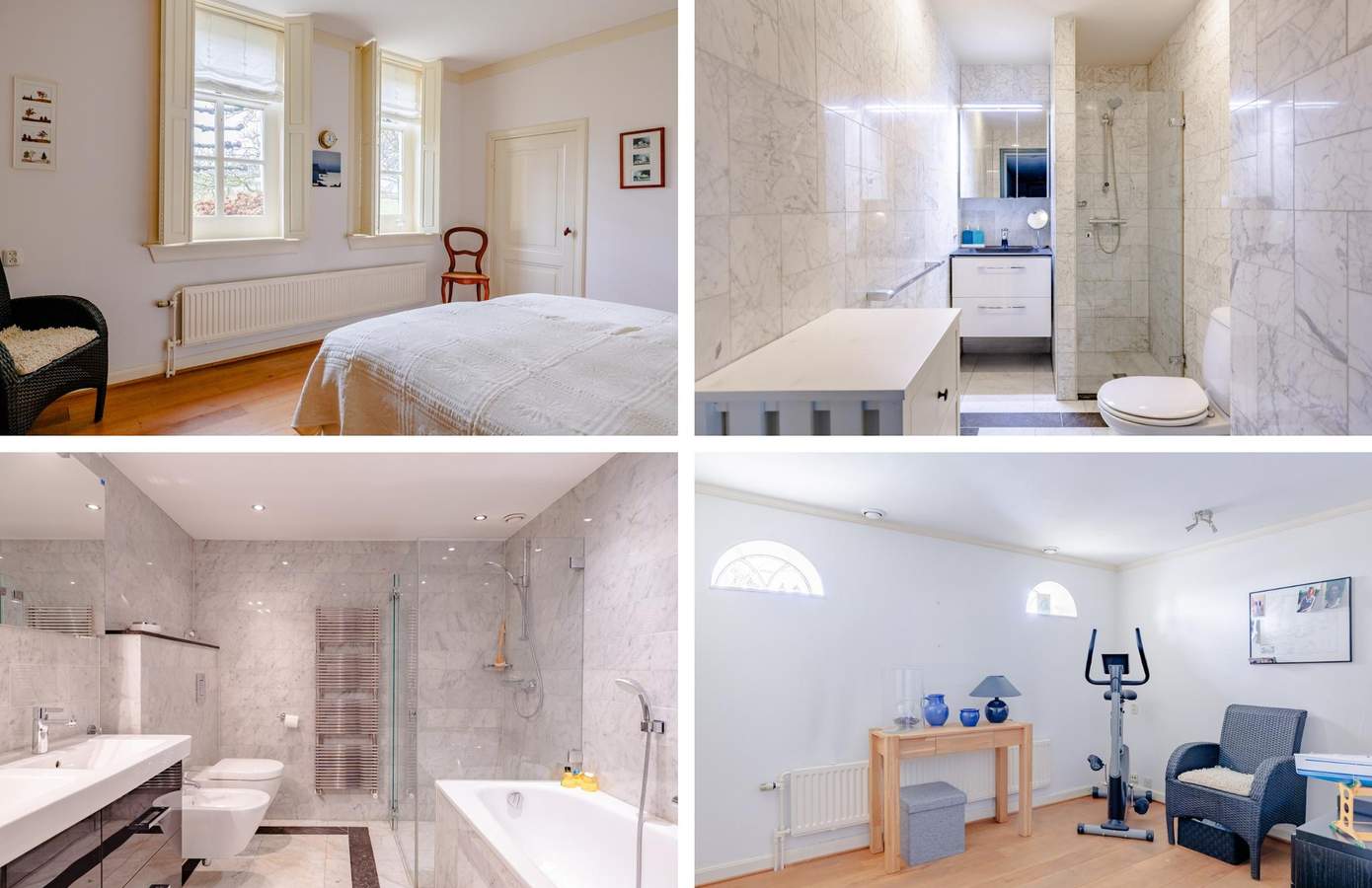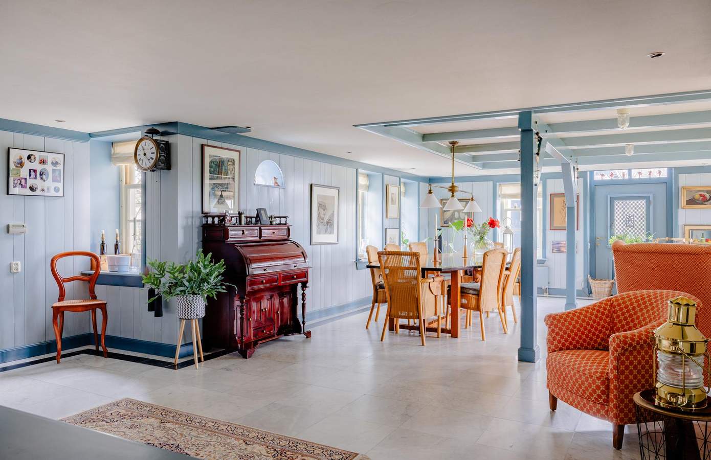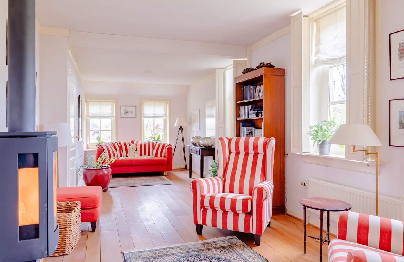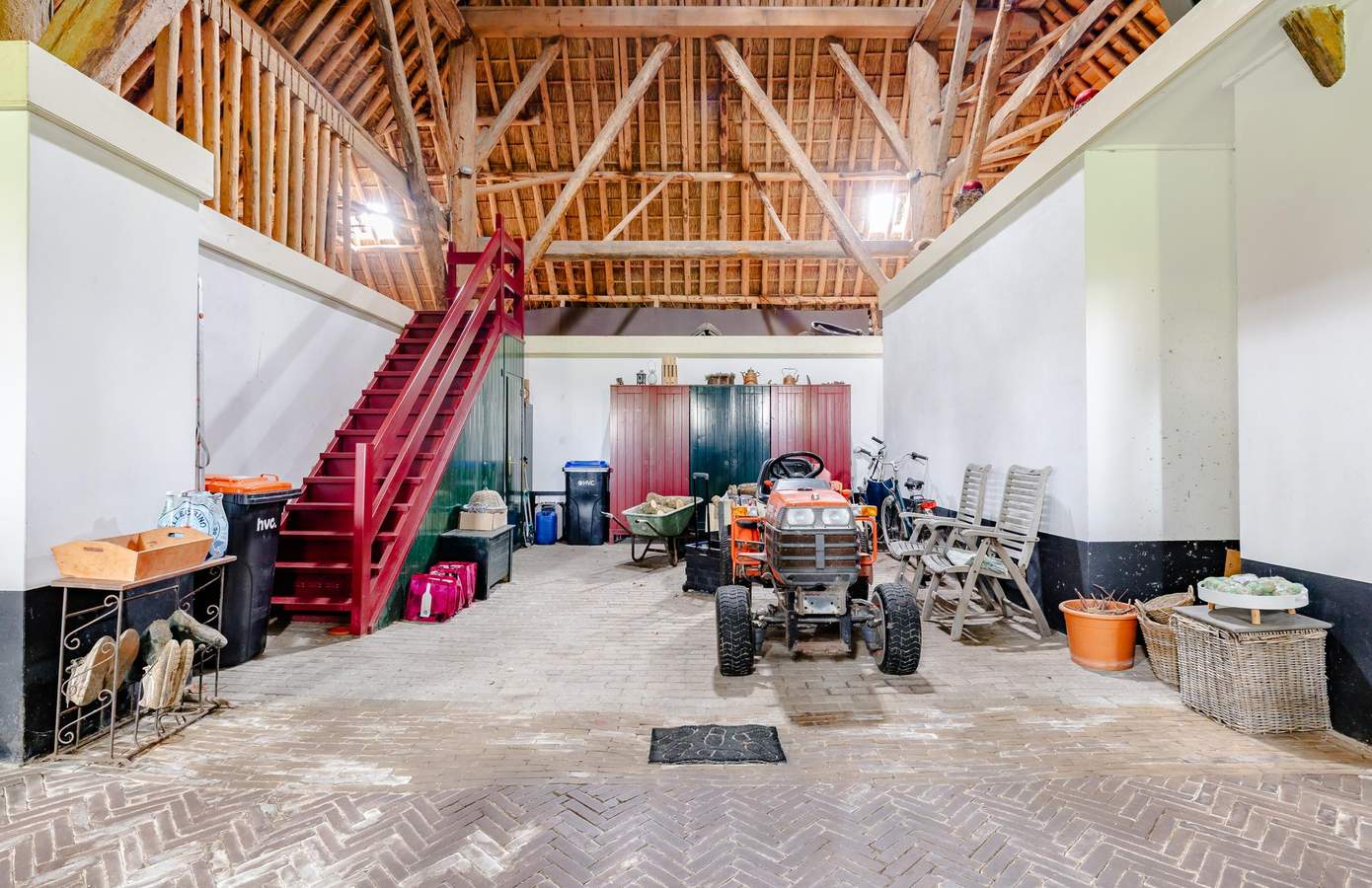 De lichte natuurstenen vloer met donkere bies, massieve paneeldeuren in zachte blauwtinten en massieve kozijnen geven karakter en verwijzen naar de historische stijl van de stolp. Vanuit de hal loopt u door naar het royale woongedeelte. De eetkamer vormt het centrale middelpunt, met zichtlijnen naar de woonkamer. In de zitkamer aan de voorzijde zorgen brede houten vloerdelen, hoge ramen met binnenluiken en een vrijstaande houtkachel voor warmte en sfeer. De keuken is uitgevoerd in warm hout met een donker hardstenen werkblad. U vindt hier diverse inbouwapparatuur zoals een inductiekookplaat, afzuigkap, vaatwasmachine, twee koelkasten, een oven en een steamer. Aansluitend is er de bijkeuken waar ook de wasmachine-/drogeropstelling is. Op de begane grond zijn tevens twee slaapkamers en twee in marmer uitgevoerde badkamers. Daarnaast is er nog eens een indrukwekkende 206 m² aan vrij in te delen ruimte, die u kunt aanpassen aan uw persoonlijke behoeften en creatieve visie. Vanuit de dars heeft u zicht op de ziel van de stolp: het authentieke houten vierkant en de robuuste gebinten onder het rieten dak. Een indrukwekkend geheel waarin historie en constructie samenkomen.